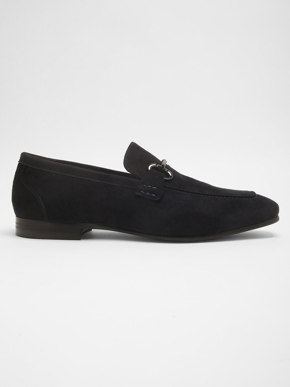When you find yourself stuck in a dilemma deciding between attire too formal or too casual, this blue suede leather loafer will help you strike just the right balance with the metal horse-bit detail.