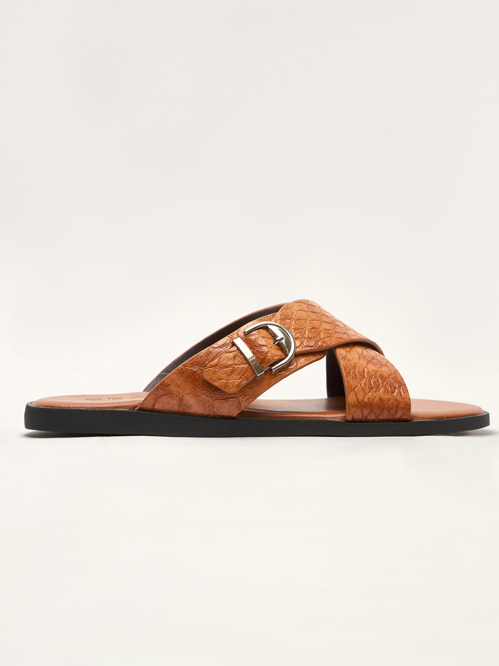 Tan Synthetic Leather Sandals with Crocodile Texture and Buckle