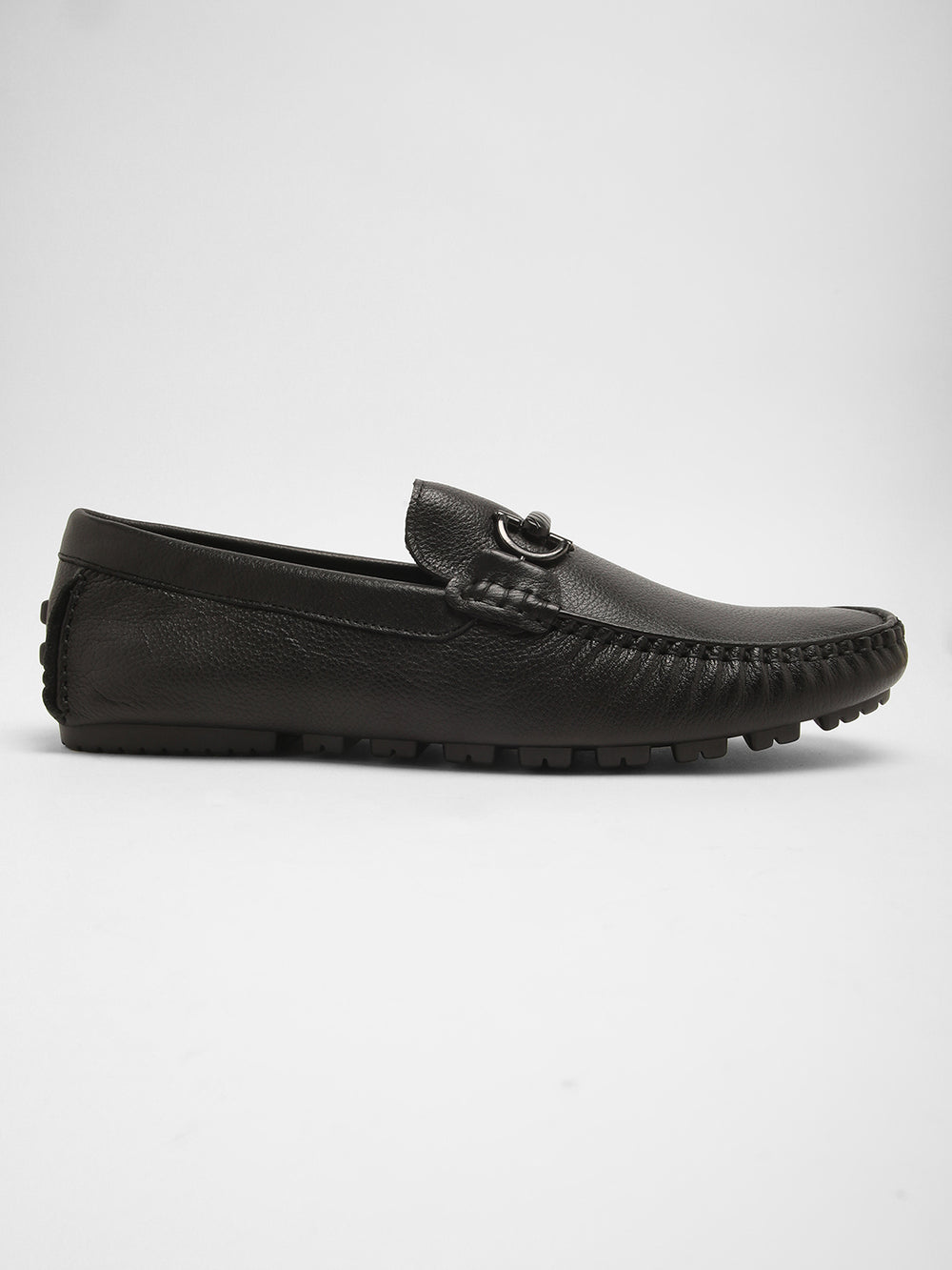 The amazing styling of this pair of black textured leather loafers speaks volumes about your classy sense of fashion featuring an excellent closure and the metal horsebit detail. It prevents your feet from any chafe and lets you move around with ease with its lightweight,