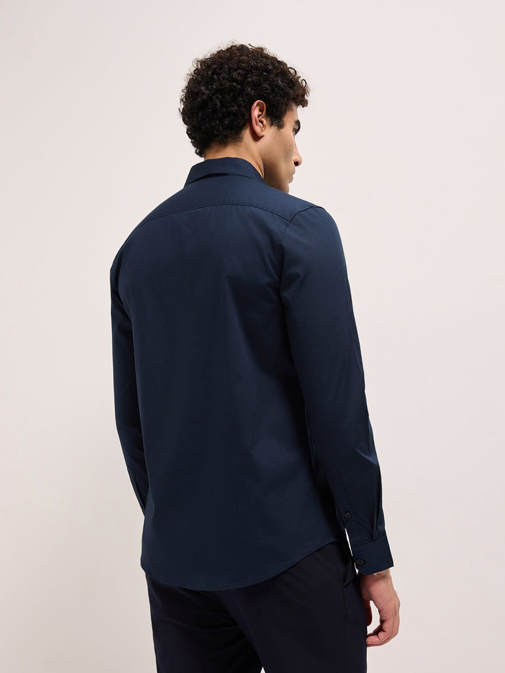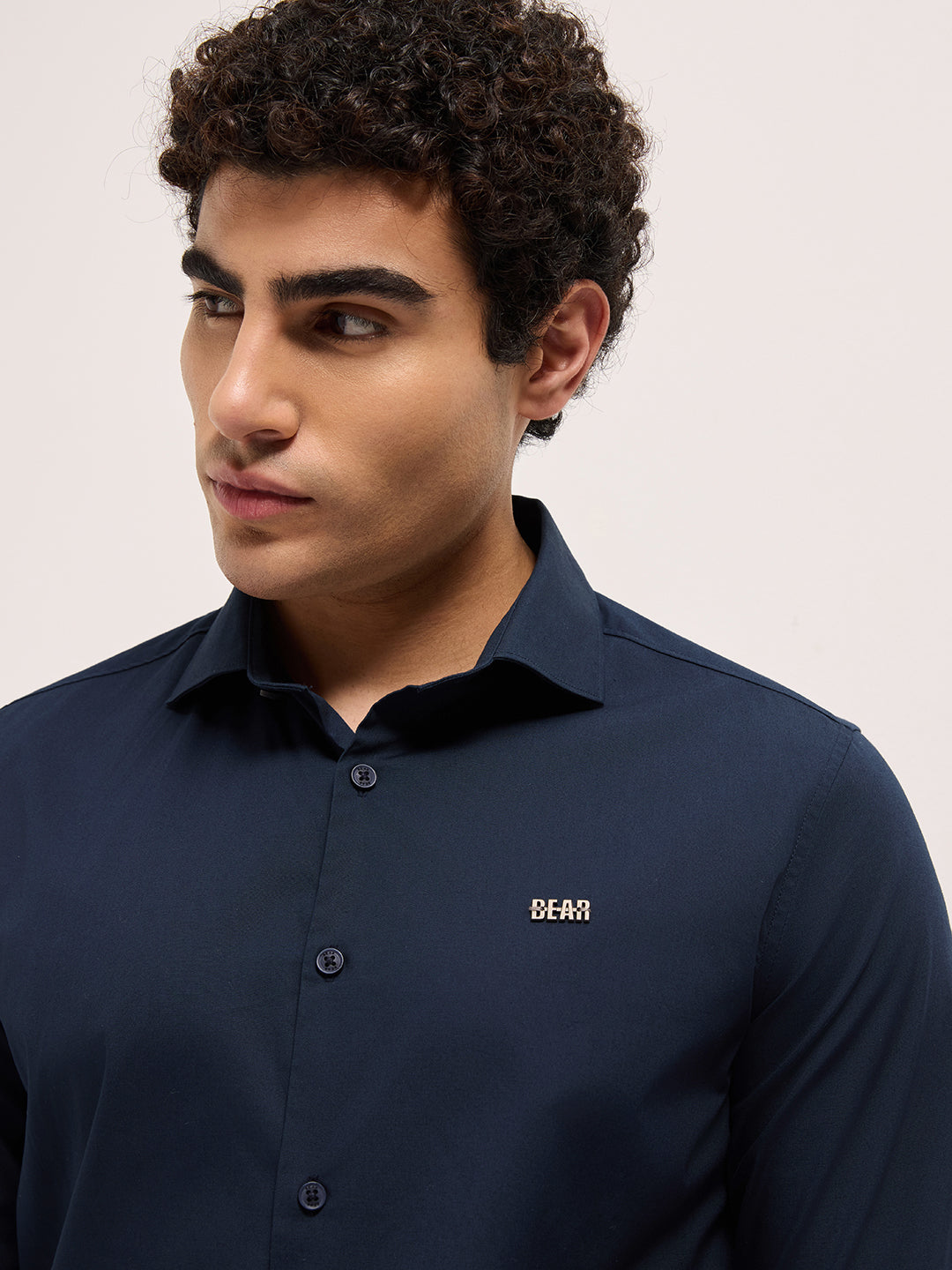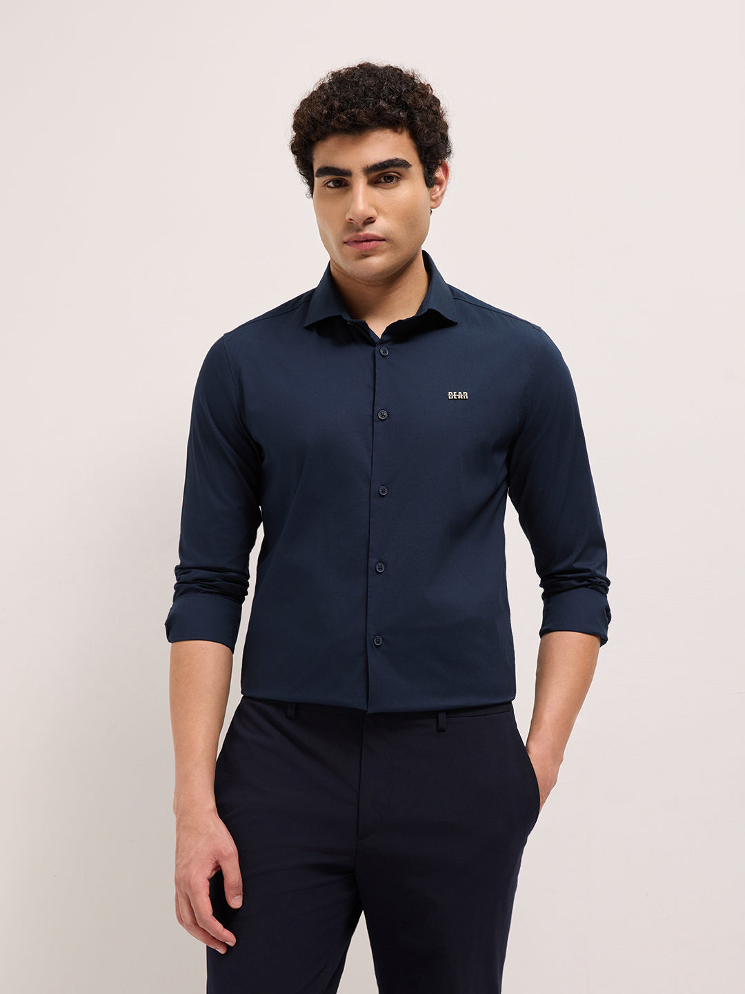 Shirt Navy Blue Solid Tailored Fit Cotton Formal Shirt with Metallic Logo Branding