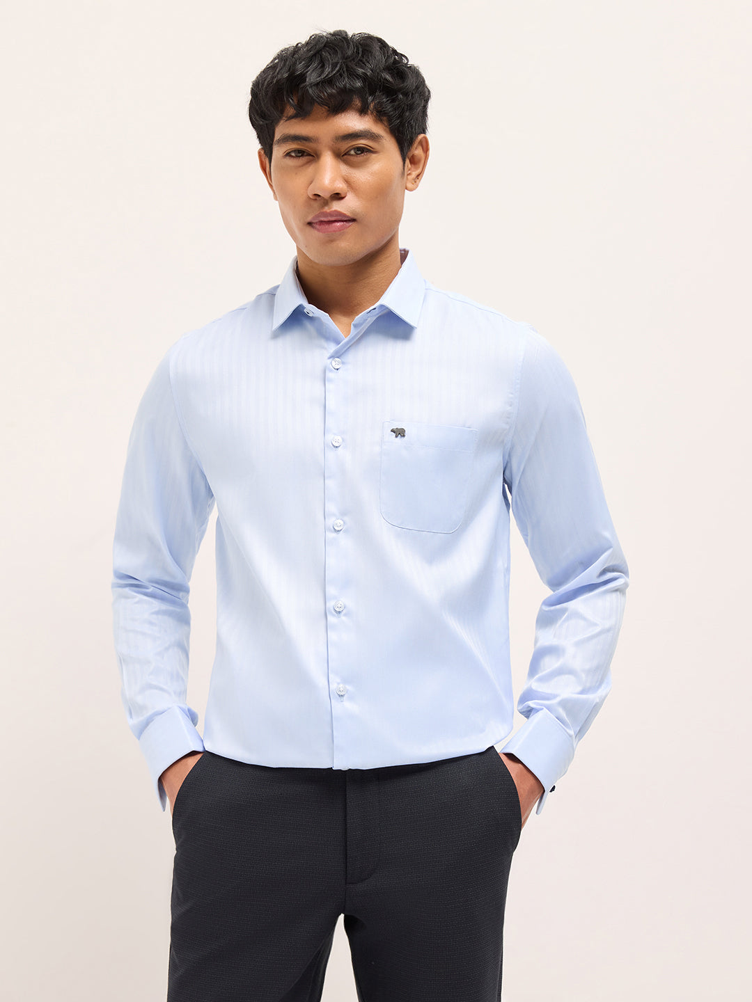 Blue Herringbone Striped Tailored Fit Formal Shirt with French Cuffs