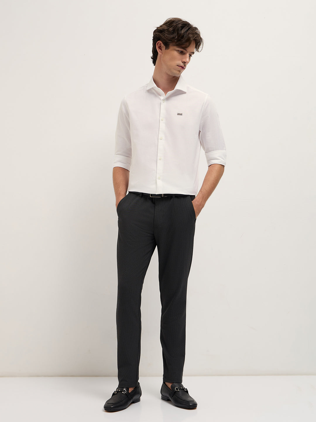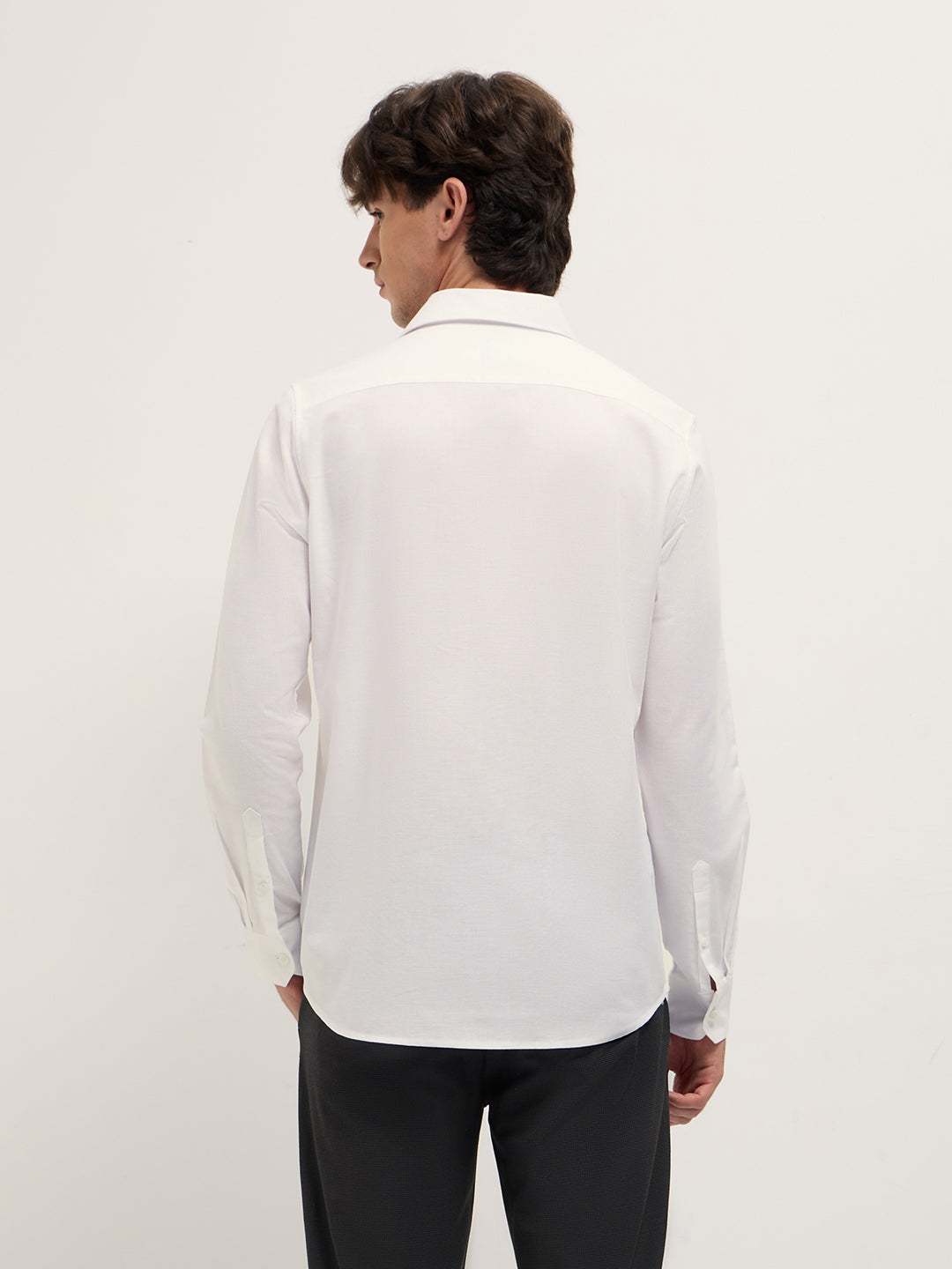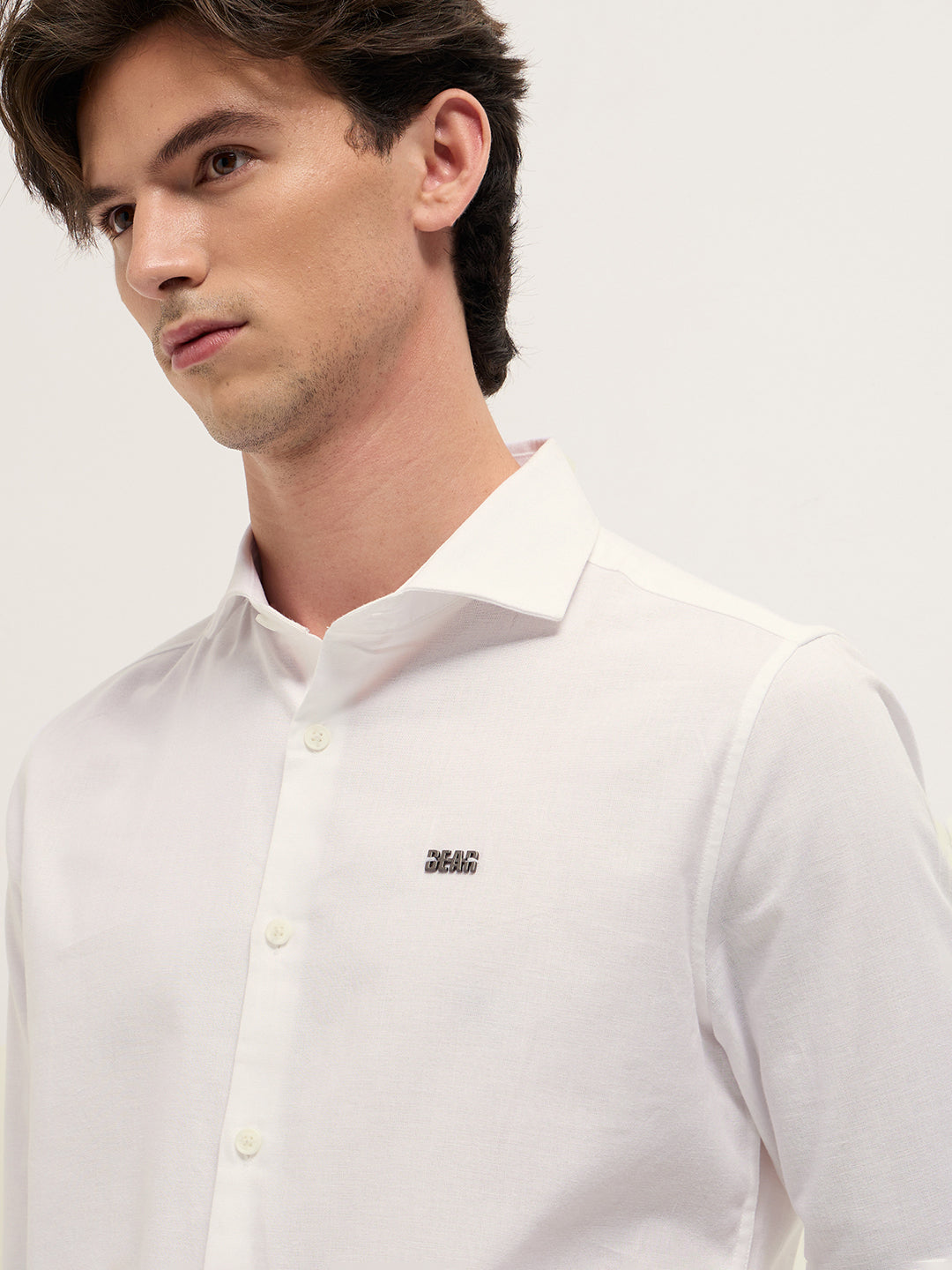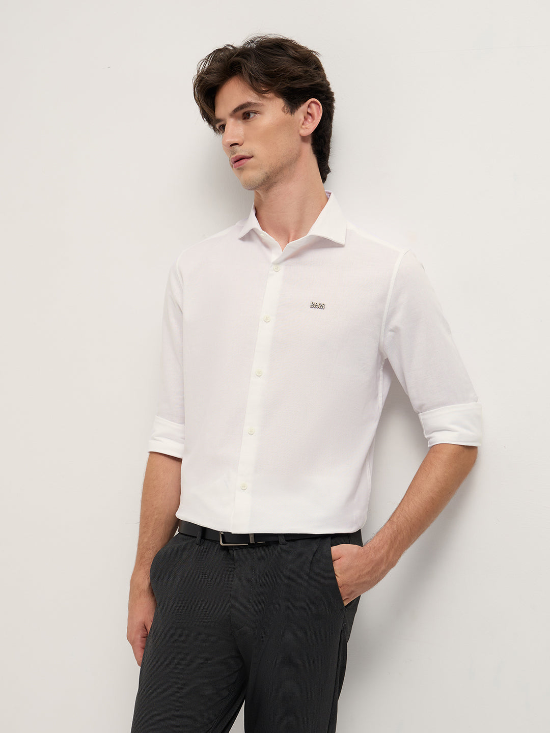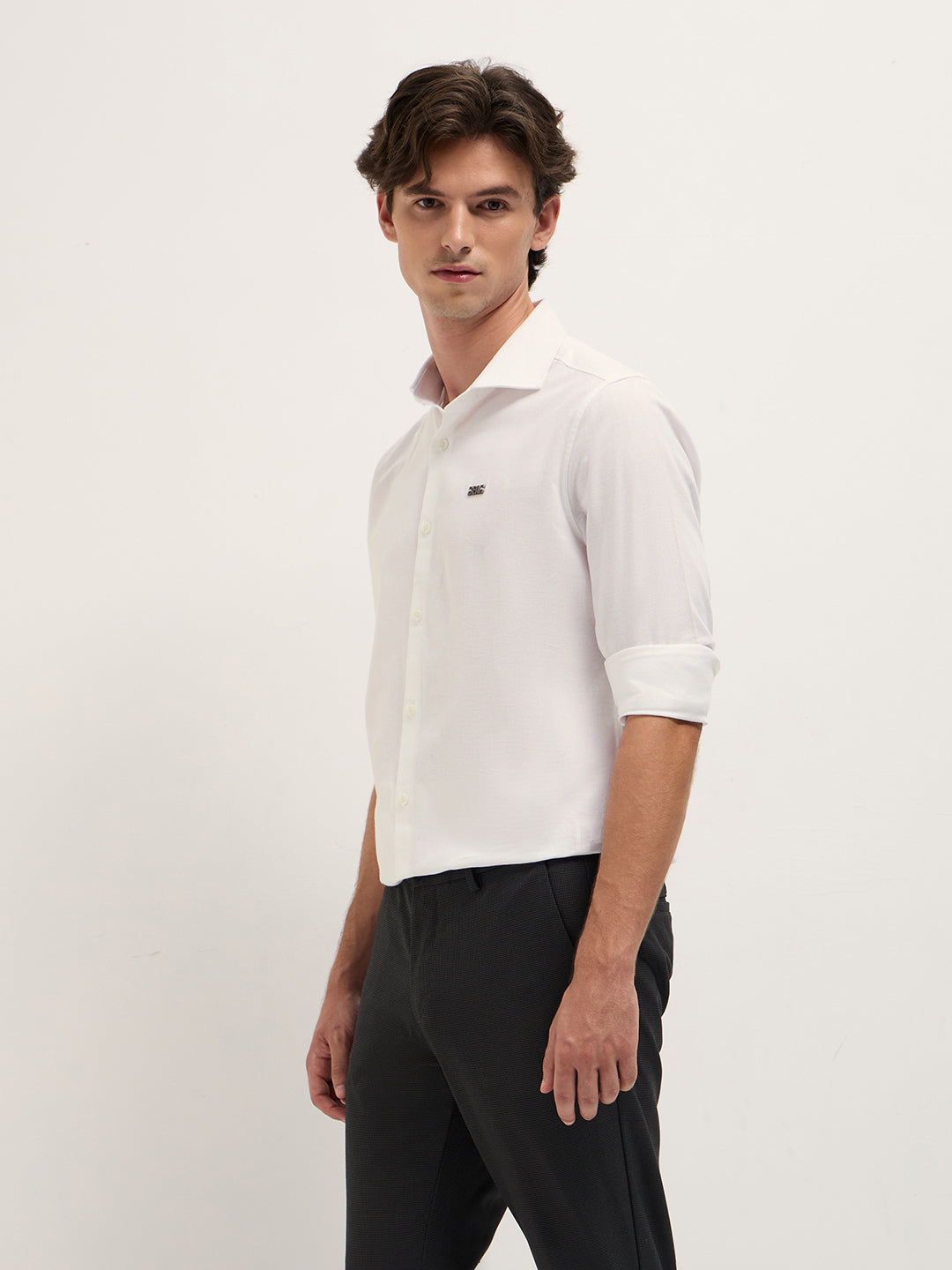 White Solid Tailored Fit Cotton Formal Shirt with Metallic Logo Branding