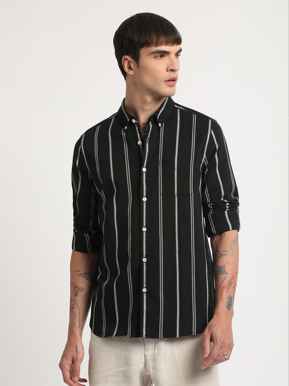 Shop Men Black Striped Slim Fit Cotton Casual Shirt Online