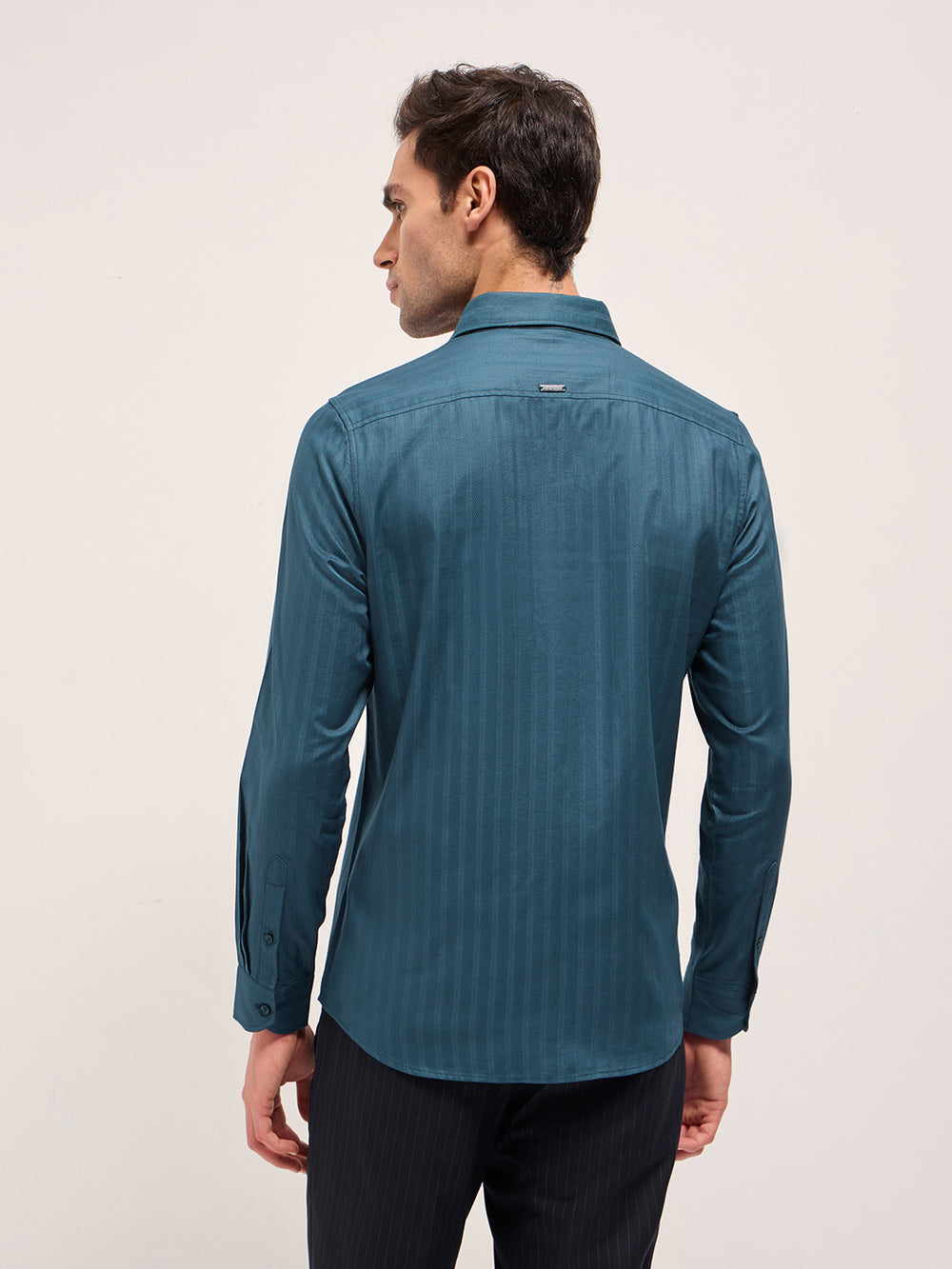 Teal Blue Cotton Woven Stripes Design Tailored Fit Formal Shirt
