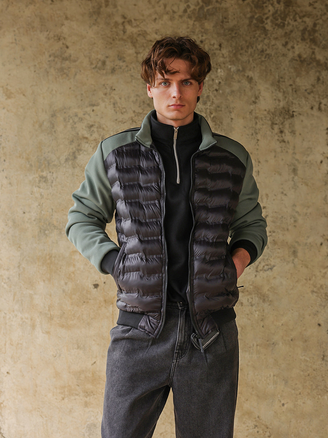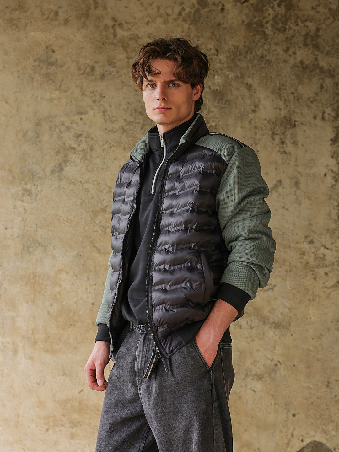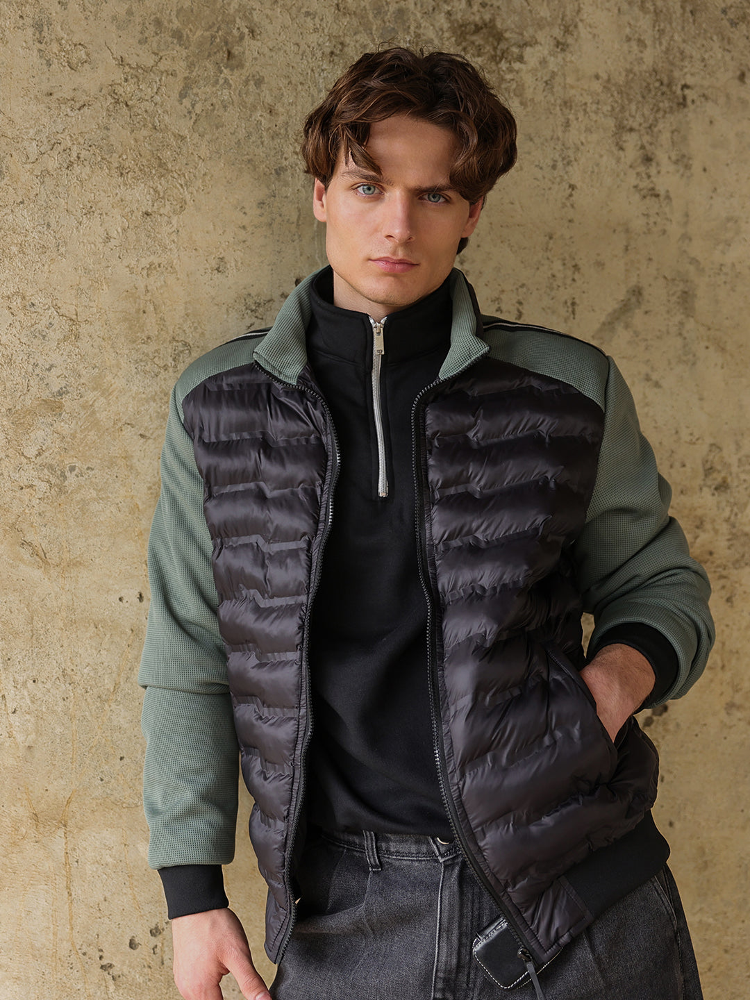 - Sleeves: Full-length waffle-textured sleeves with contrast shoulder stripes
