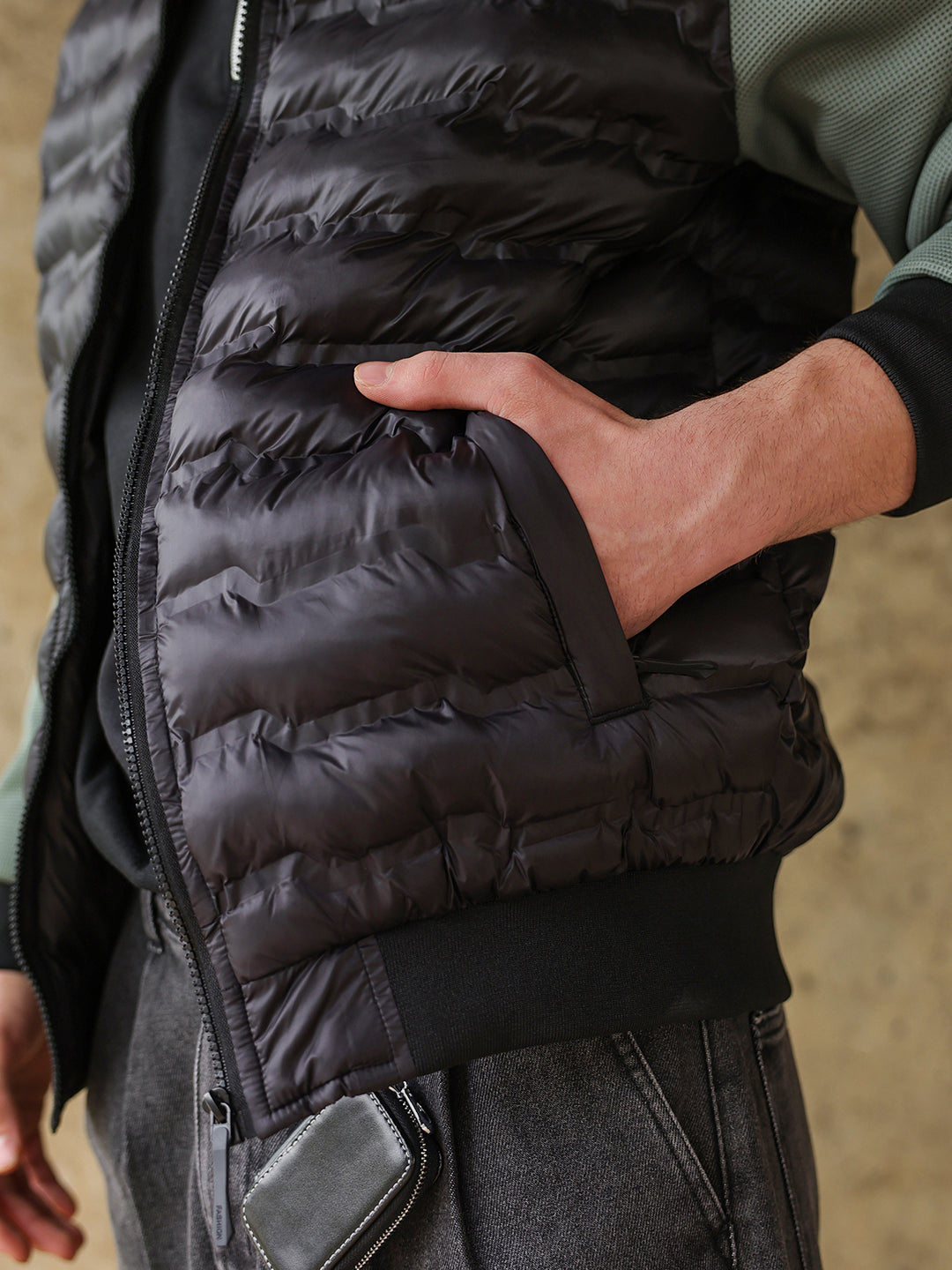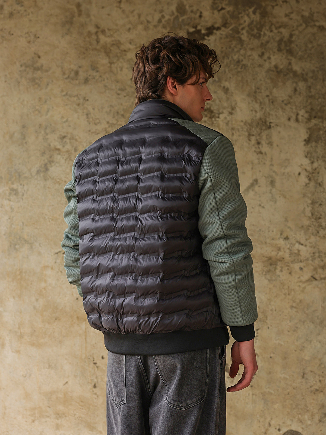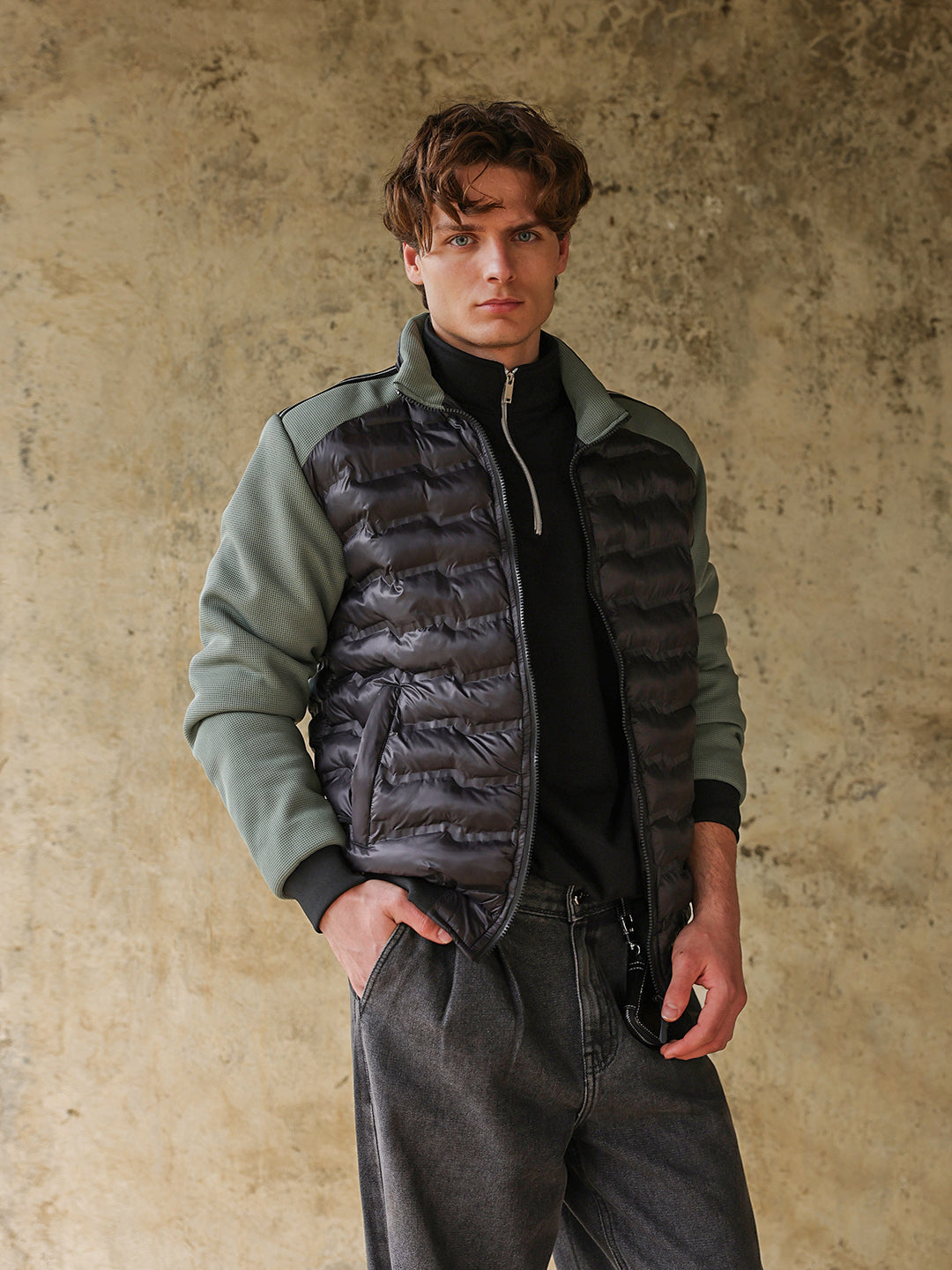 - Sleeves: Full-length waffle-textured sleeves with contrast shoulder stripes