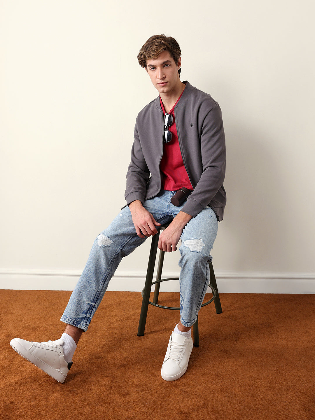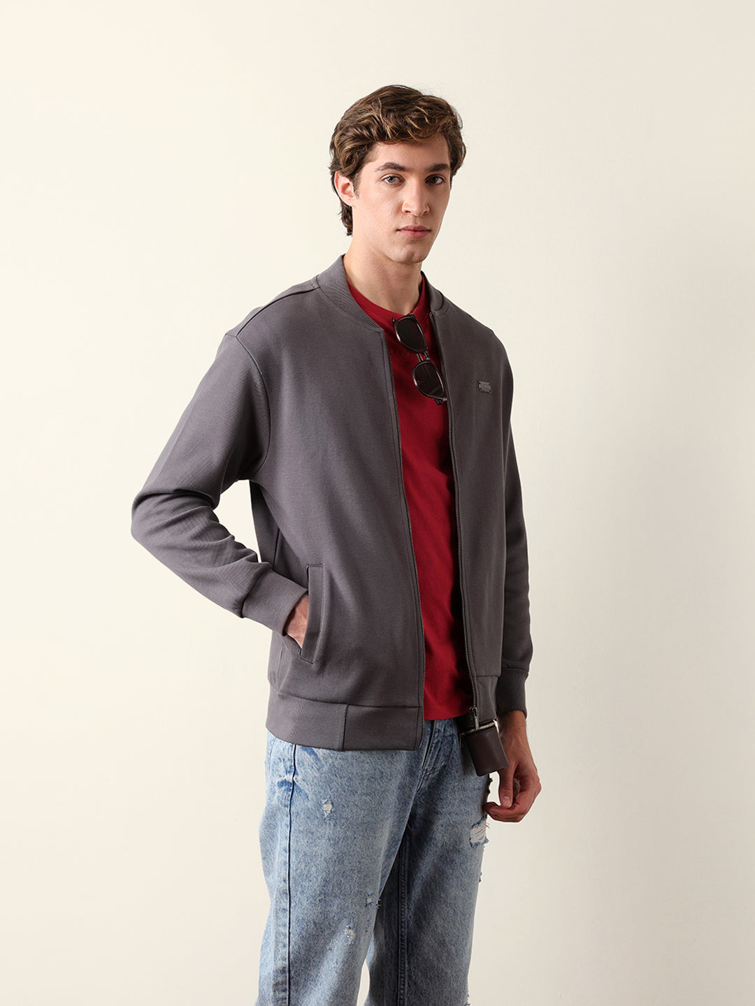 Grey Relax Fit Mock Neck Jacket with Zipper Closure – Classic Solid Design