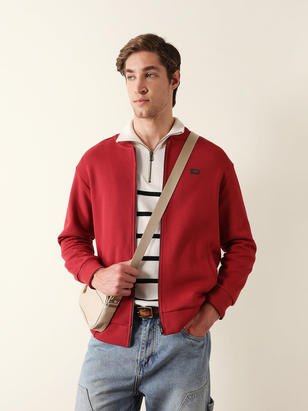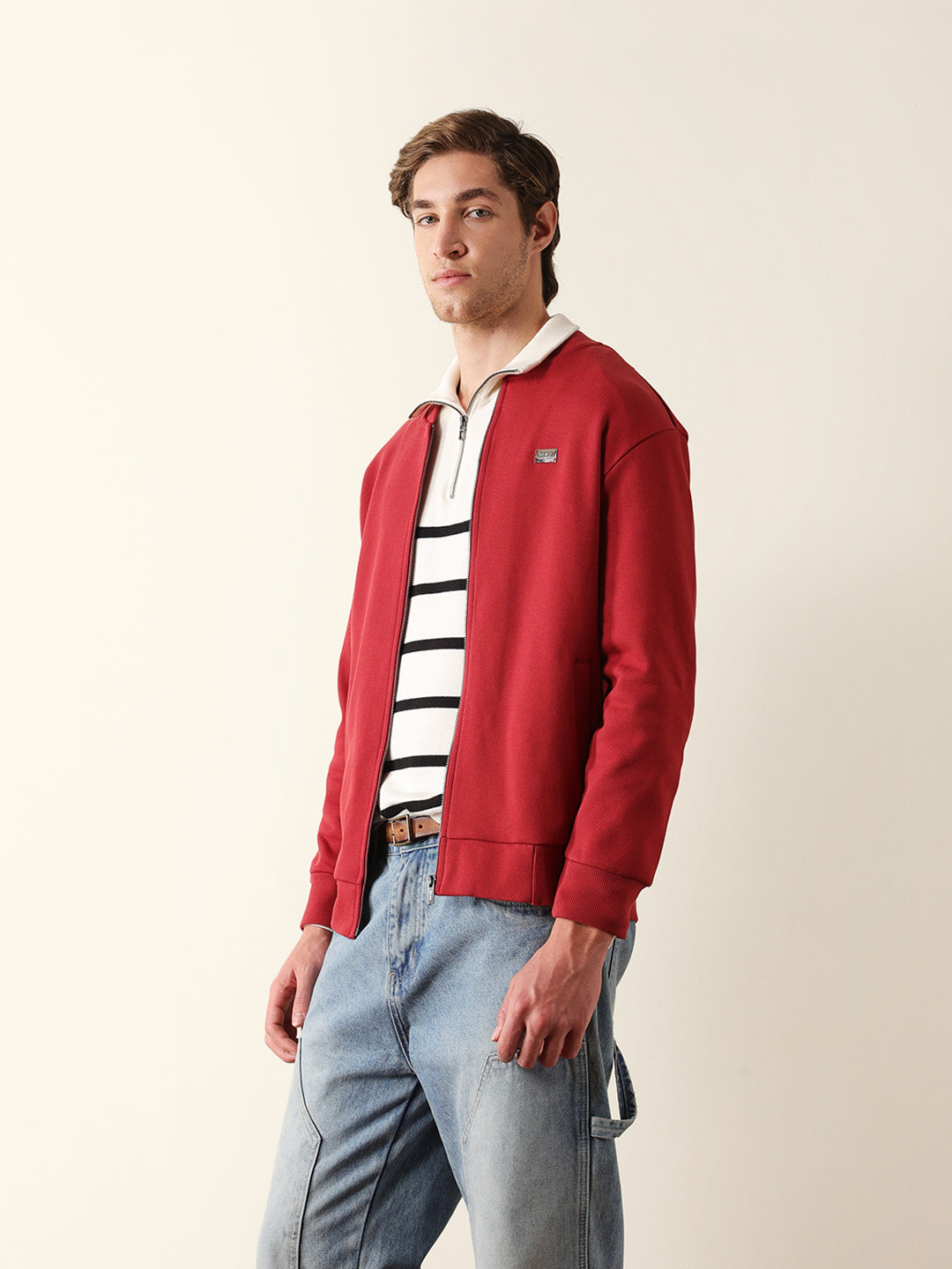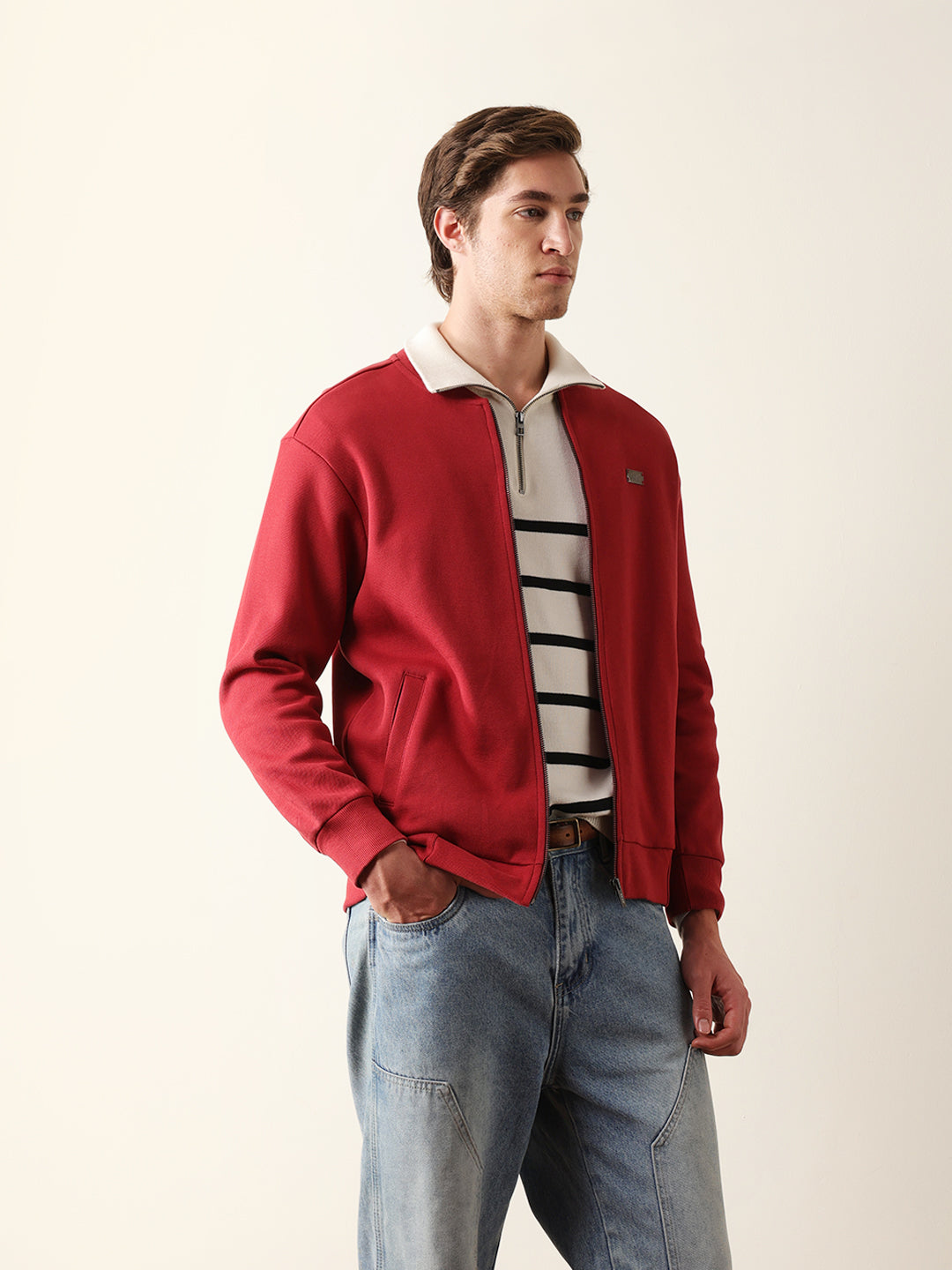Red Relax Fit Mock Neck Jacket with Zipper Closure – Classic Solid Design