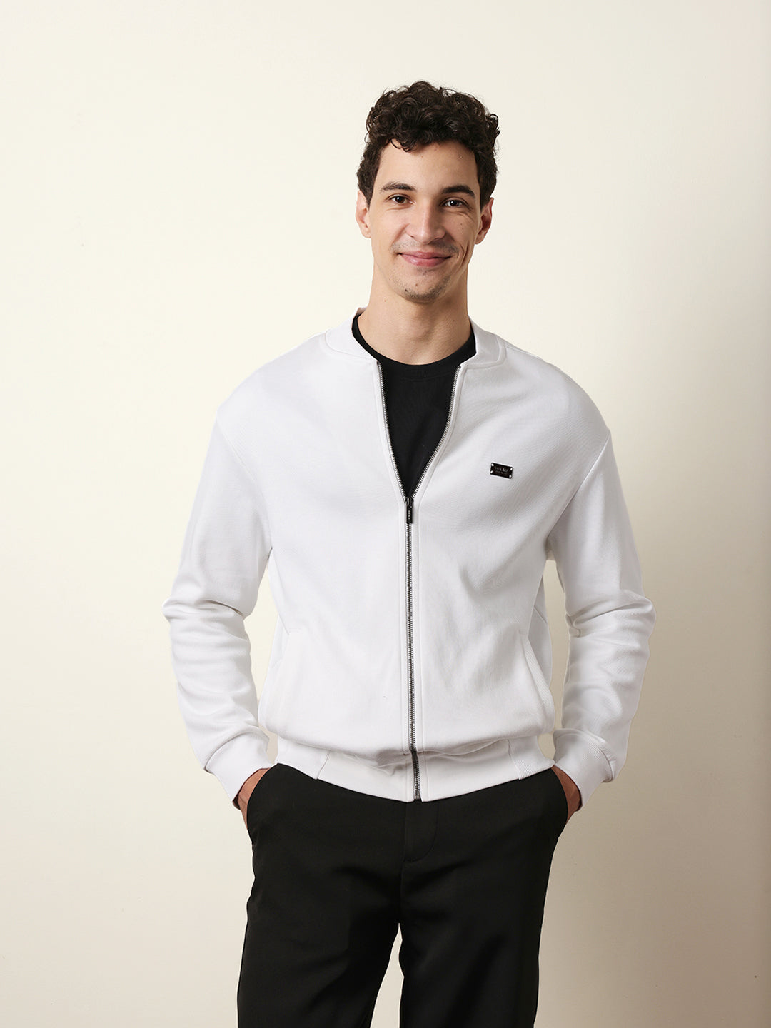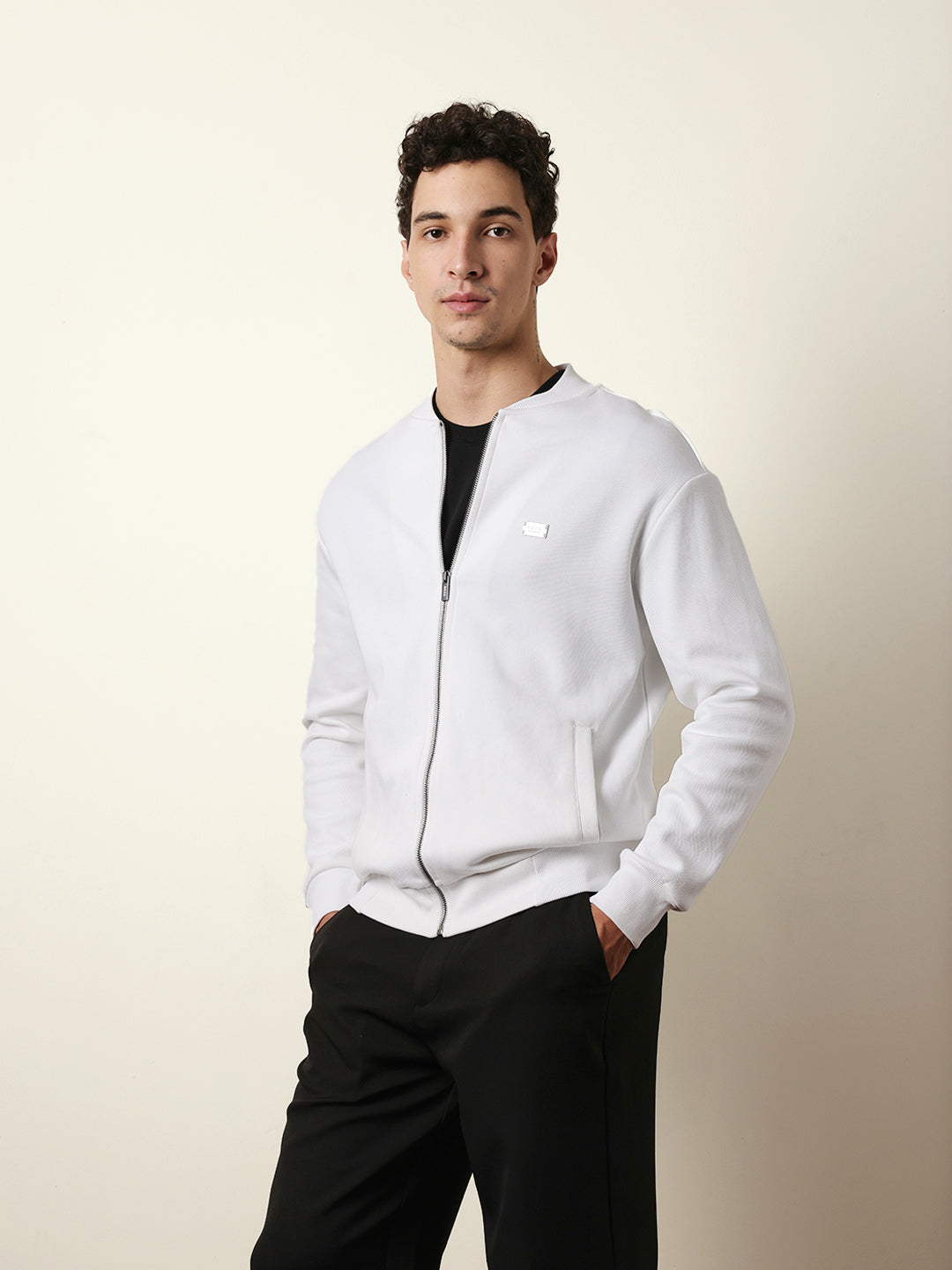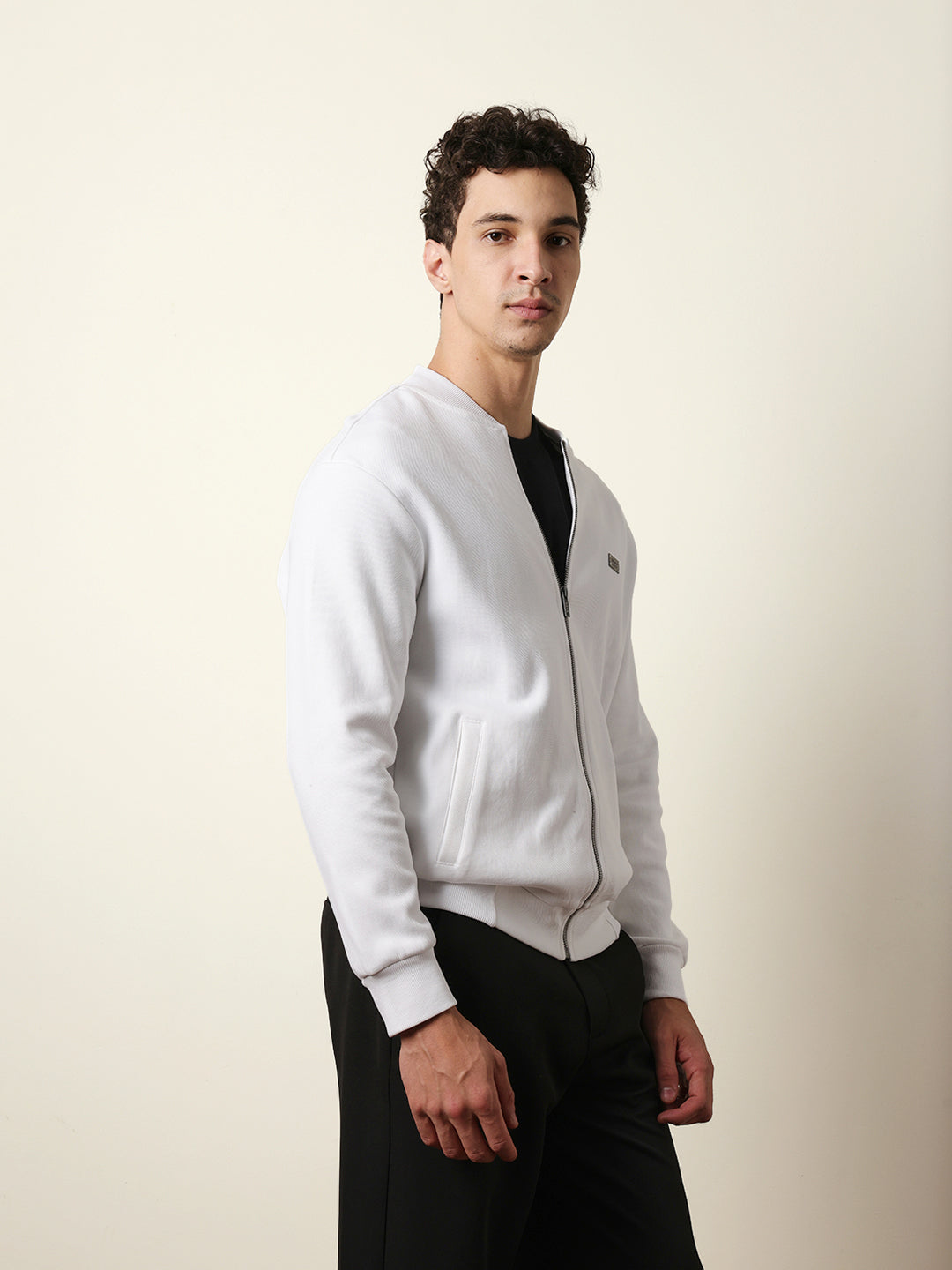 White Relax Fit Mock Neck Jacket with Zipper Closure – Classic Solid Design