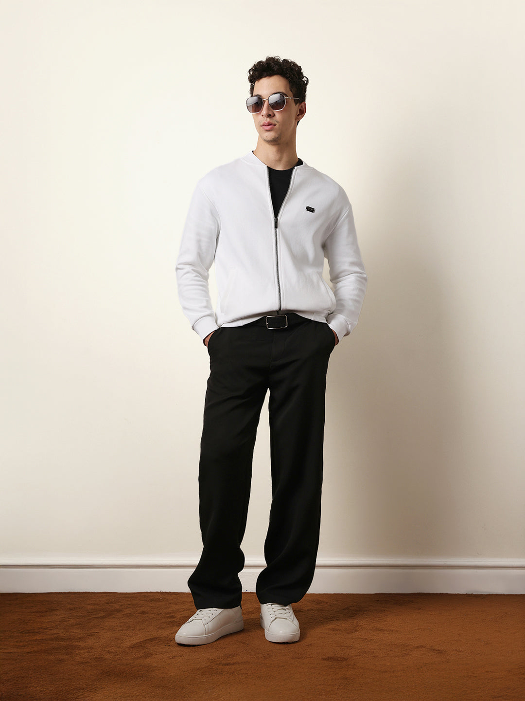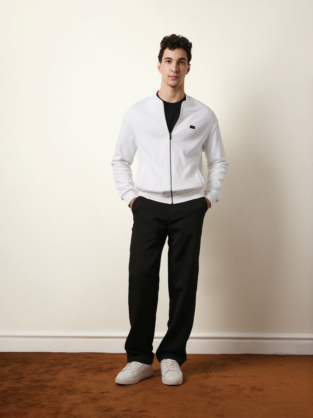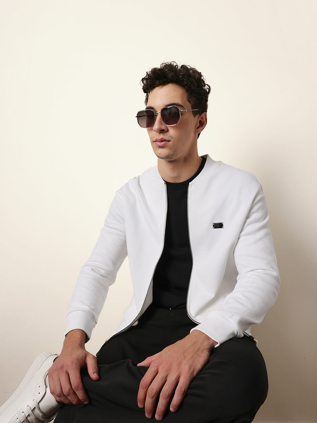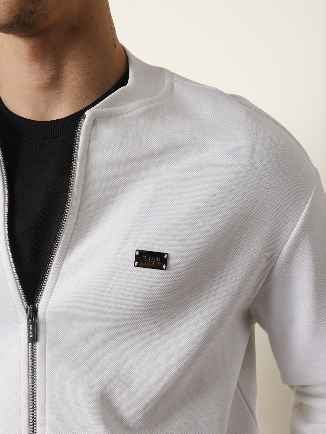 White Relax Fit Mock Neck Jacket with Zipper Closure – Classic Solid Design