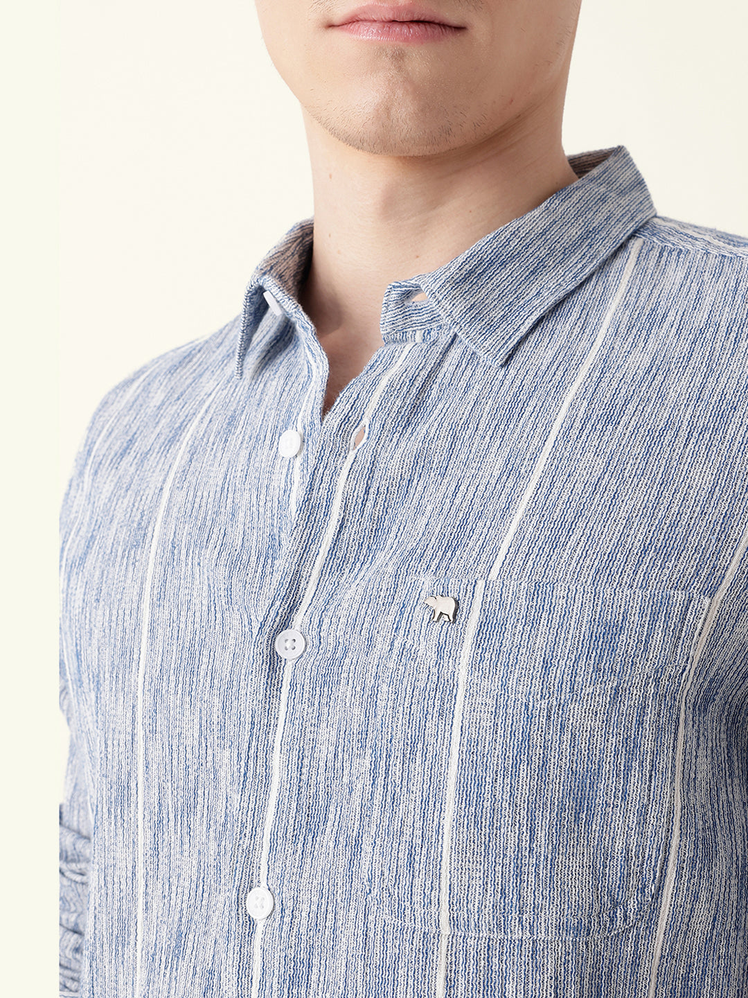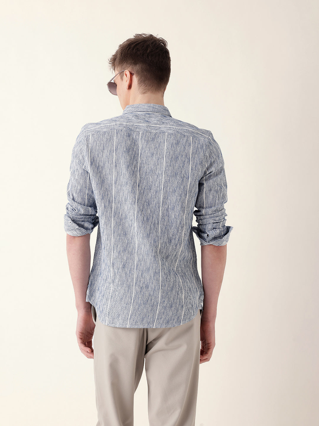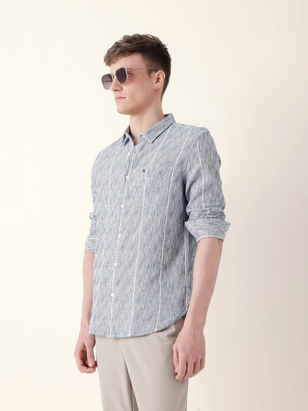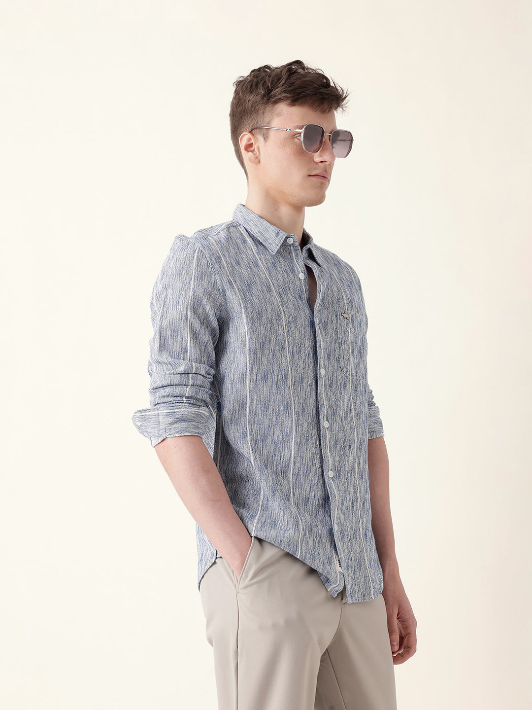 Blue Textured Vertical Striped Slim Fit Casual Shirt