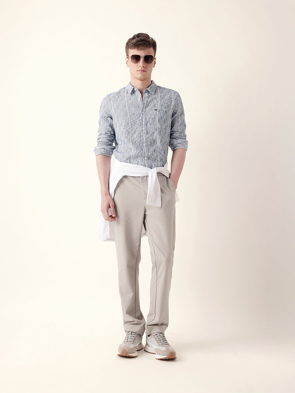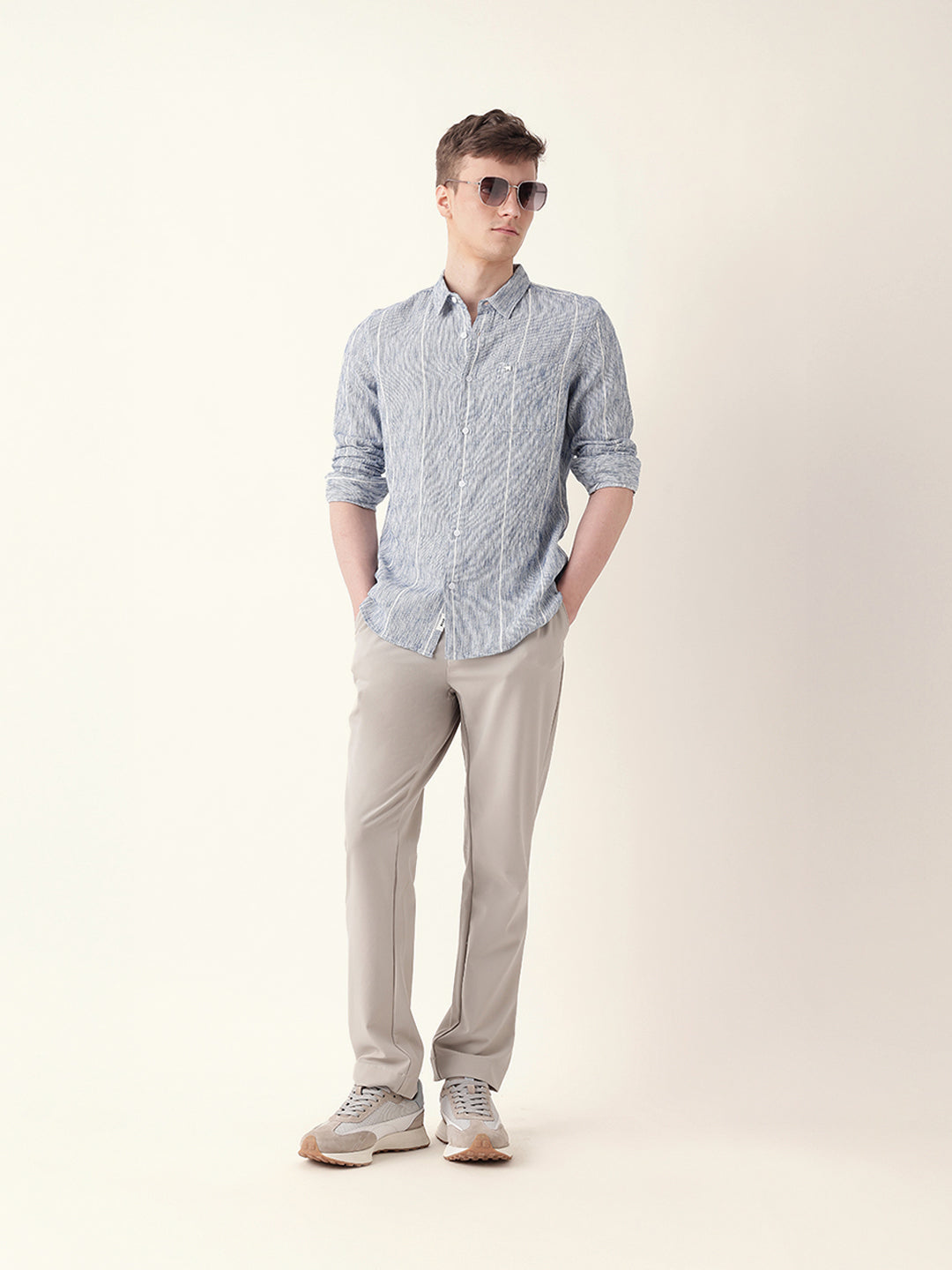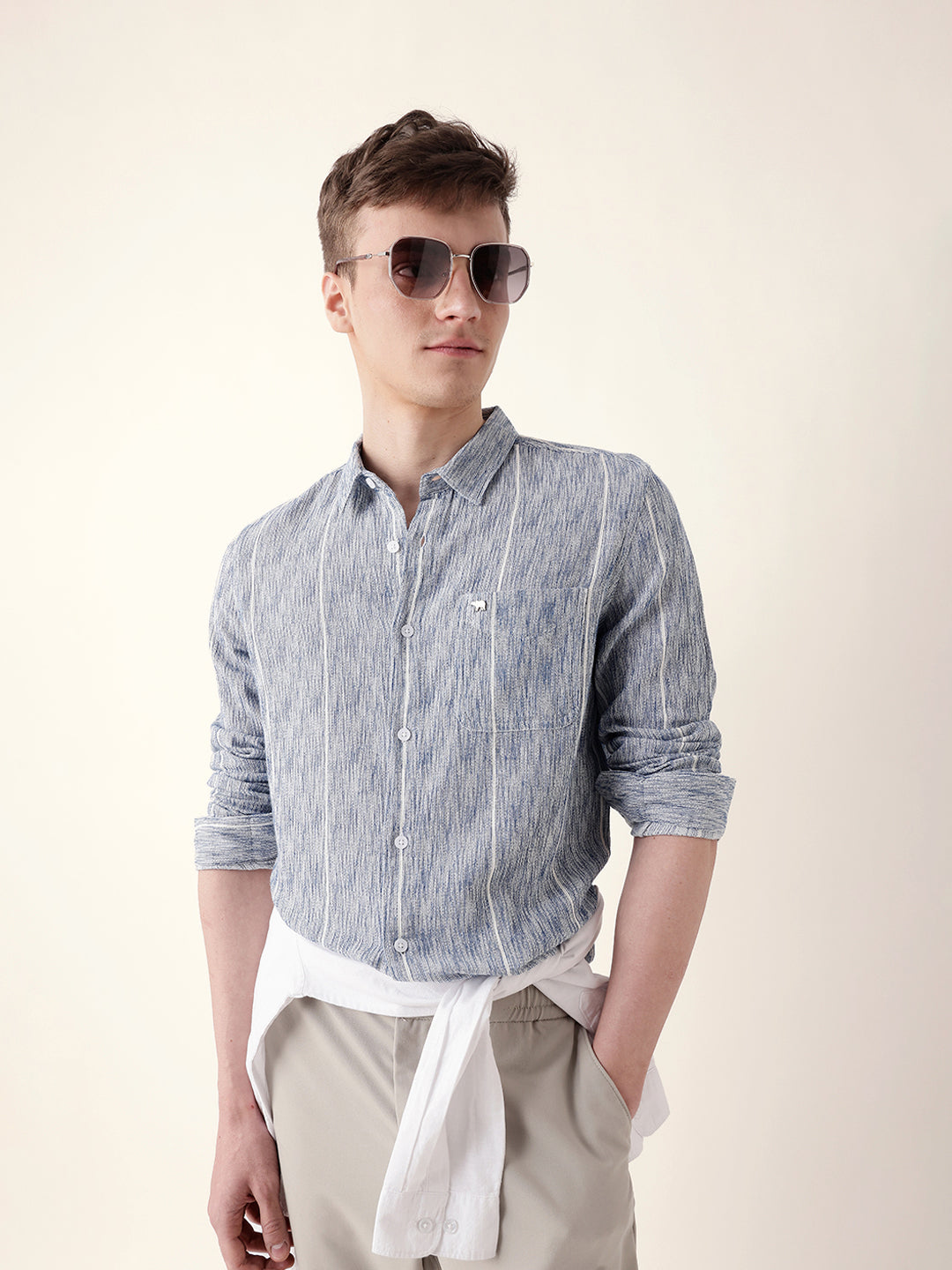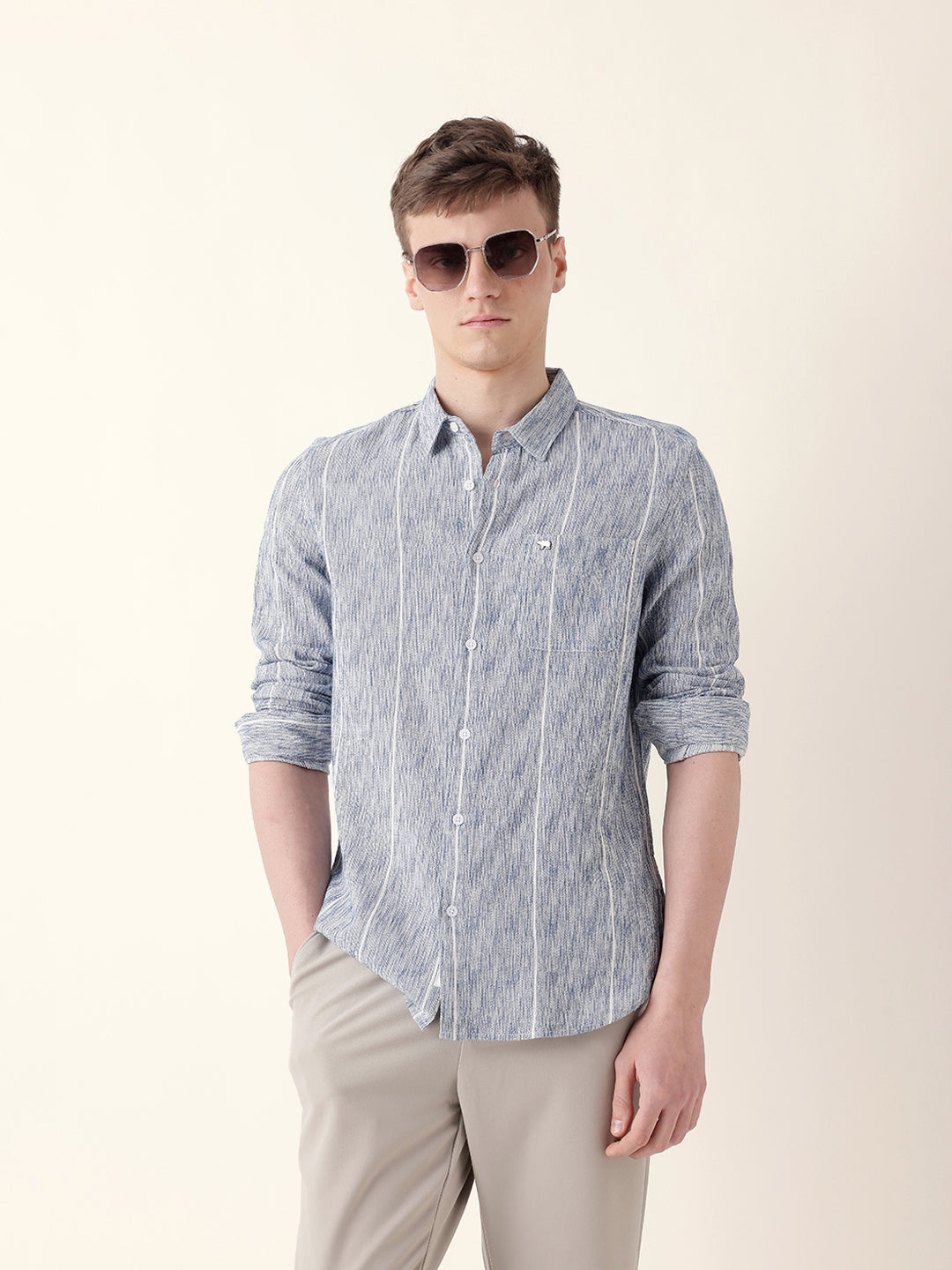 Blue Textured Vertical Striped Slim Fit Casual Shirt