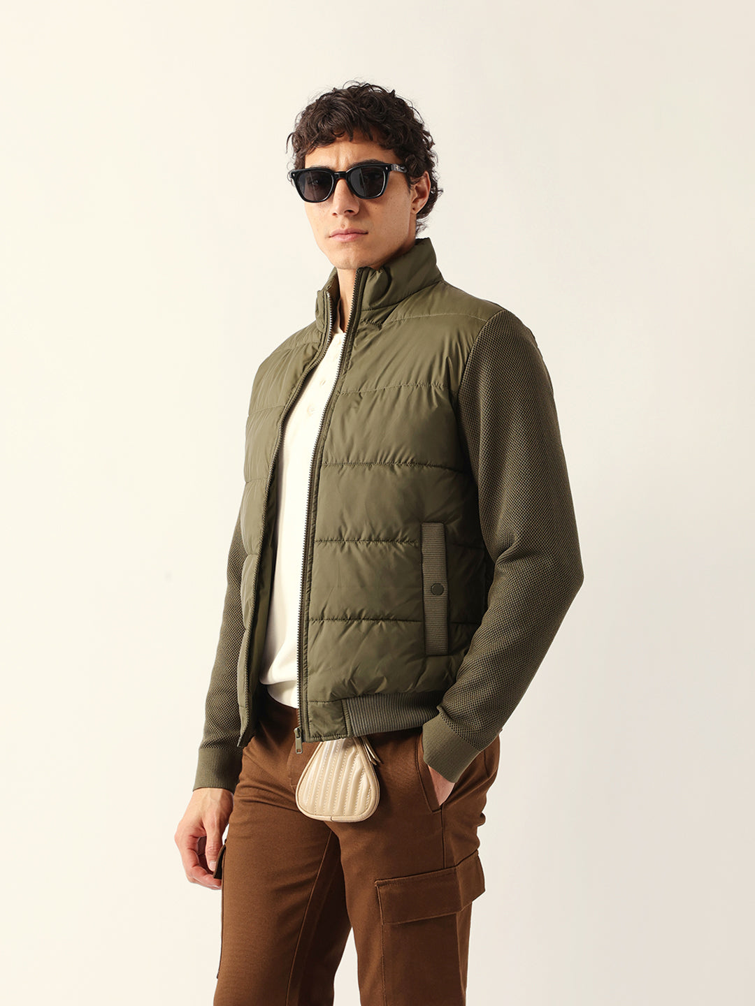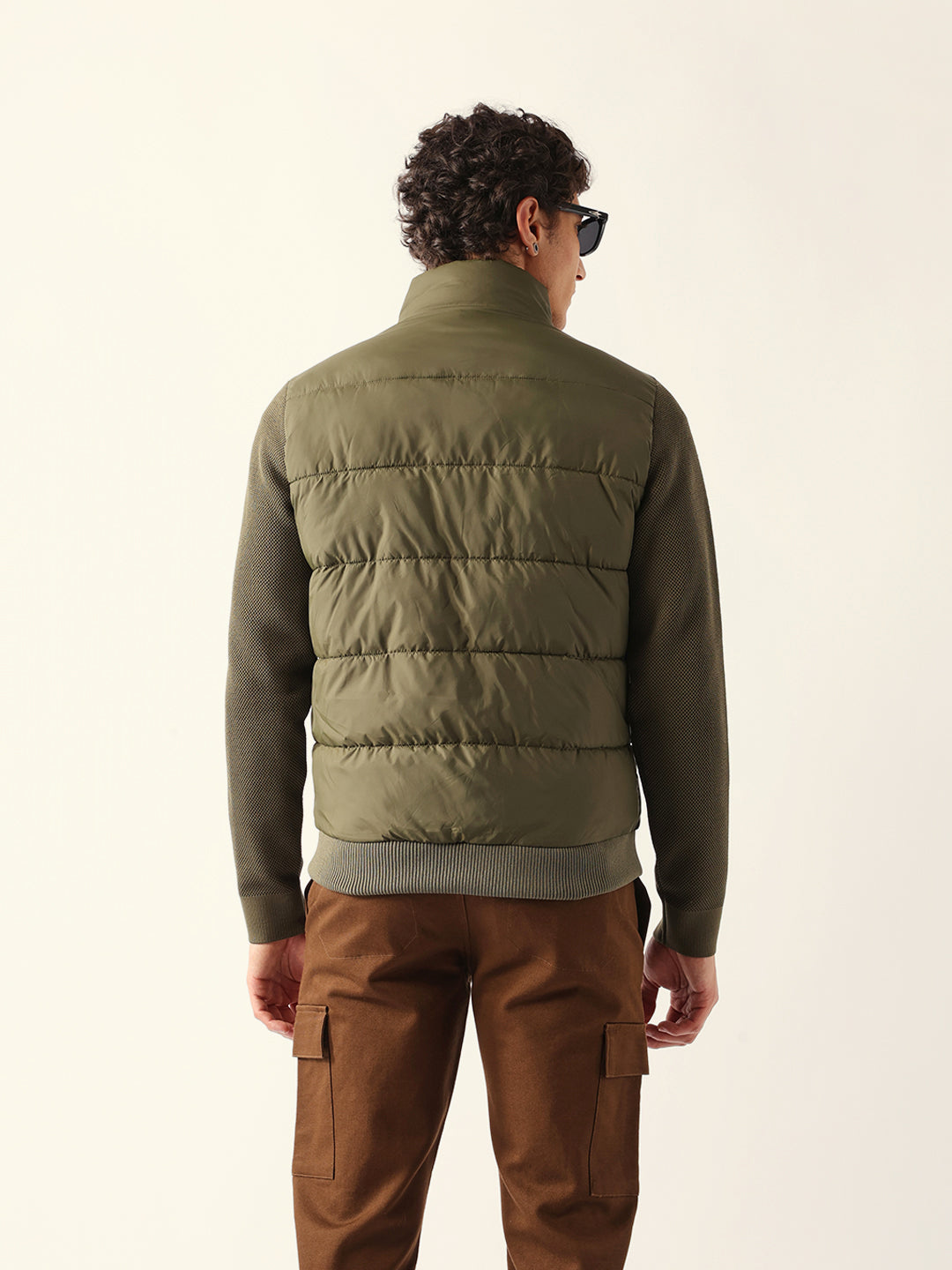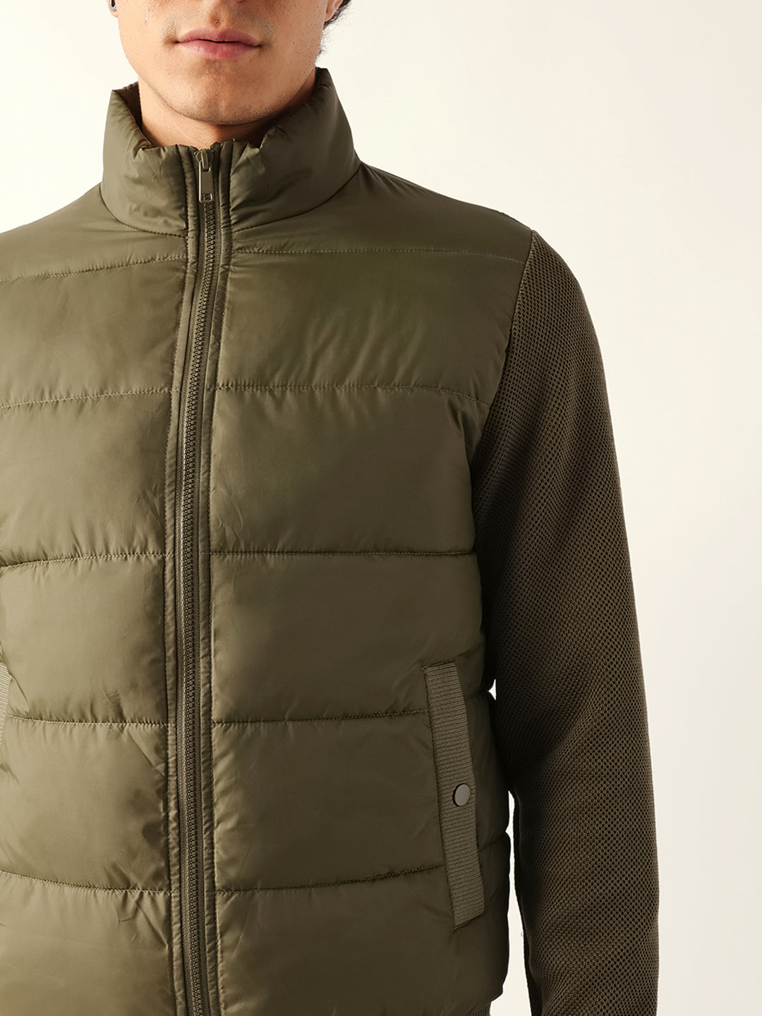 Olive Regular Fit Puffer Jacket with High Neck and Textured Knitted Sleeves