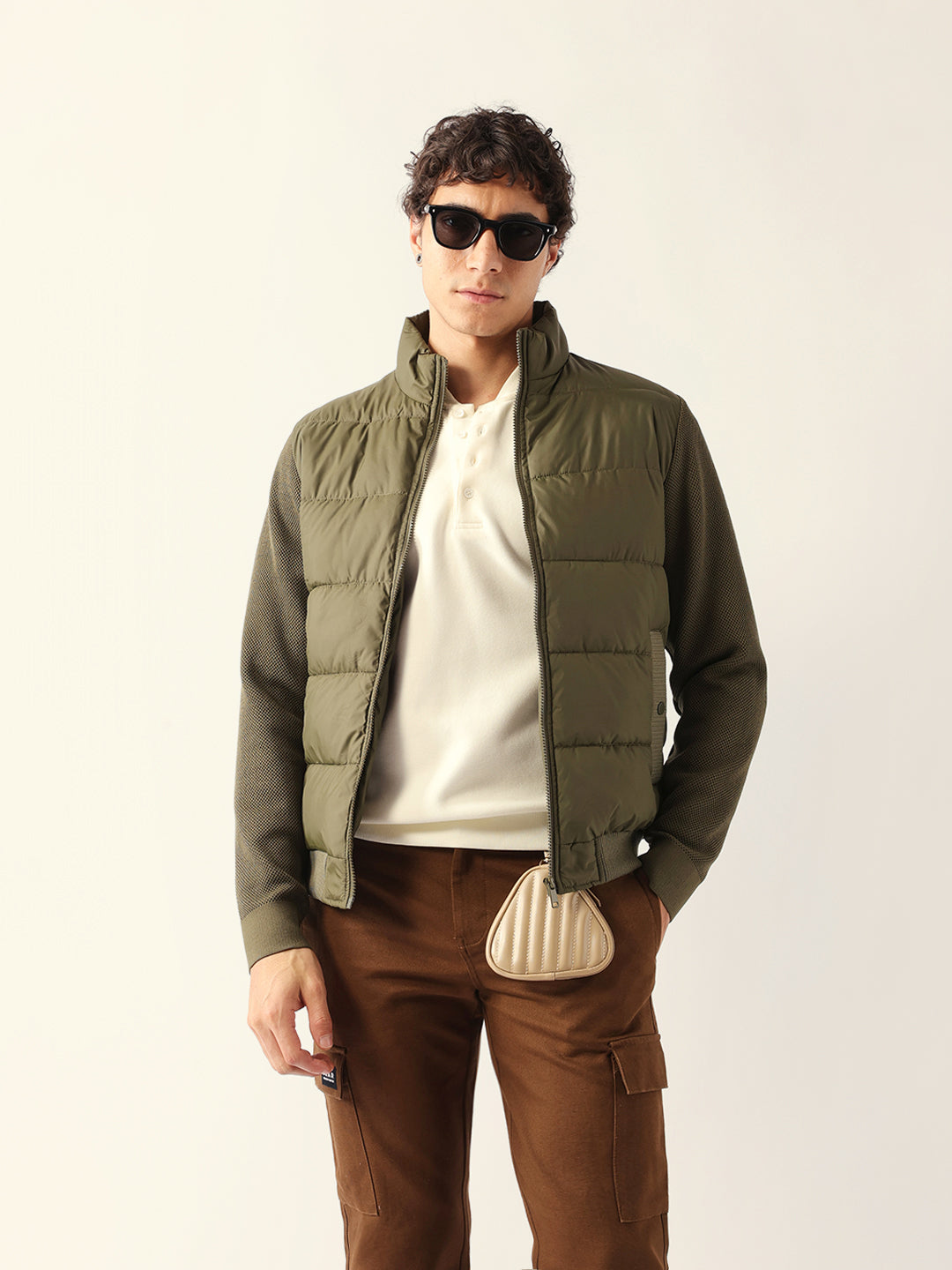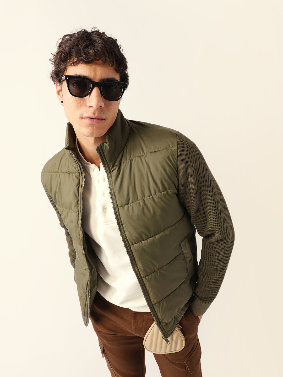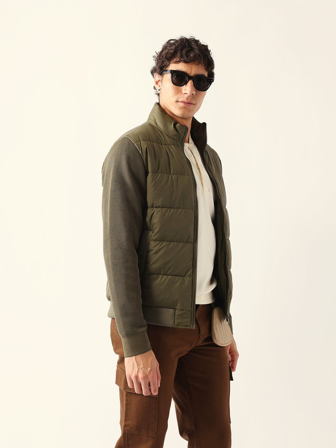 Olive Regular Fit Puffer Jacket with High Neck and Textured Knitted Sleeves