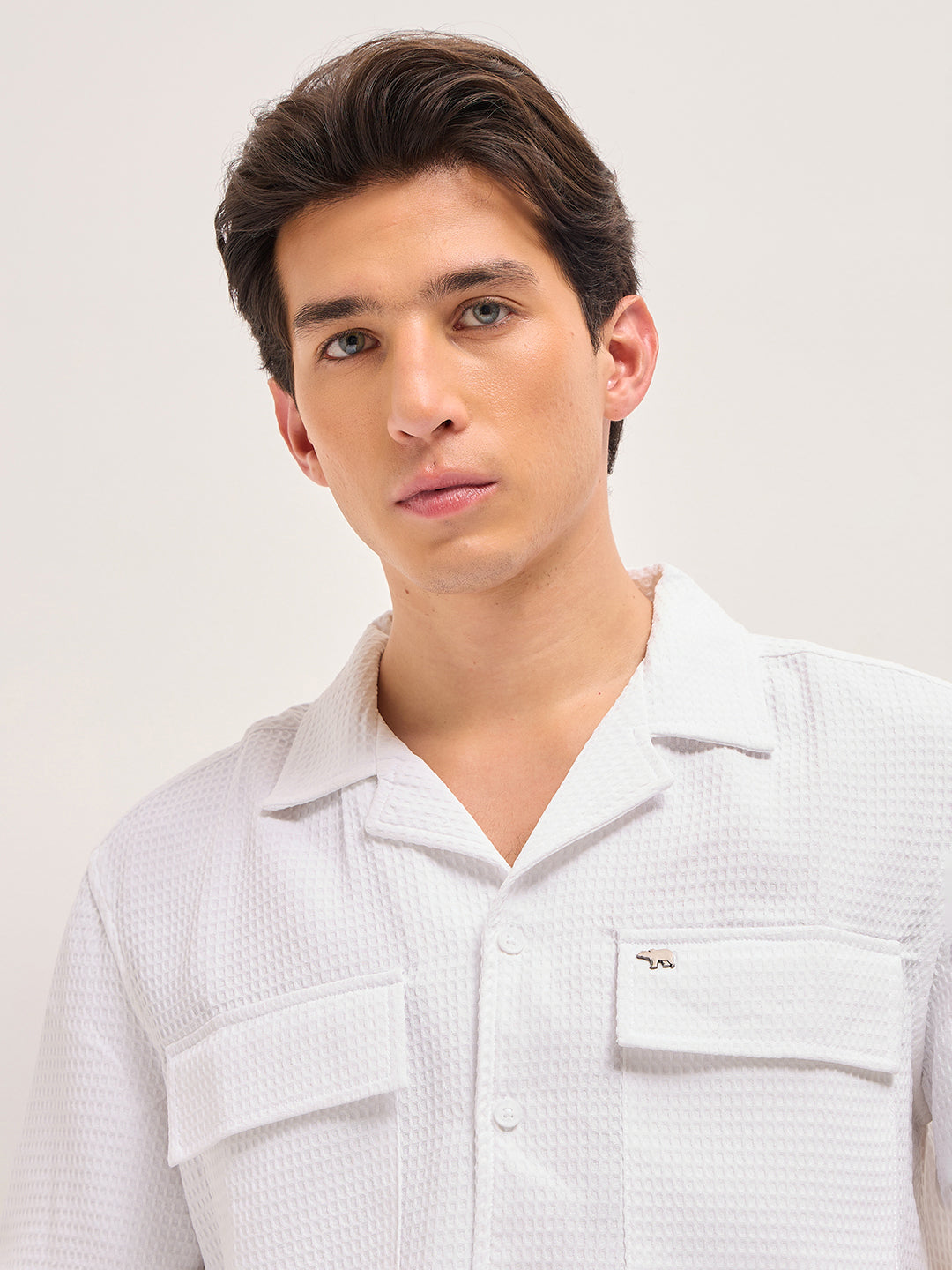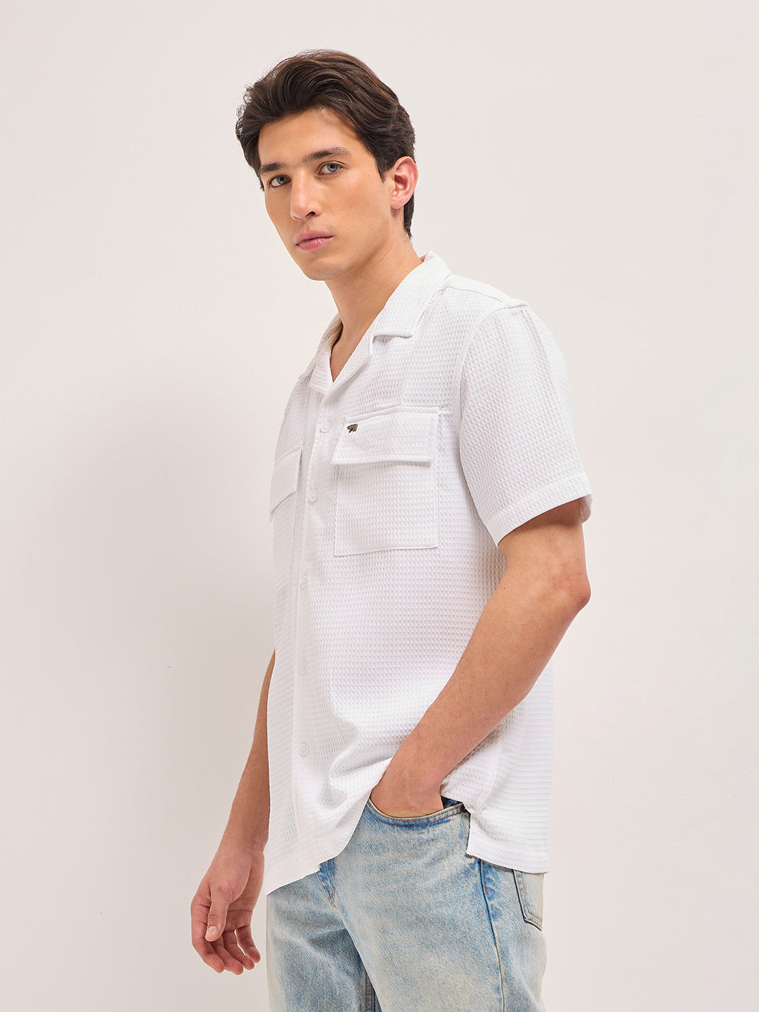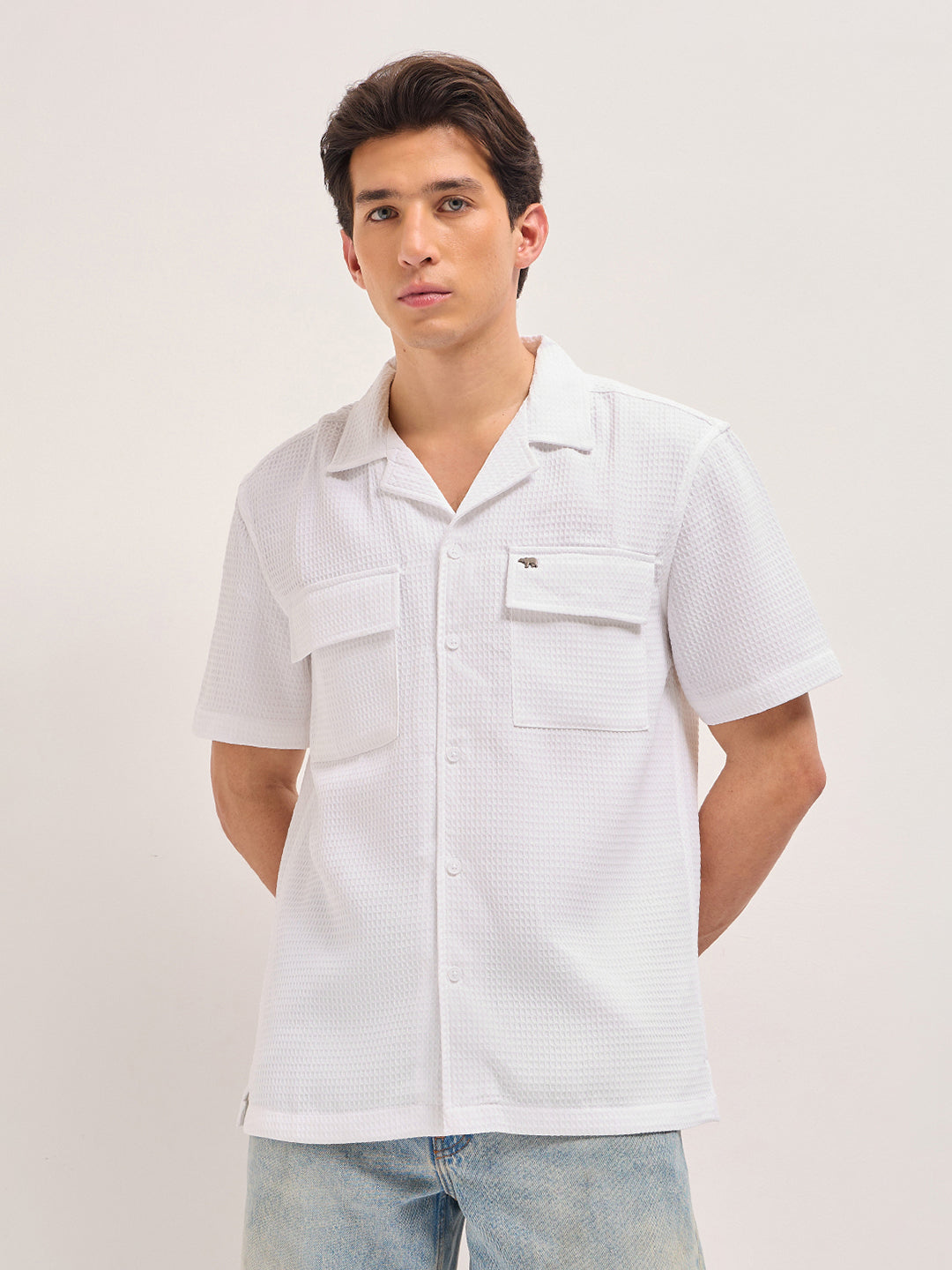 White Textured Woven Relaxed Fit Casual Shirt with Flap Pockets