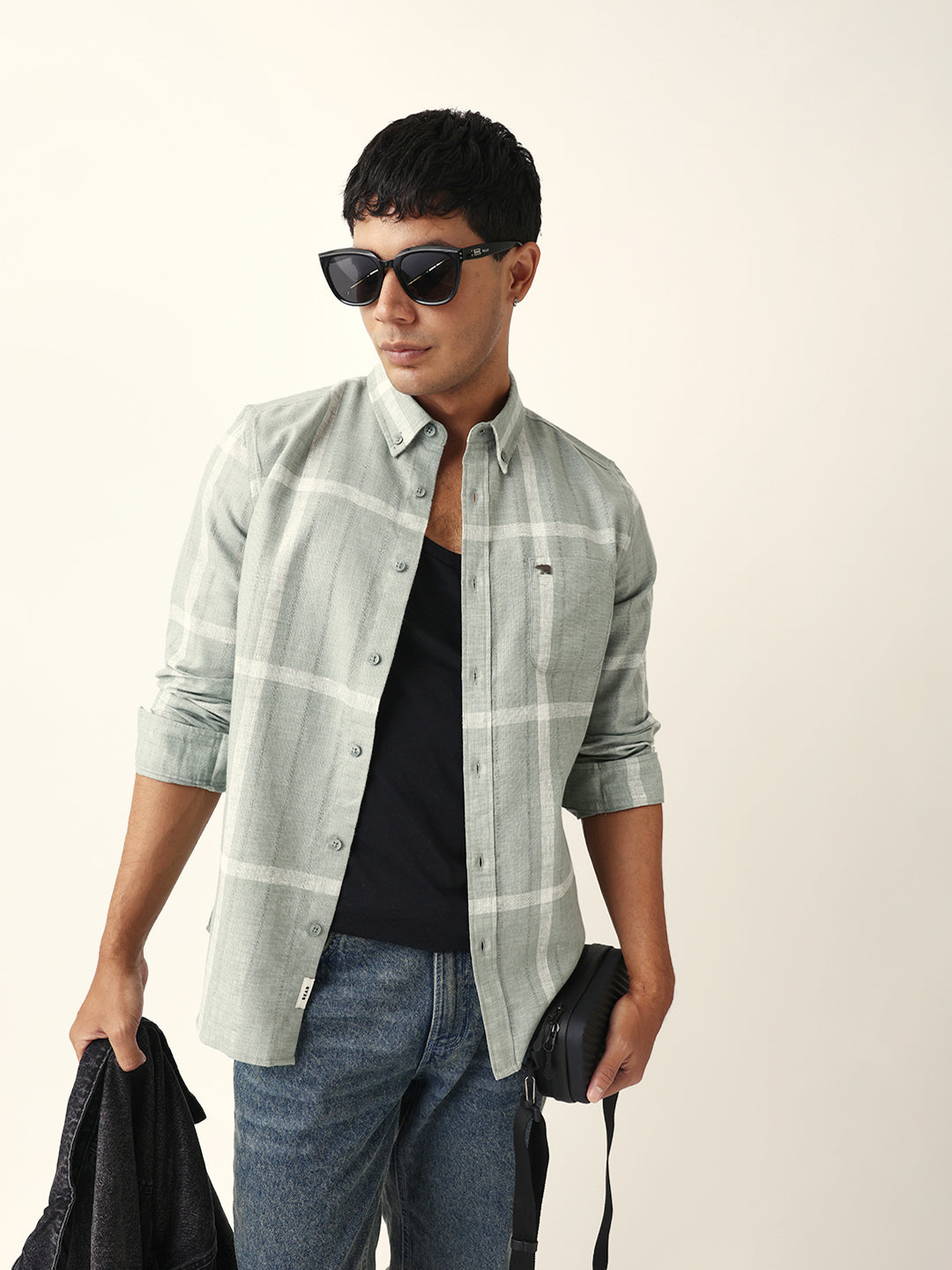 Shop Green & Beige Woven Checked Slim Fit Casual Shirt with Button-Down Collar Online.