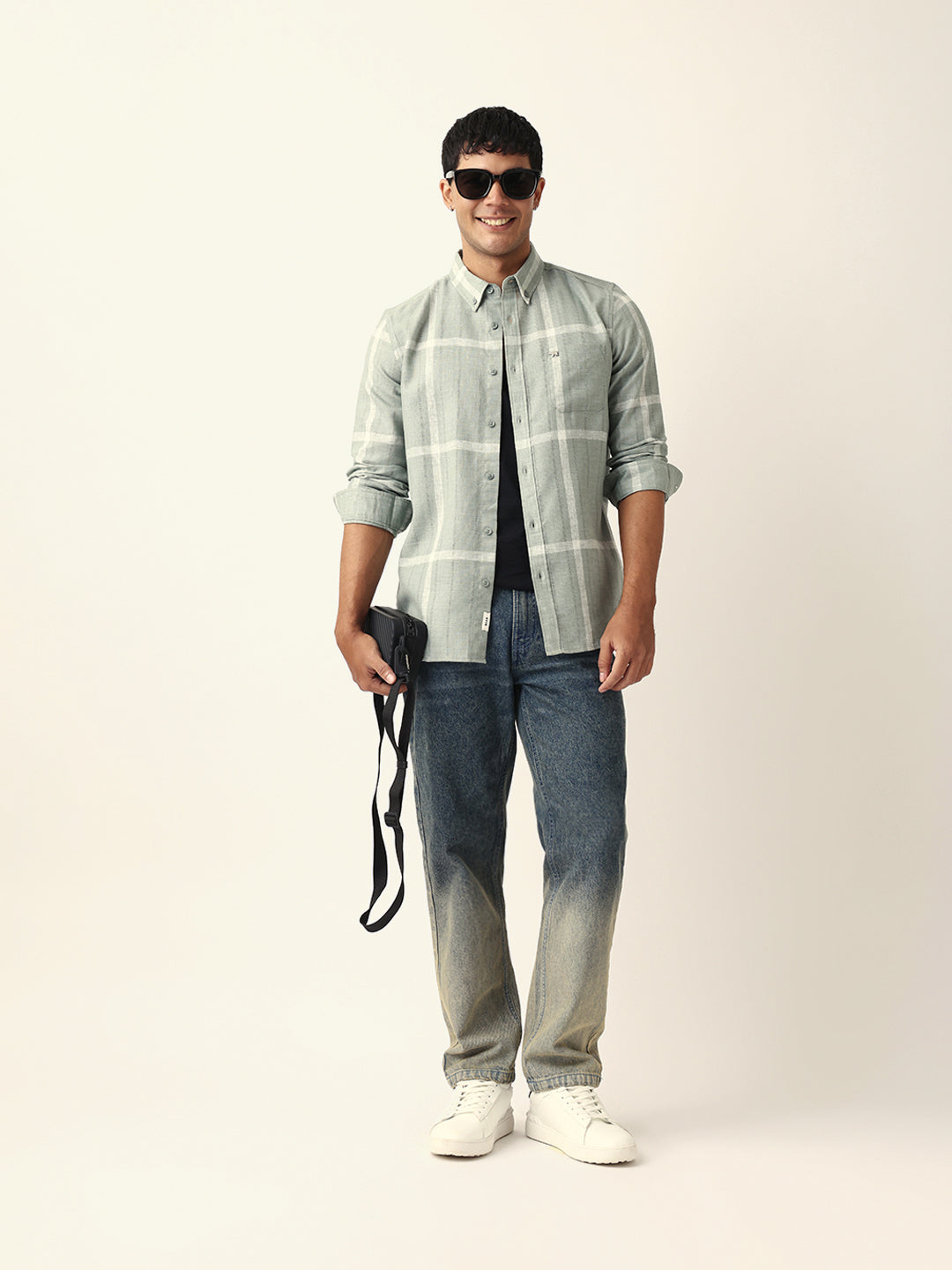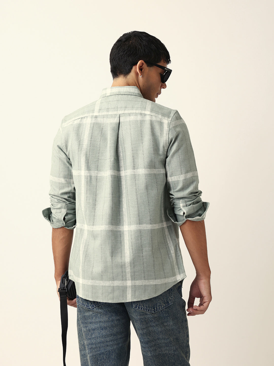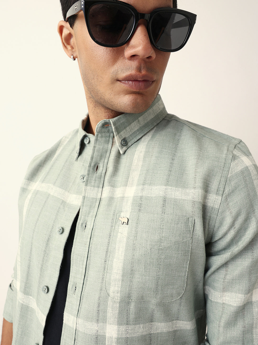 Green & Beige Woven Checked Slim Fit Casual Shirt with Button-Down Collar