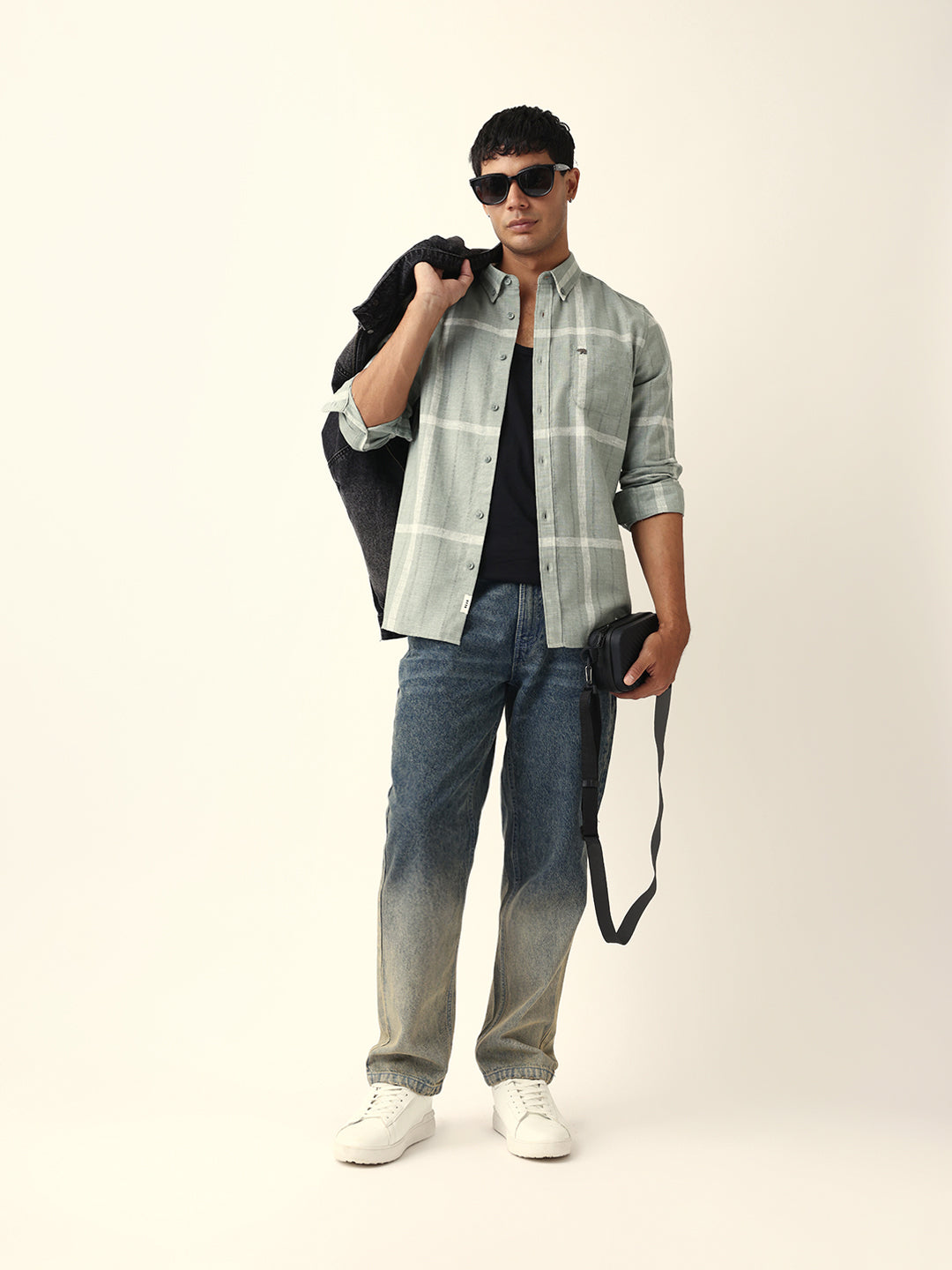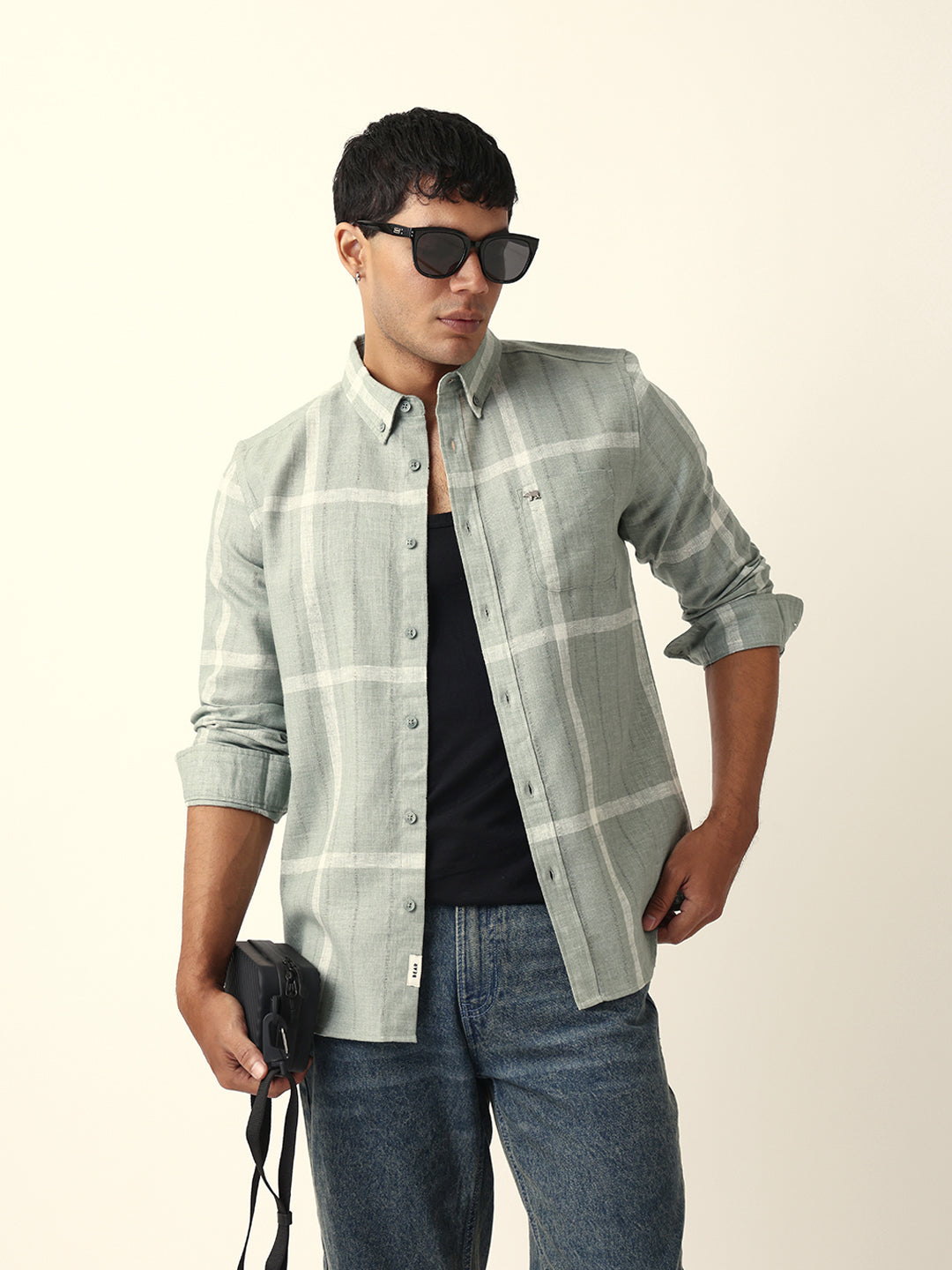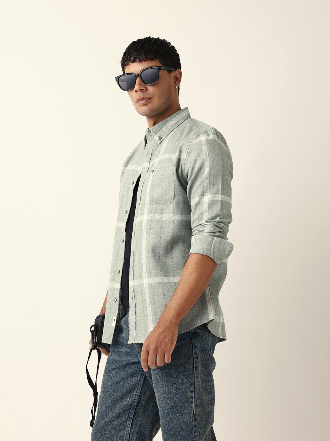 Green & Beige Woven Checked Slim Fit Casual Shirt with Button-Down Collar