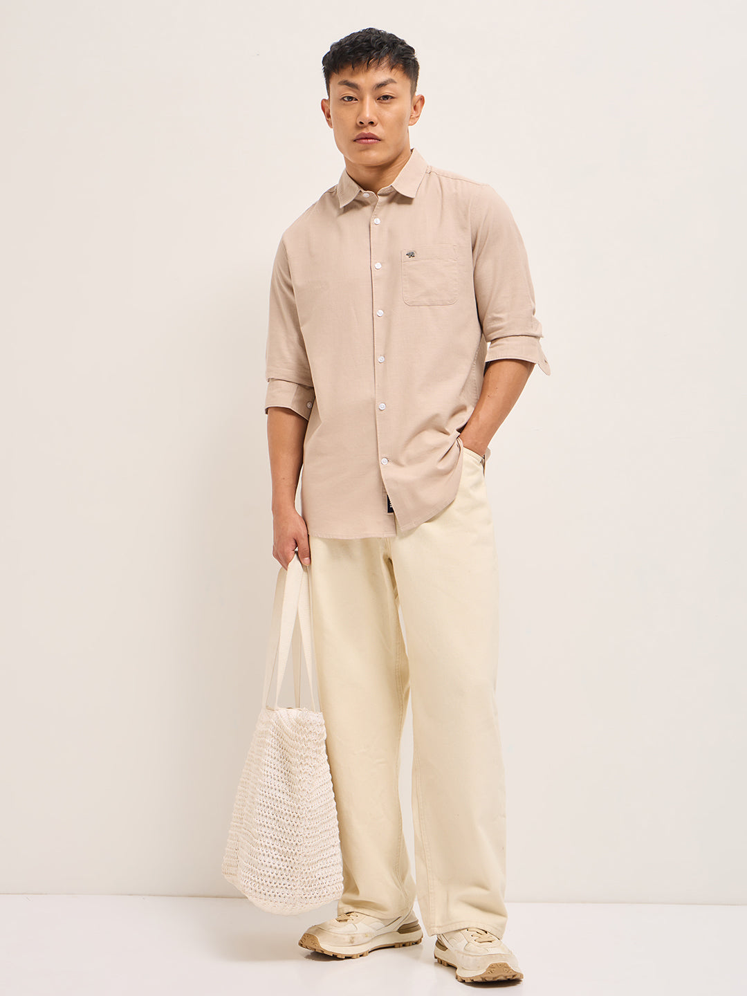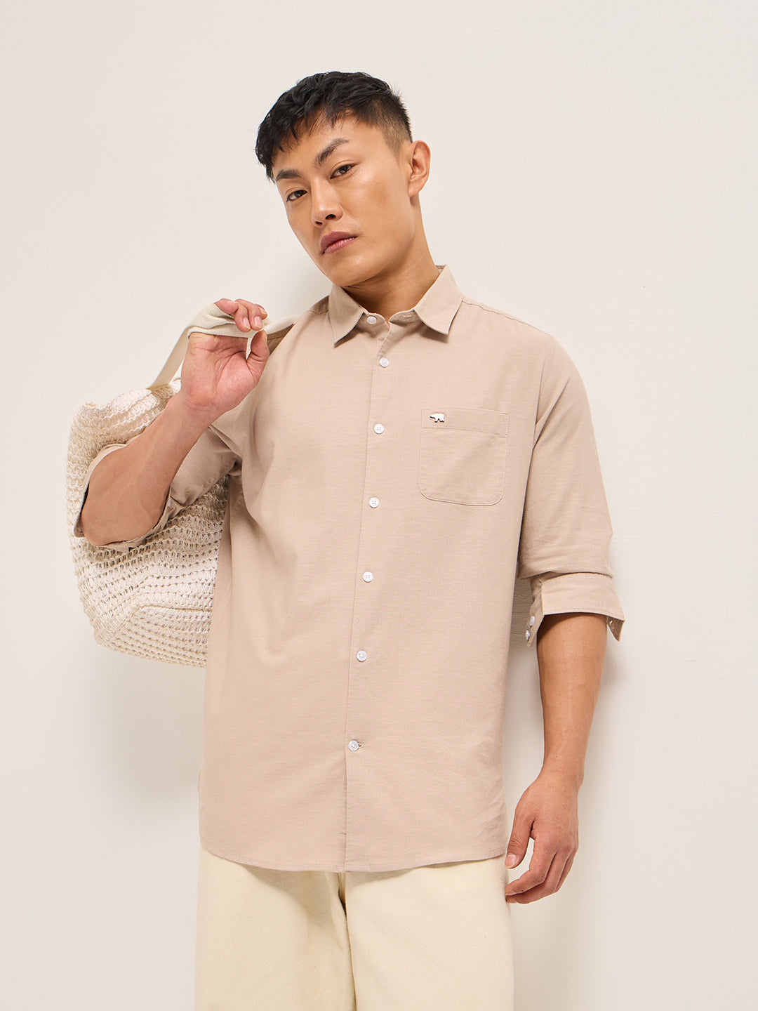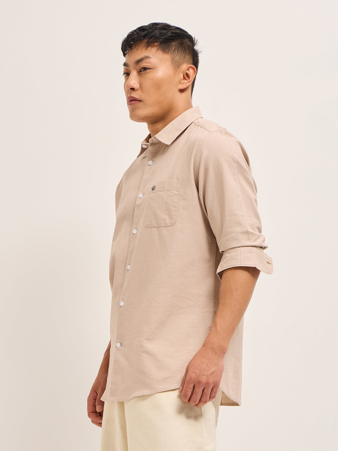 Shop Peach Cotton Linen Slim Fit Solid Casual Shirt Online.