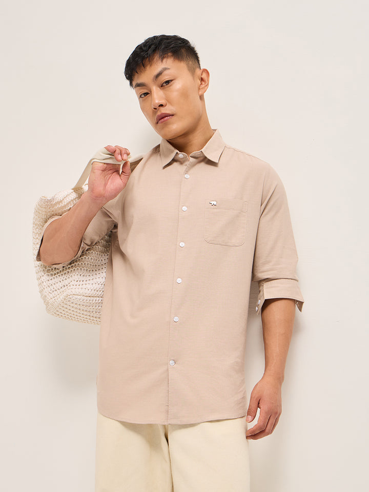Peach Cotton Linen Slim Fit Solid Casual Shirt