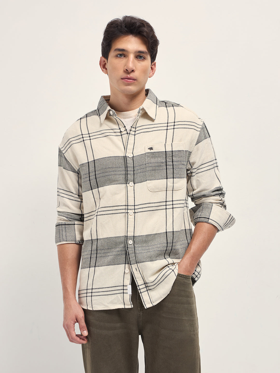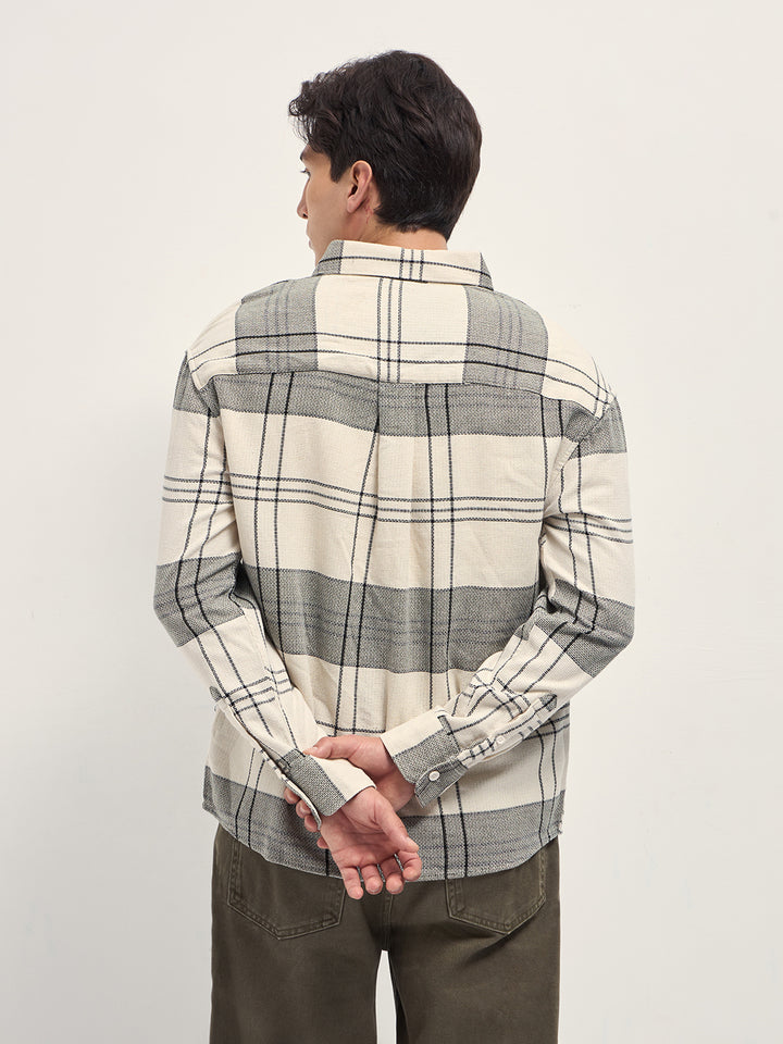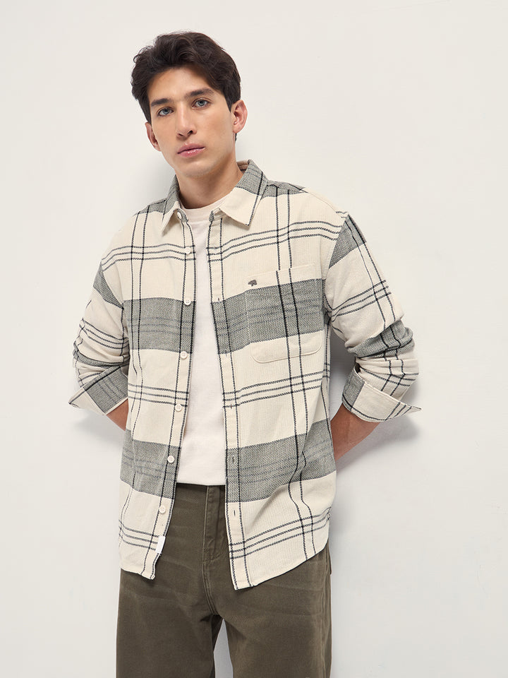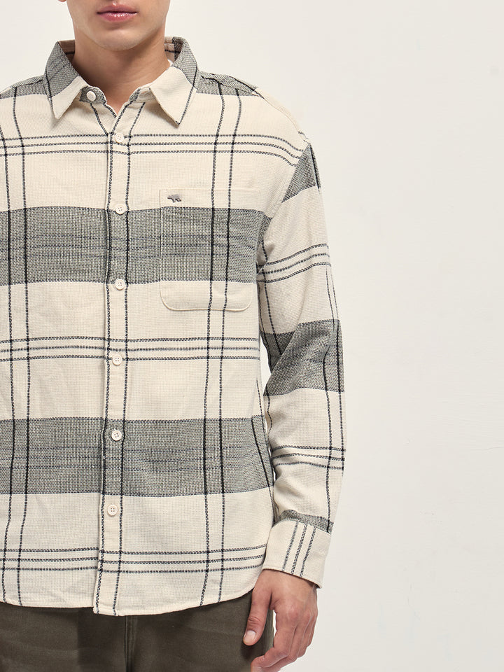 Cream Checked Woven Relaxed Fit Casual Shirt