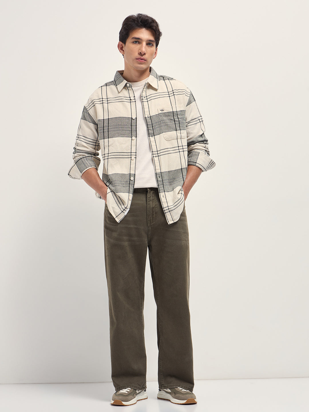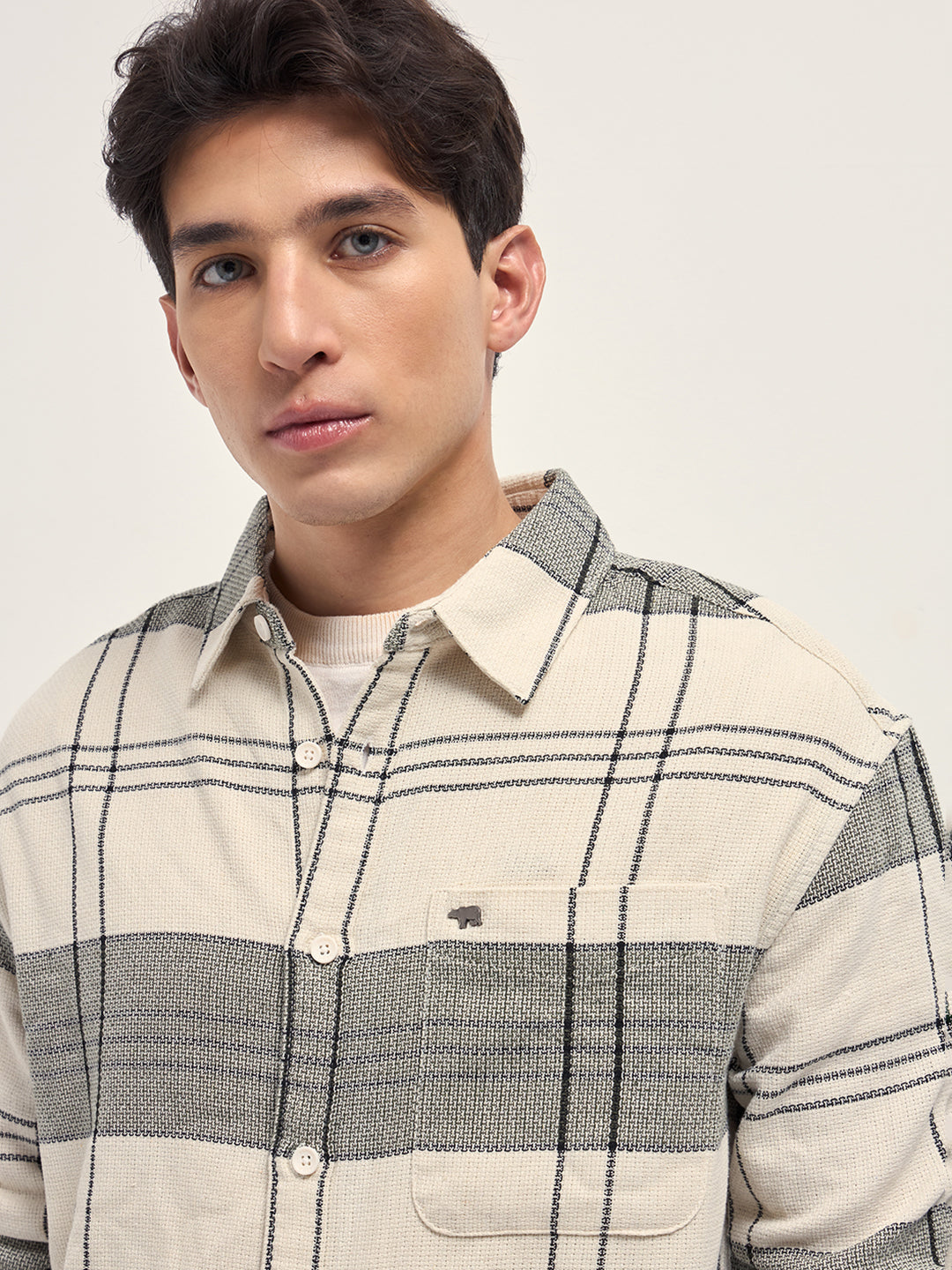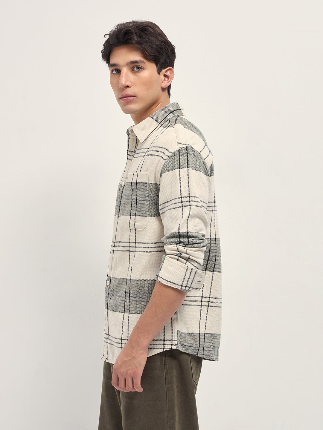 Cream Checked Woven Relaxed Fit Casual Shirt