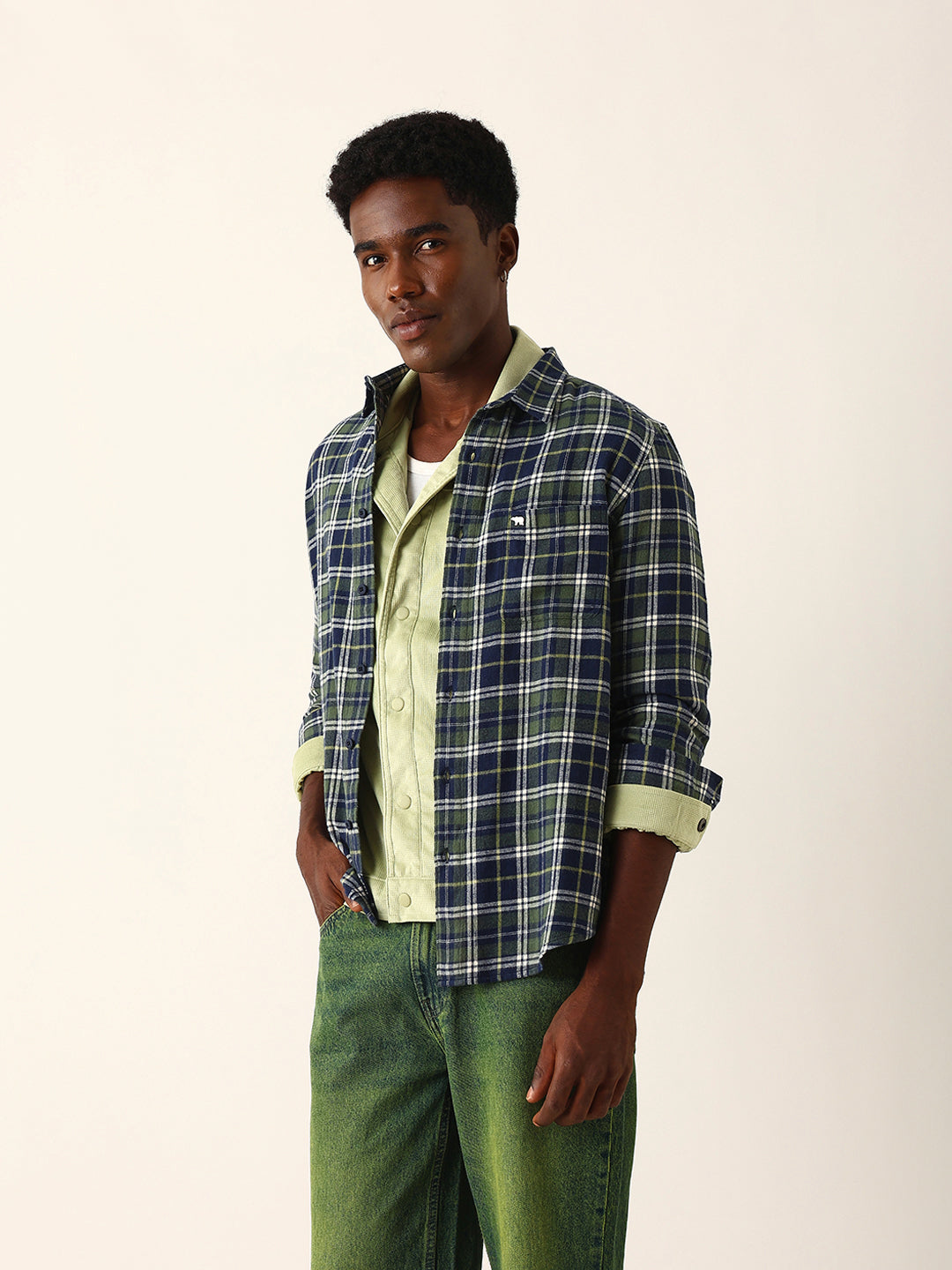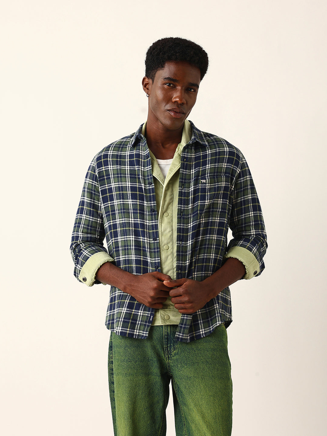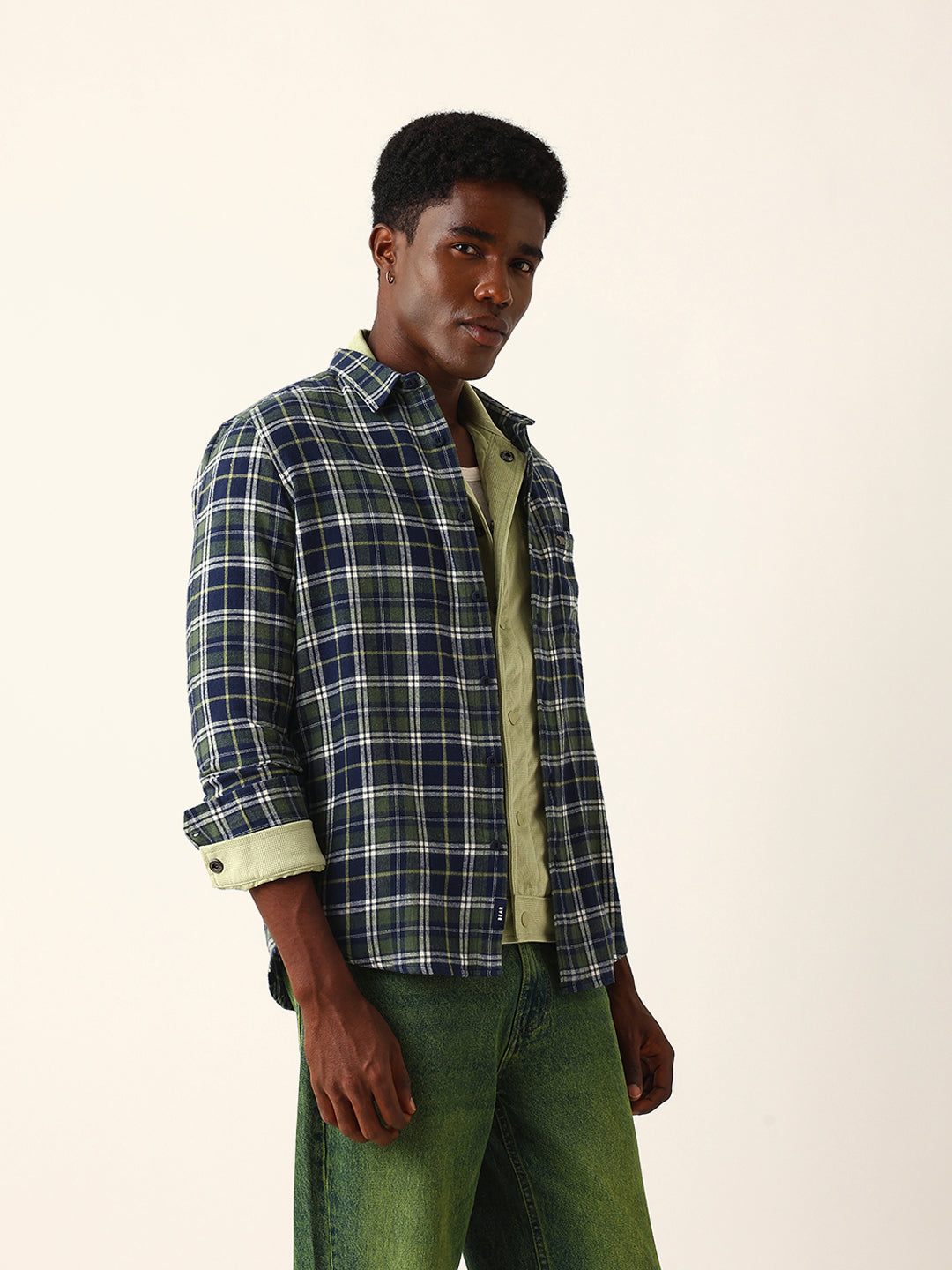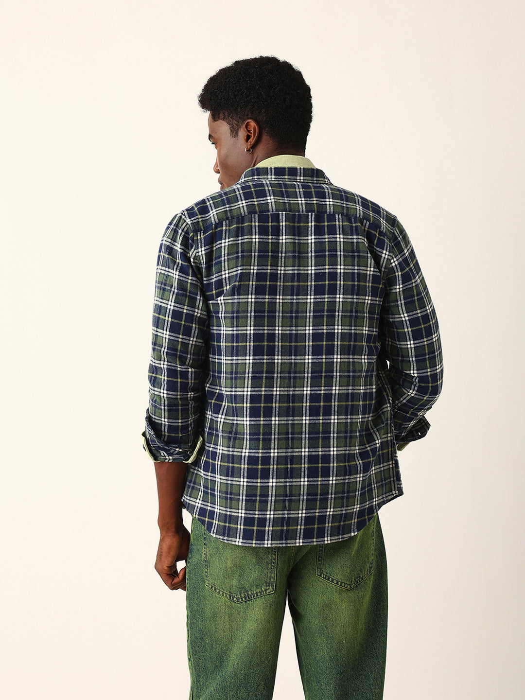 Blue & Green Flannel Woven Checked Slim Fit Casual Shirt