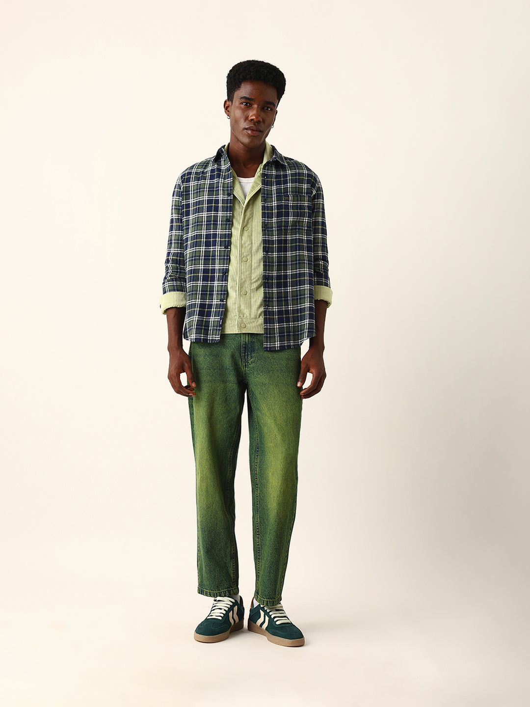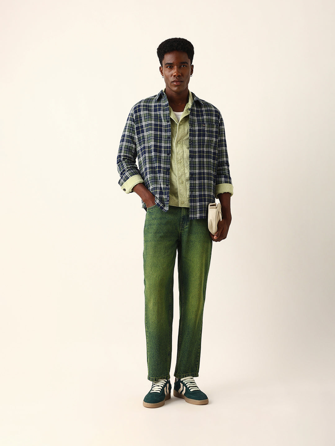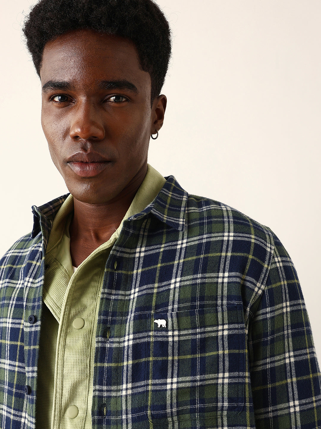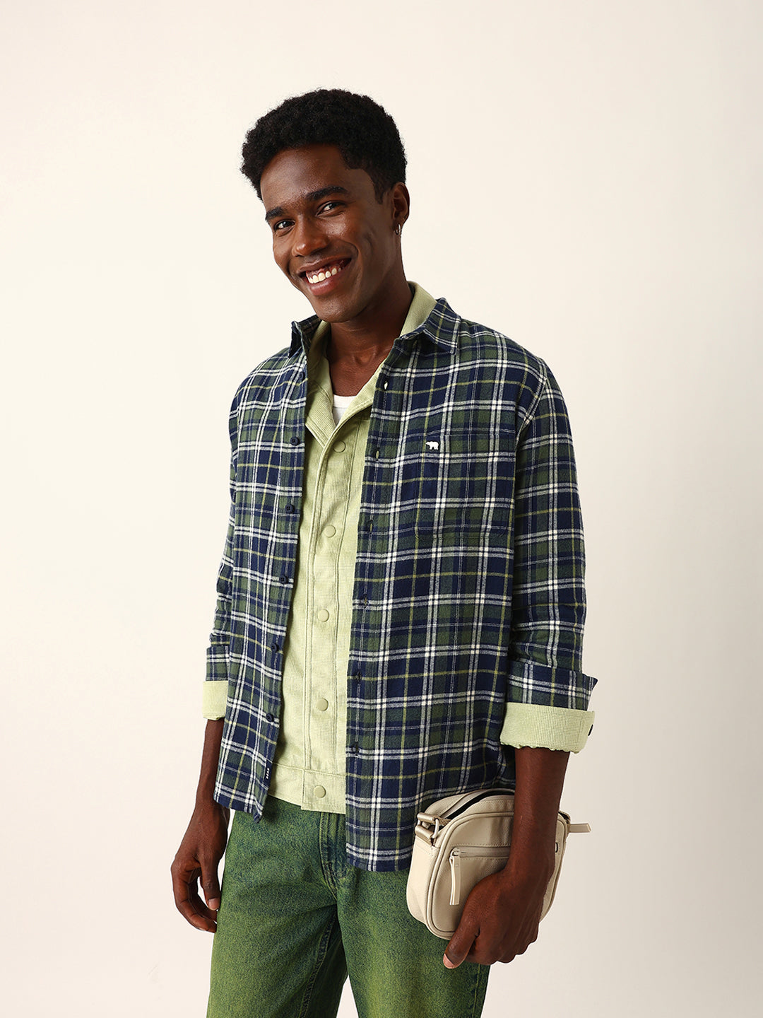 Blue & Green Flannel Woven Checked Slim Fit Casual Shirt