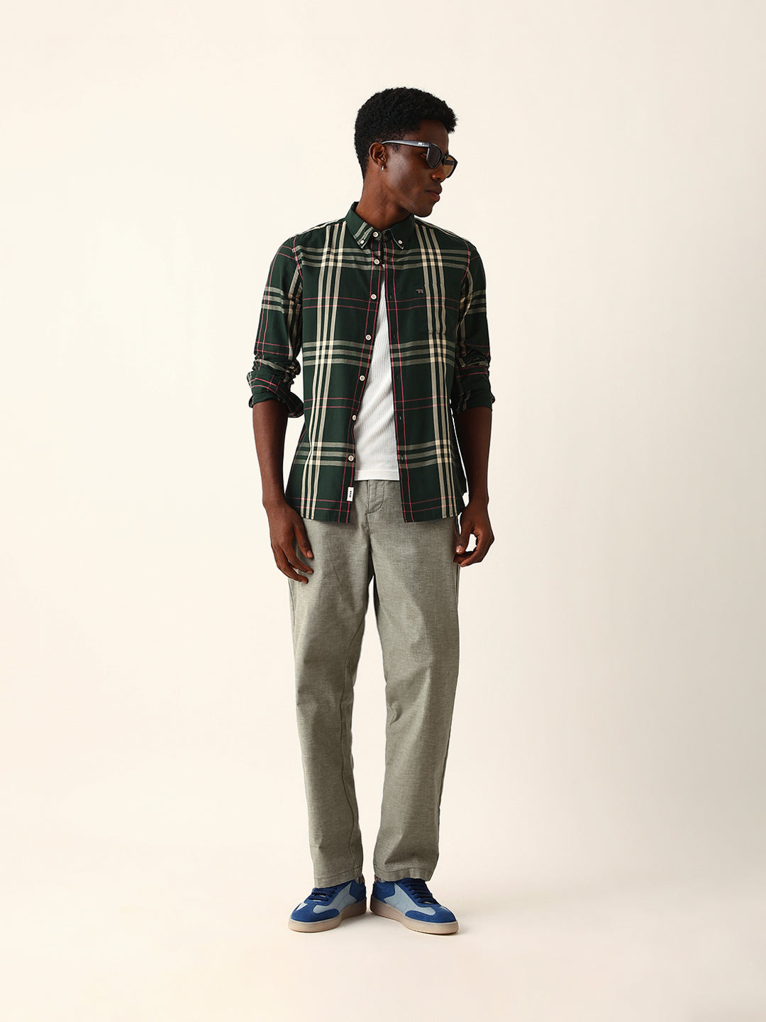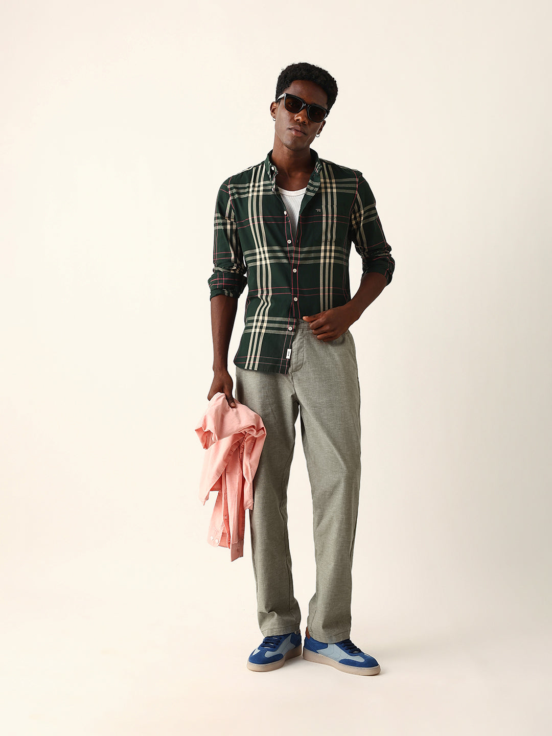 Dark Green Windowpane Checked Slim Fit Woven Casual Shirt