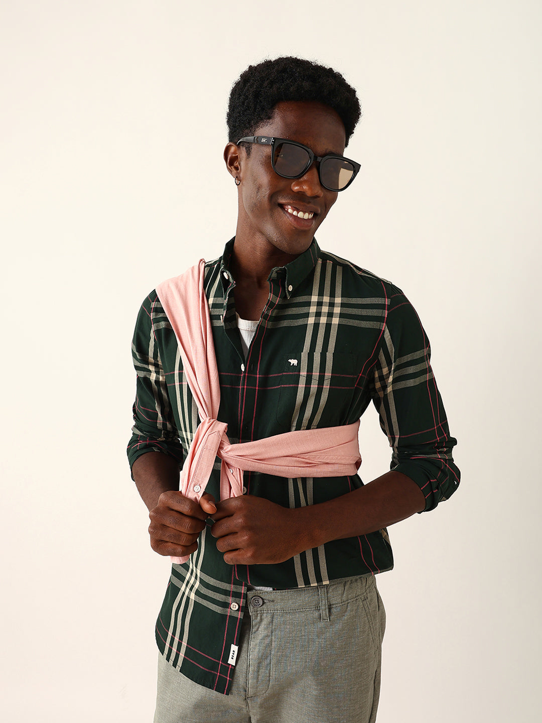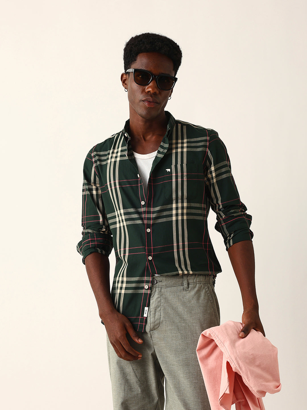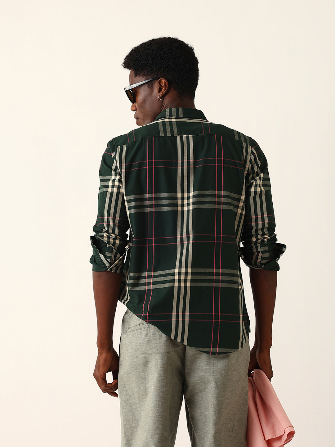 Shop Dark Green Windowpane Checked Slim Fit Woven Casual Shirt Online.