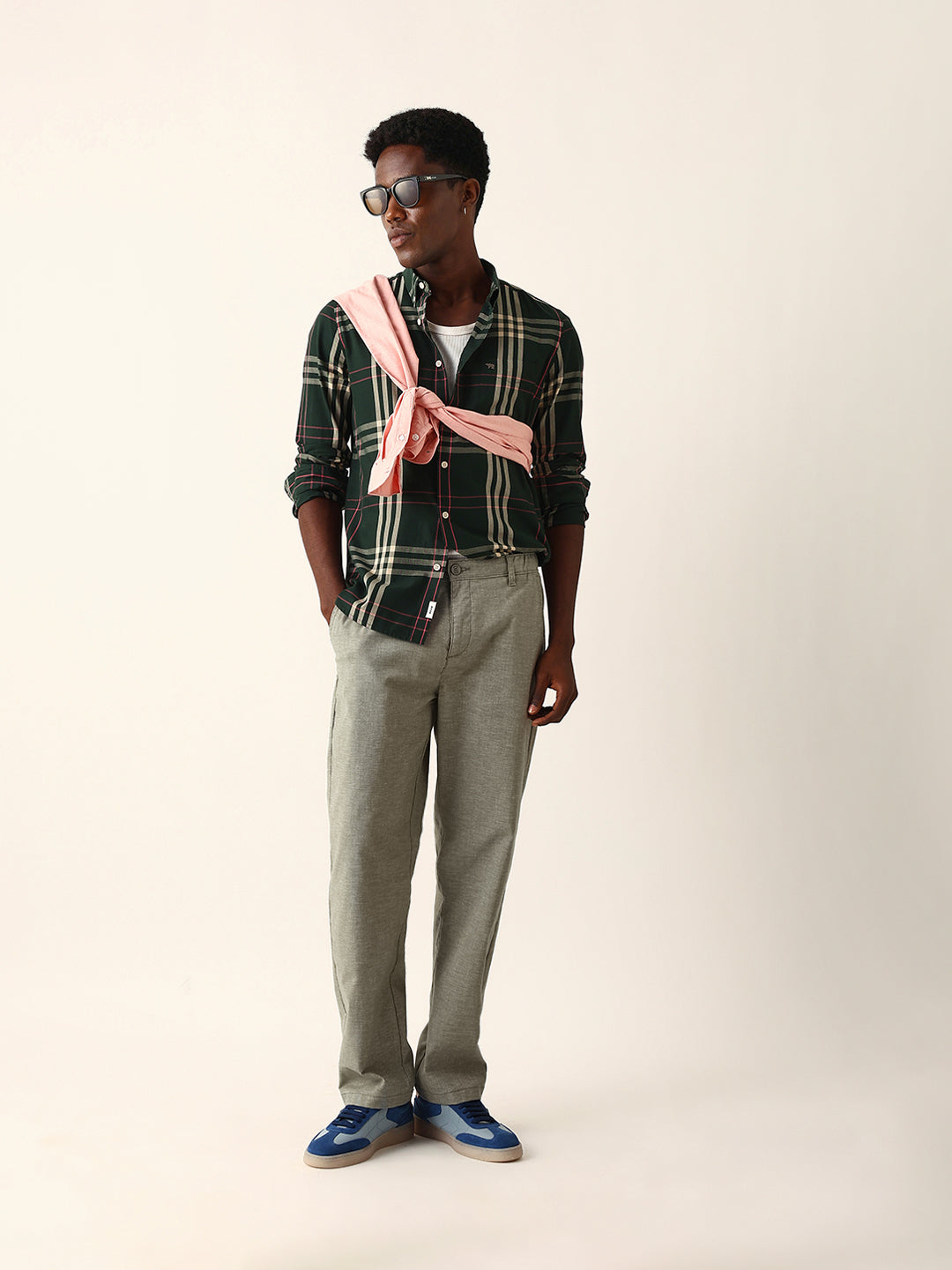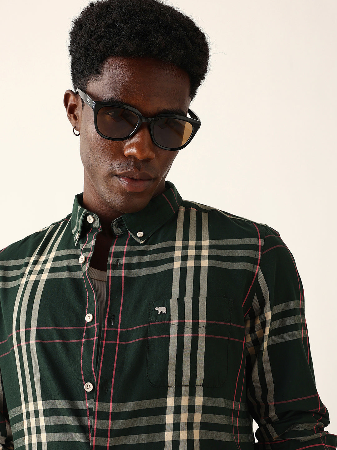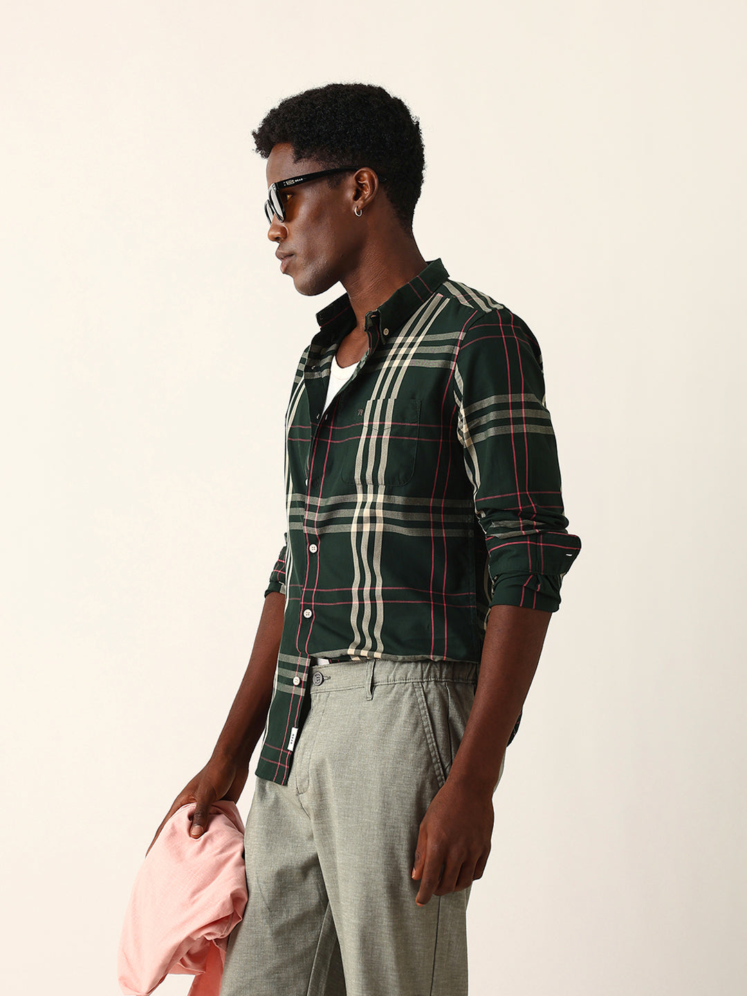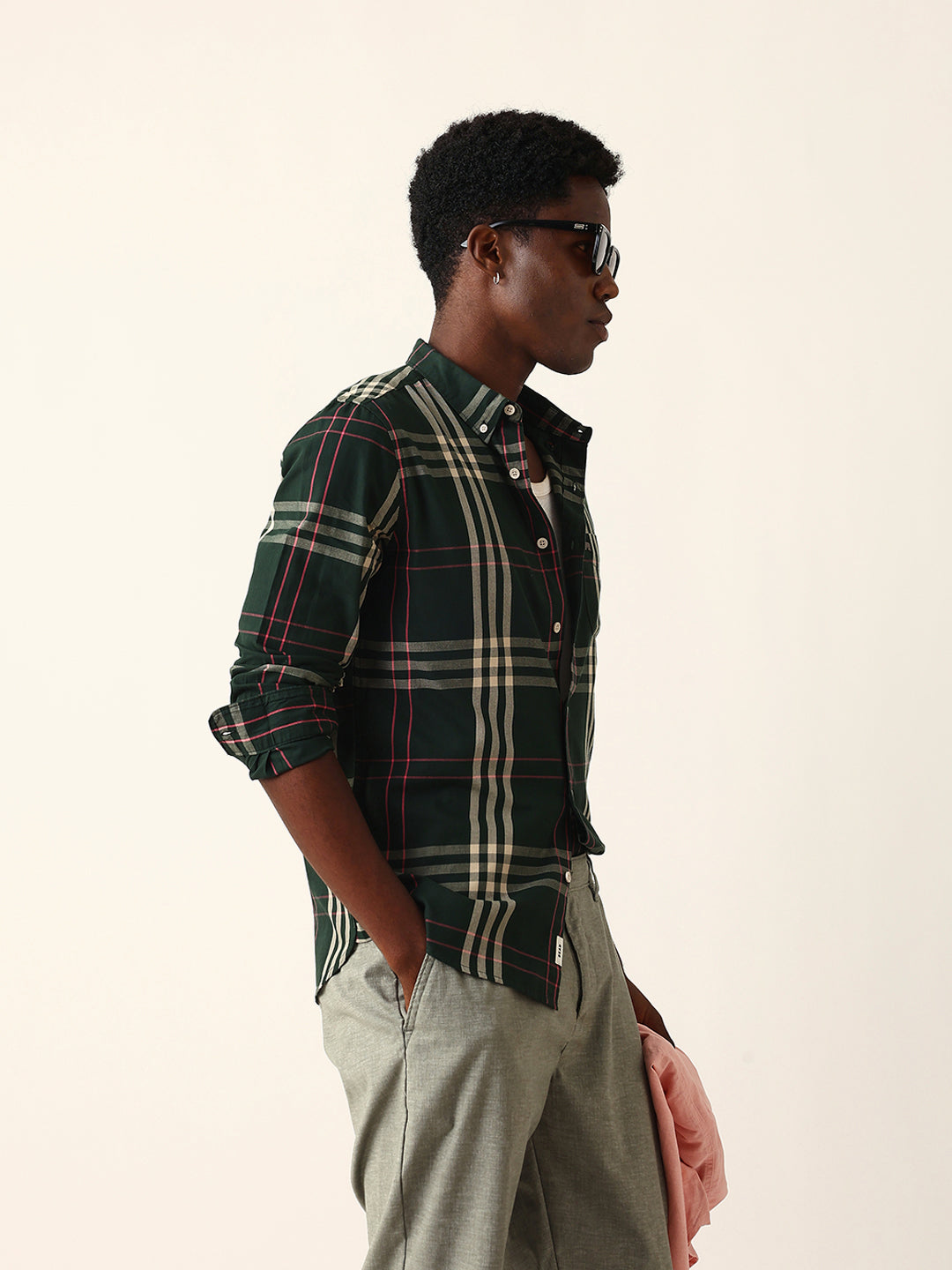 Shop Dark Green Windowpane Checked Slim Fit Woven Casual Shirt Online.