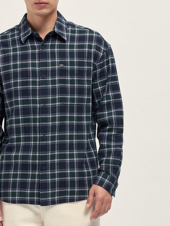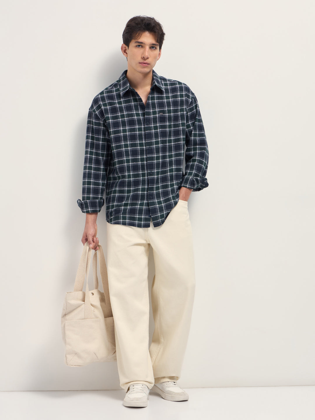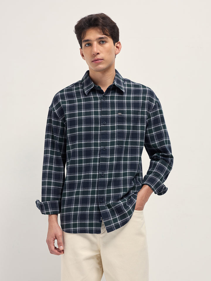 Shop Navy Blue Herringbone Check Cotton Relaxed Fit Overshirt Online.