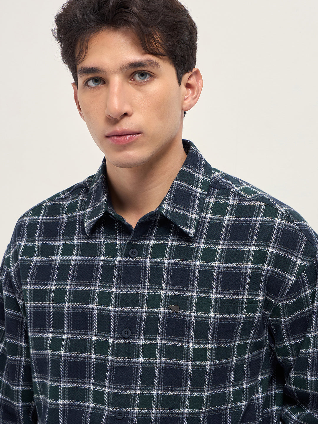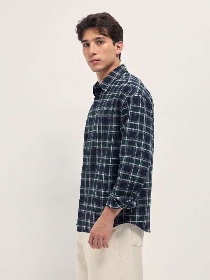 Navy Blue Herringbone Check Cotton Relaxed Fit Overshirt