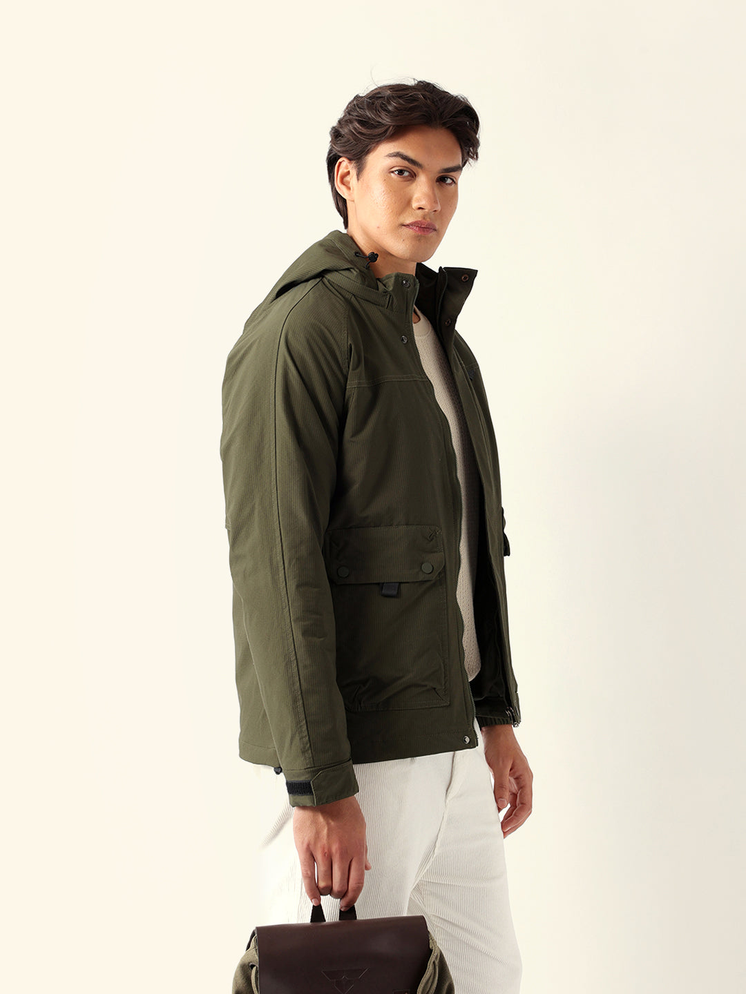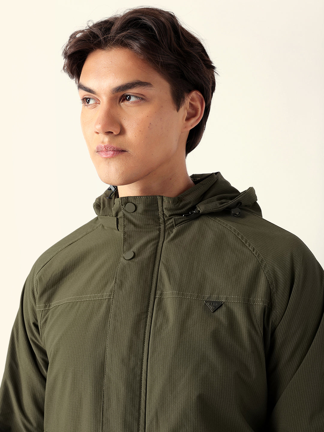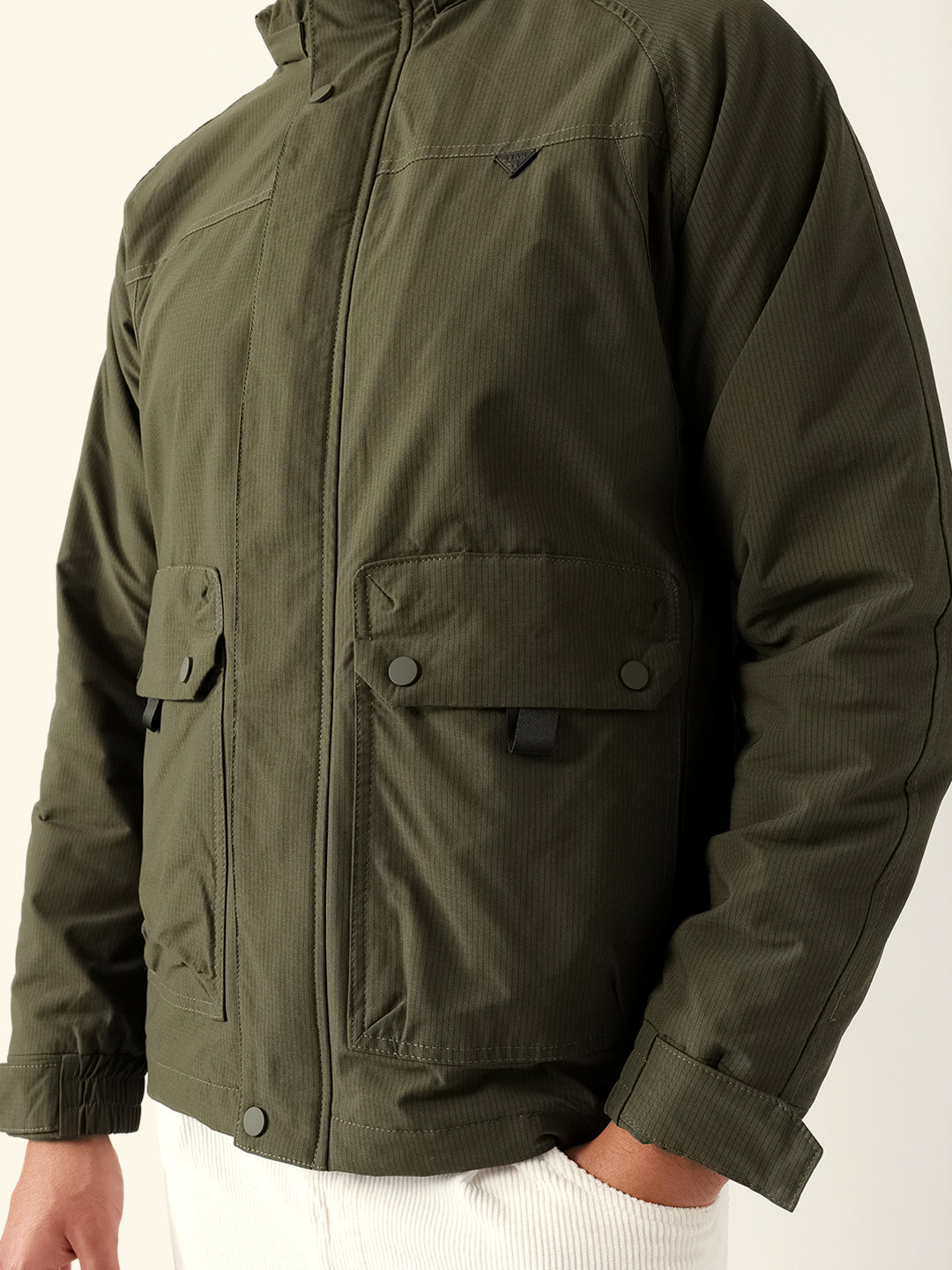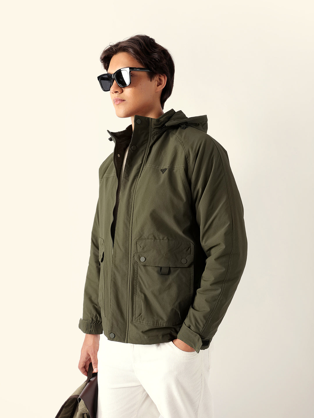 Olive Regular Fit Utility Jacket with Detachable Hood, Raglan Sleeves & Multi-Pockets