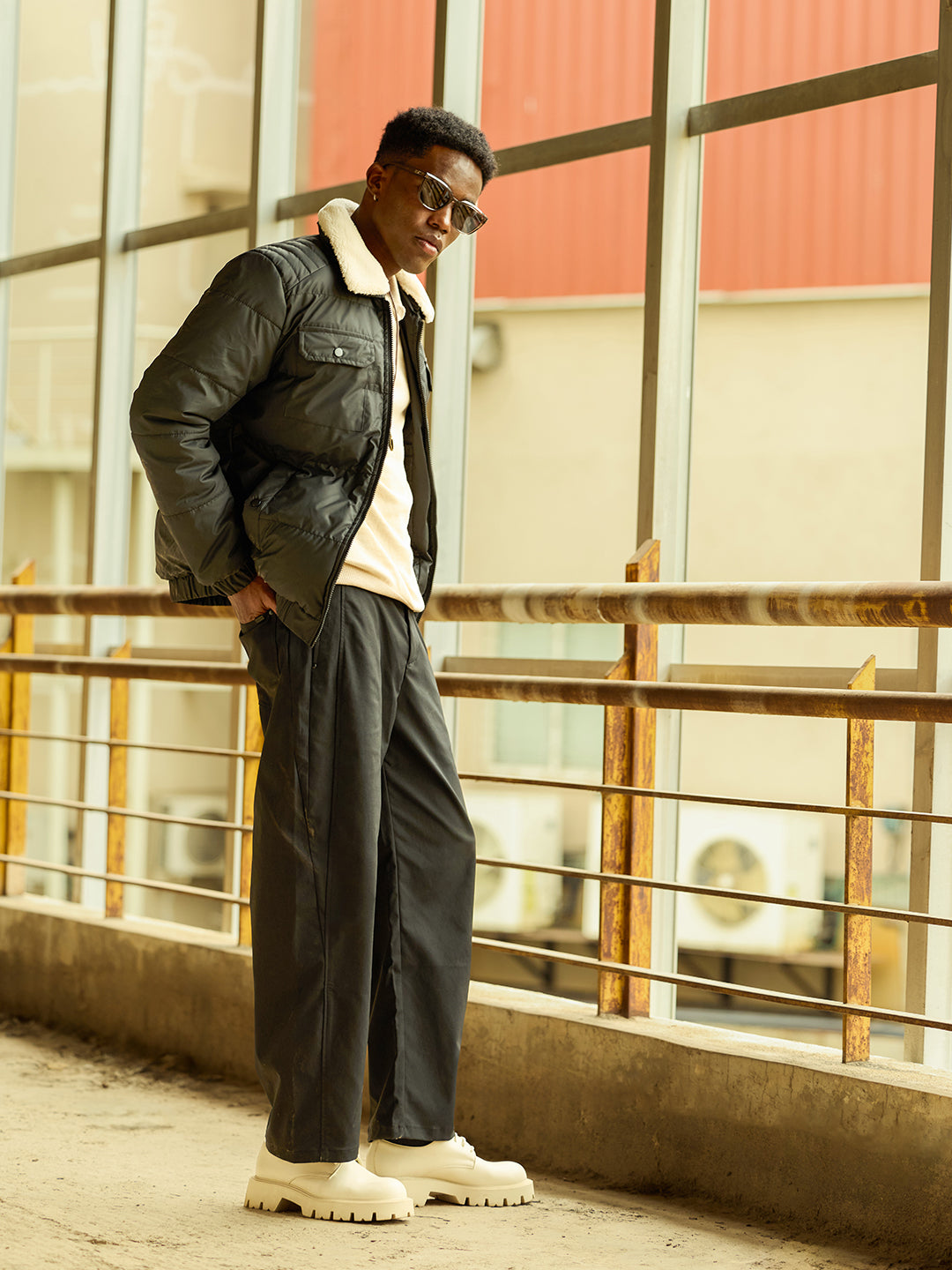 Black Regular Fit Puffer Jacket with Mock Neck and Removable Sherpa