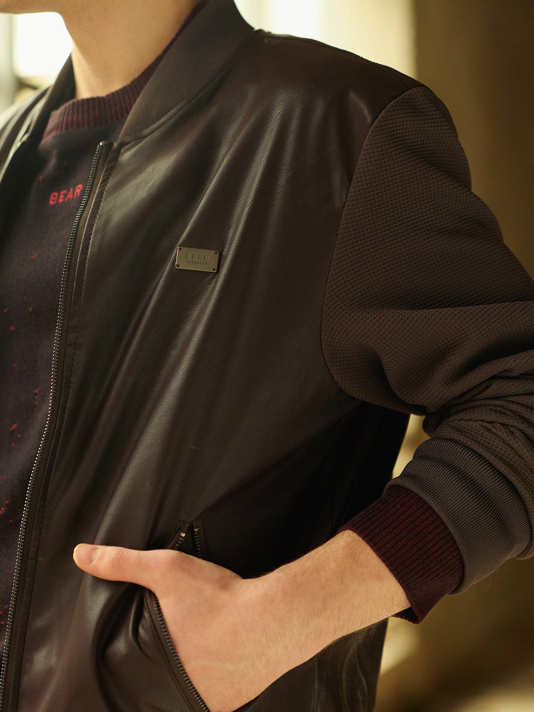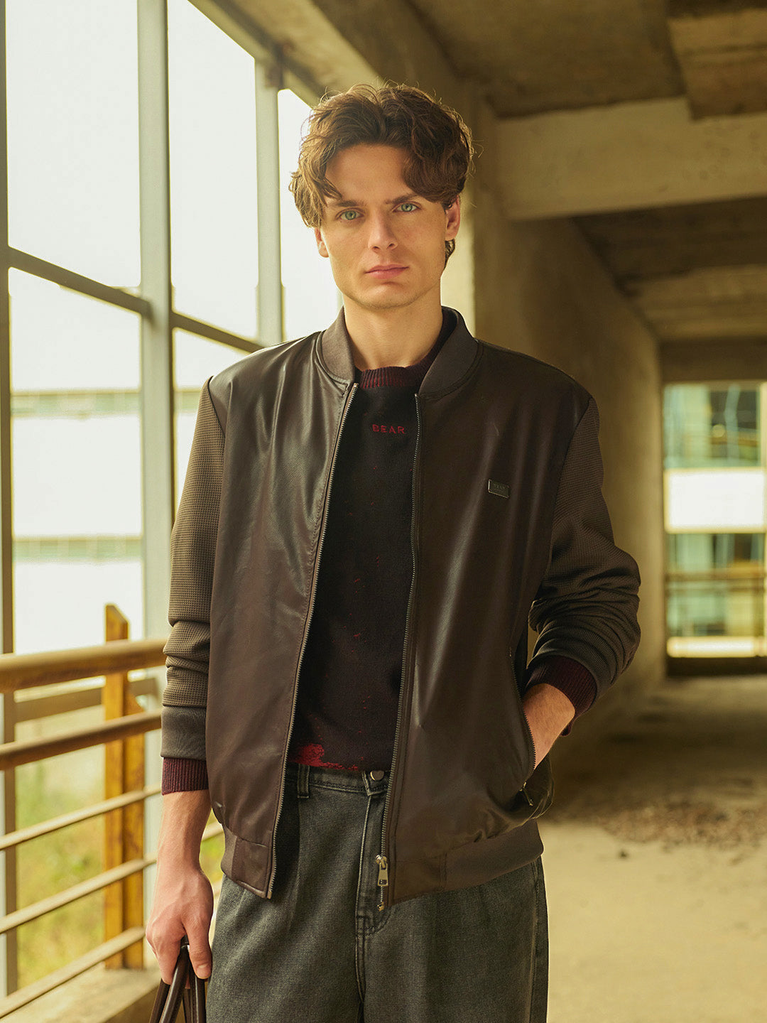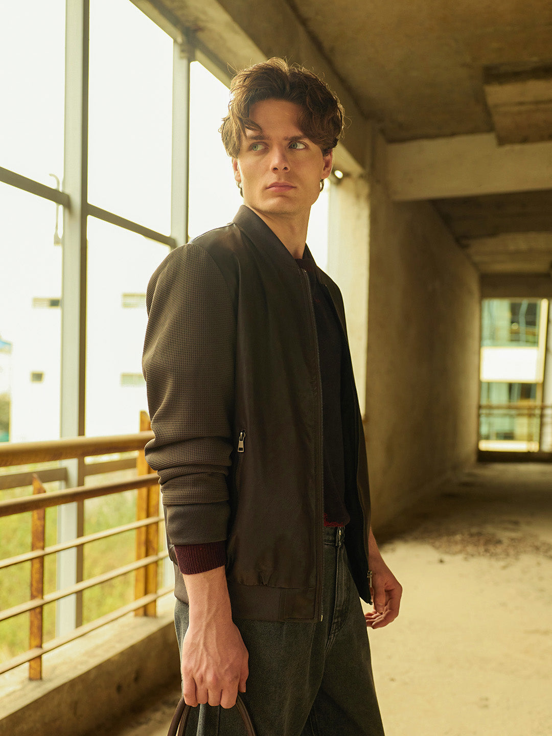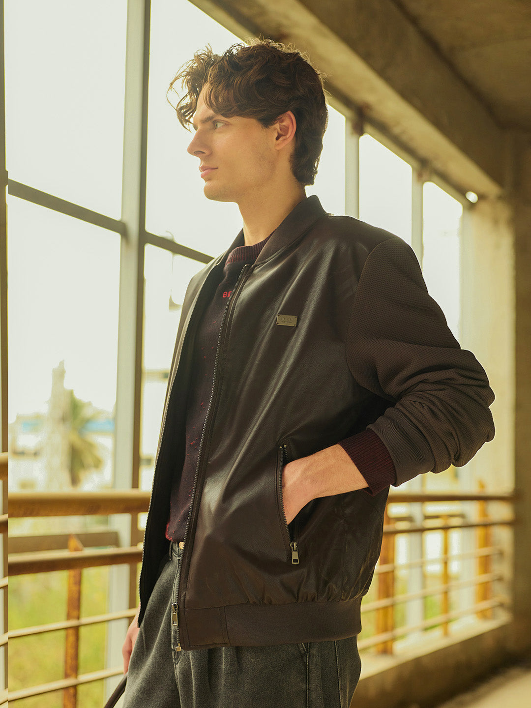 Brown Regular Fit Bomber Jacket with Ribbed Mock Neck & Waffle-Textured Sleeves