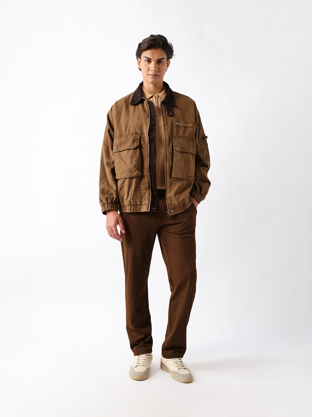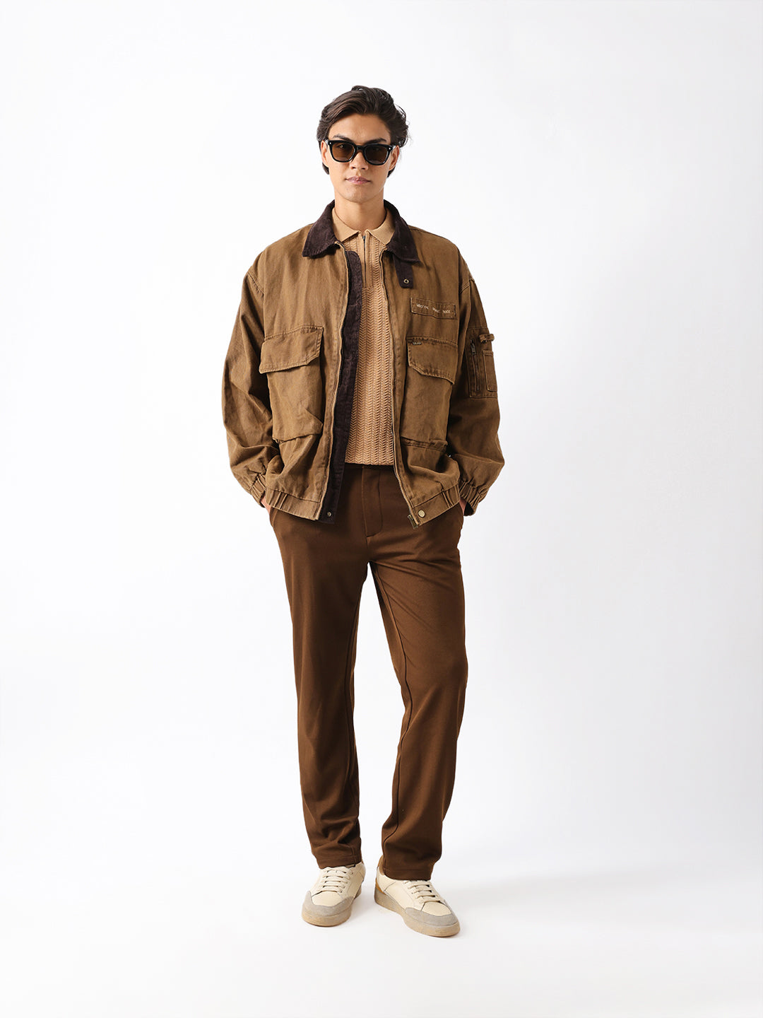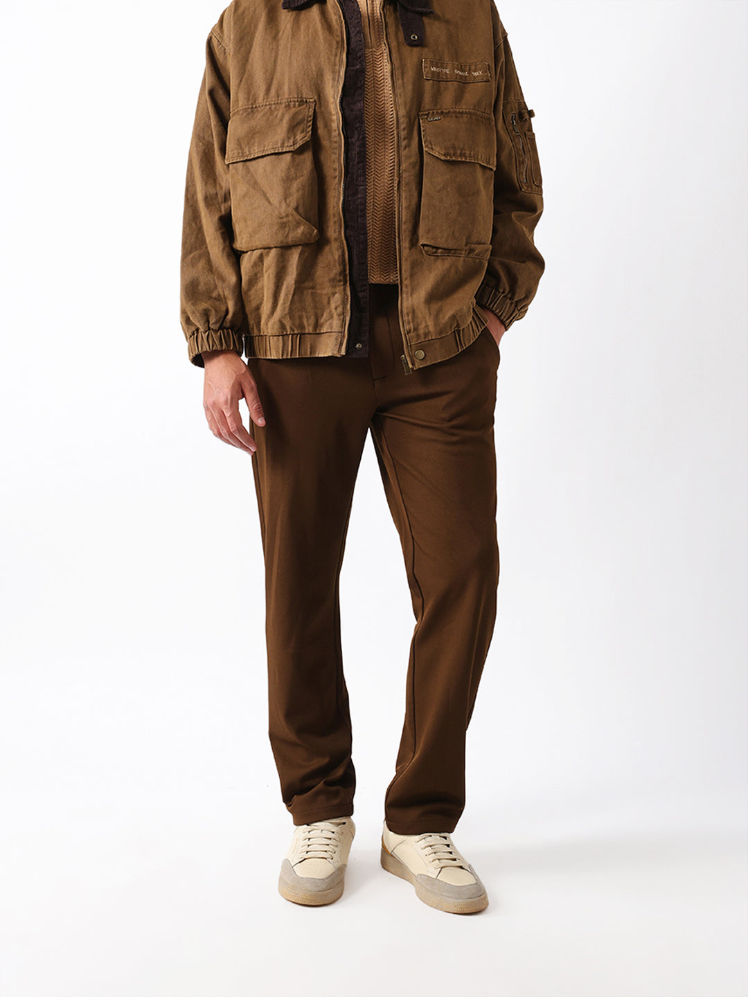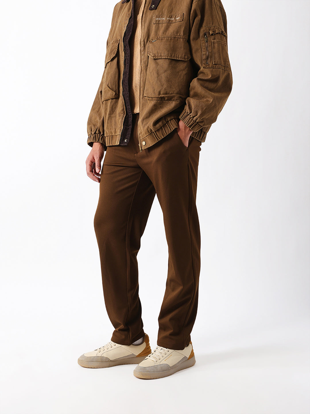 Shop Dark Brown Straight Fit Solid Smart Casual Trousers with Front Pleats Online