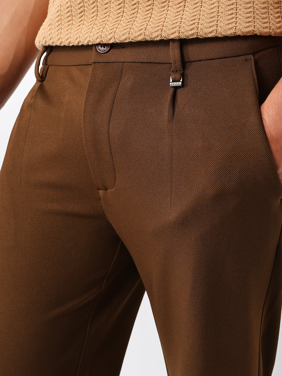 Dark Brown Straight Fit Solid Smart Casual Trousers with Front Pleats