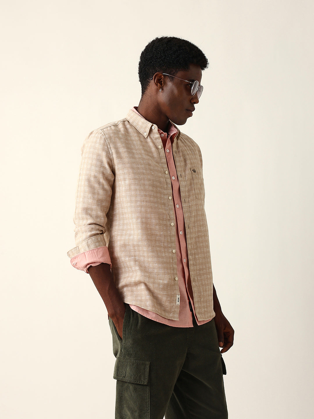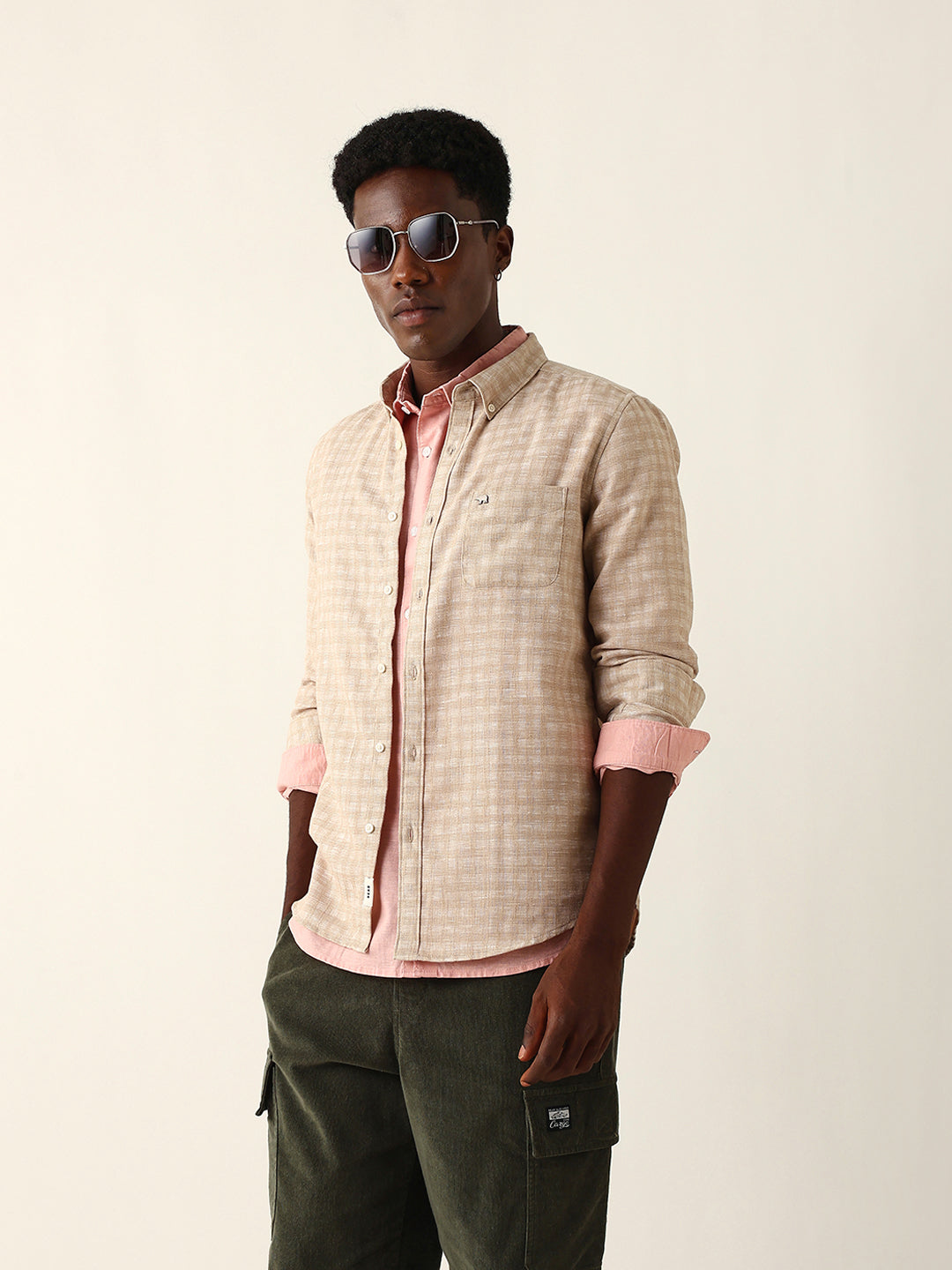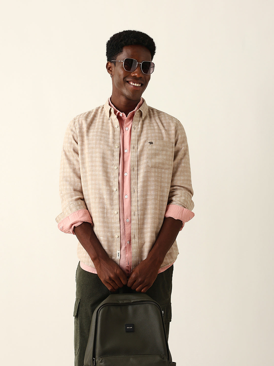 Beige Woven Micro Check Textured Slim Fit Casual Shirt