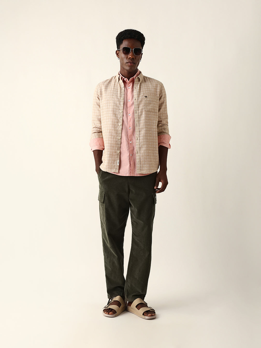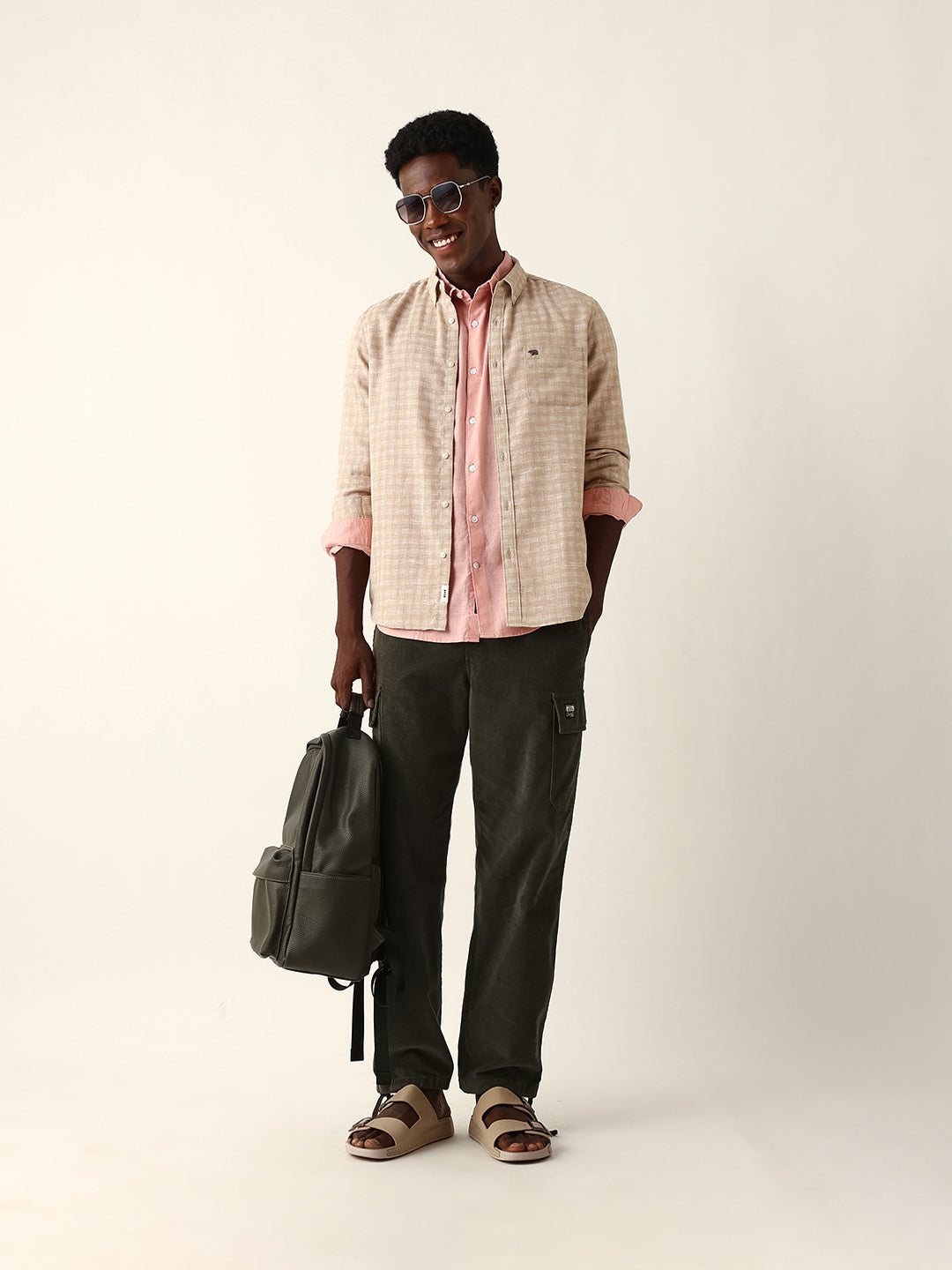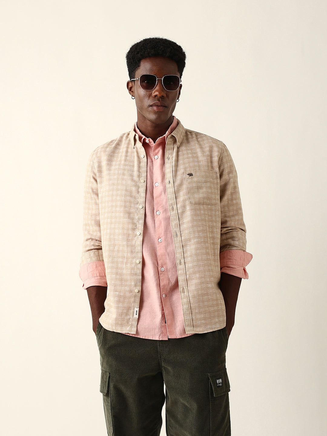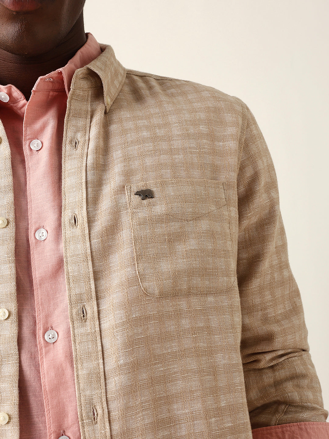 Beige Woven Micro Check Textured Slim Fit Casual Shirt