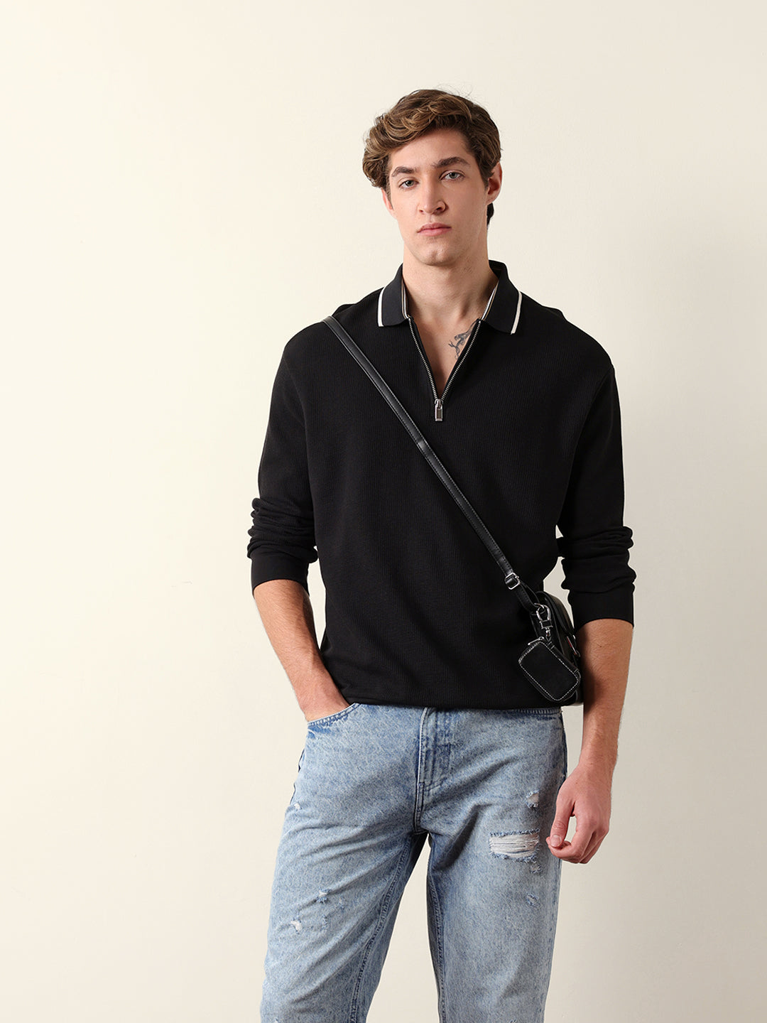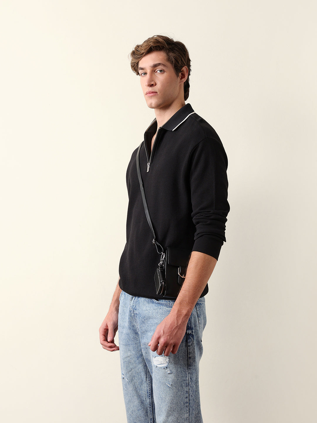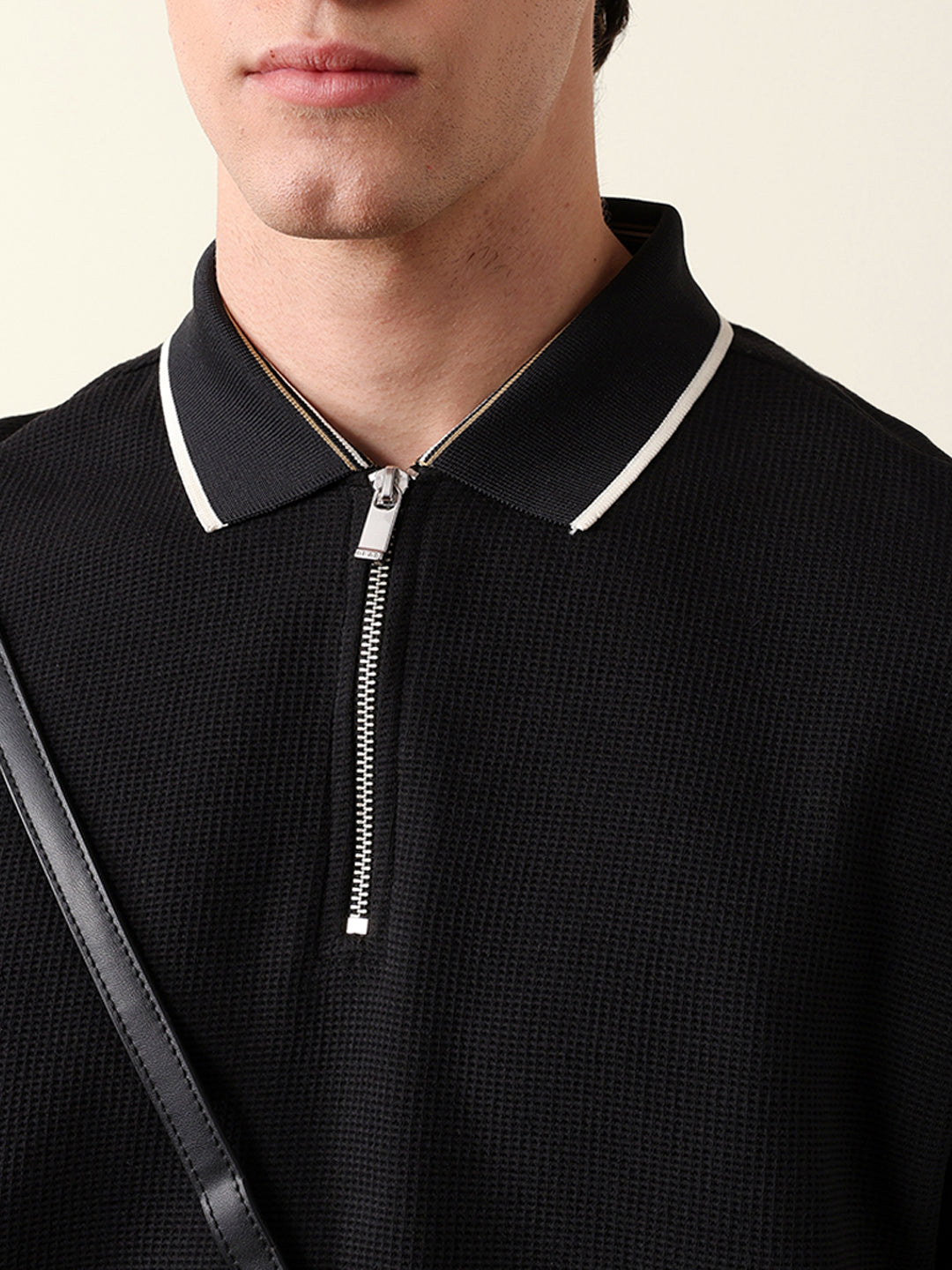 - Neck: Polo neck with a half-zip placket