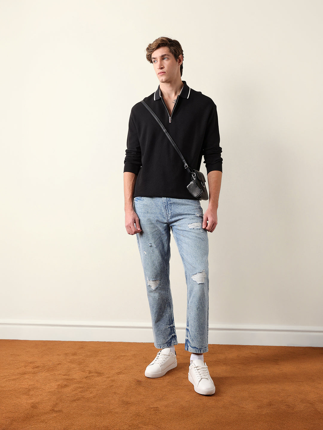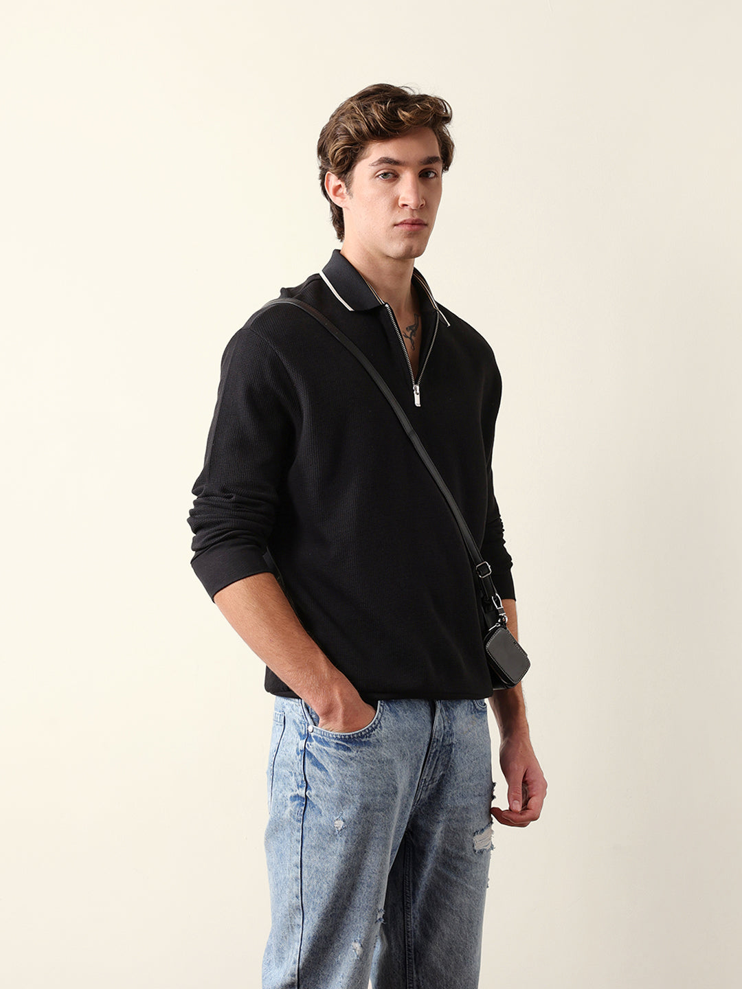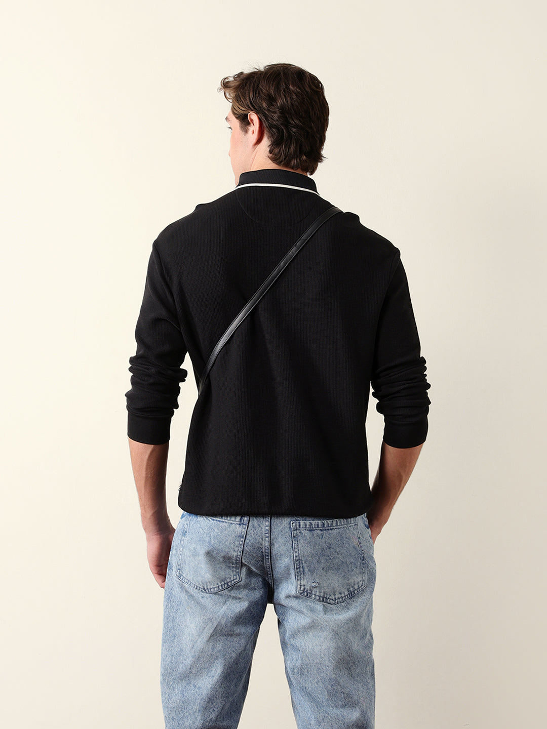 - Neck: Polo neck with a half-zip placket