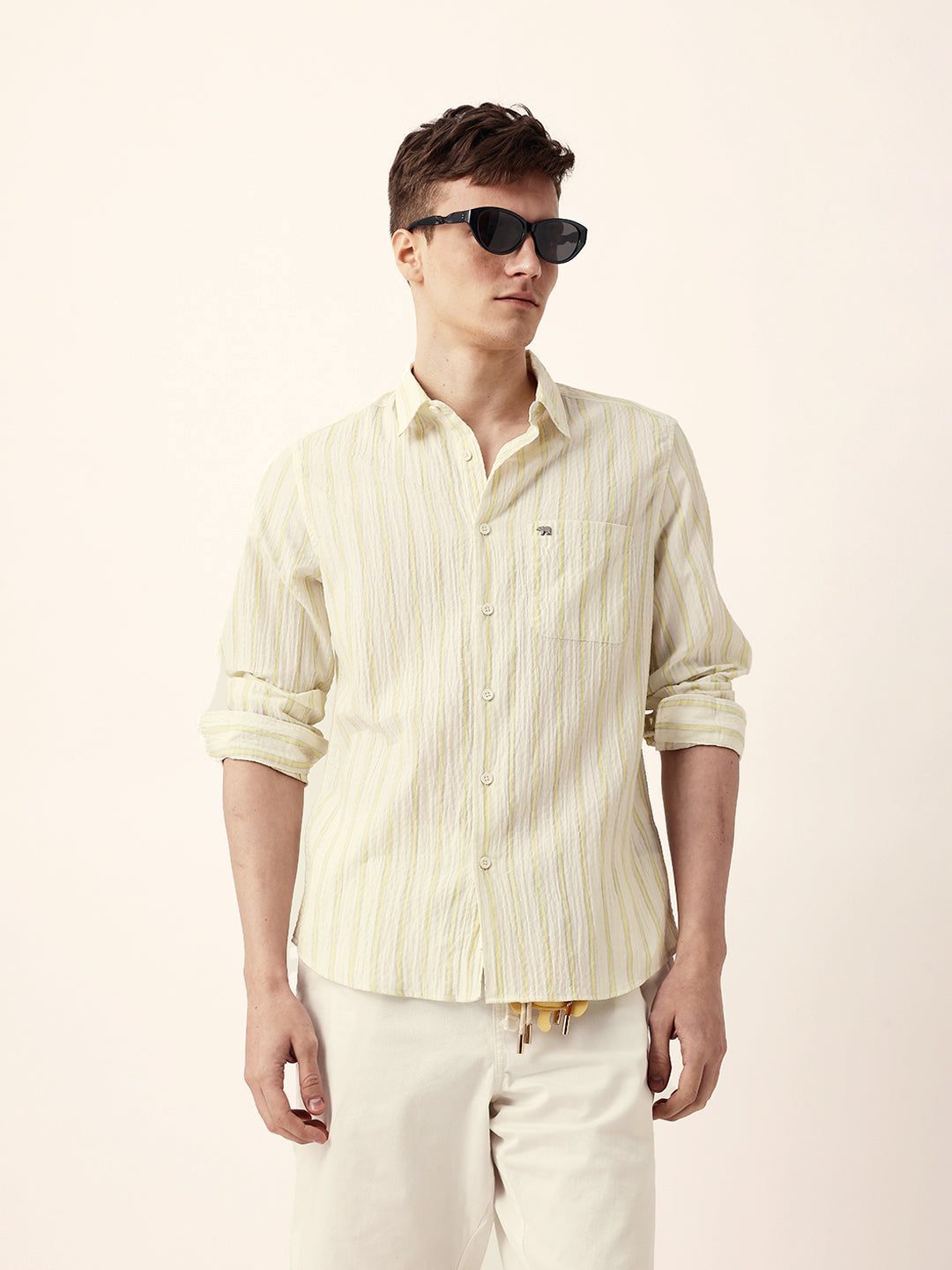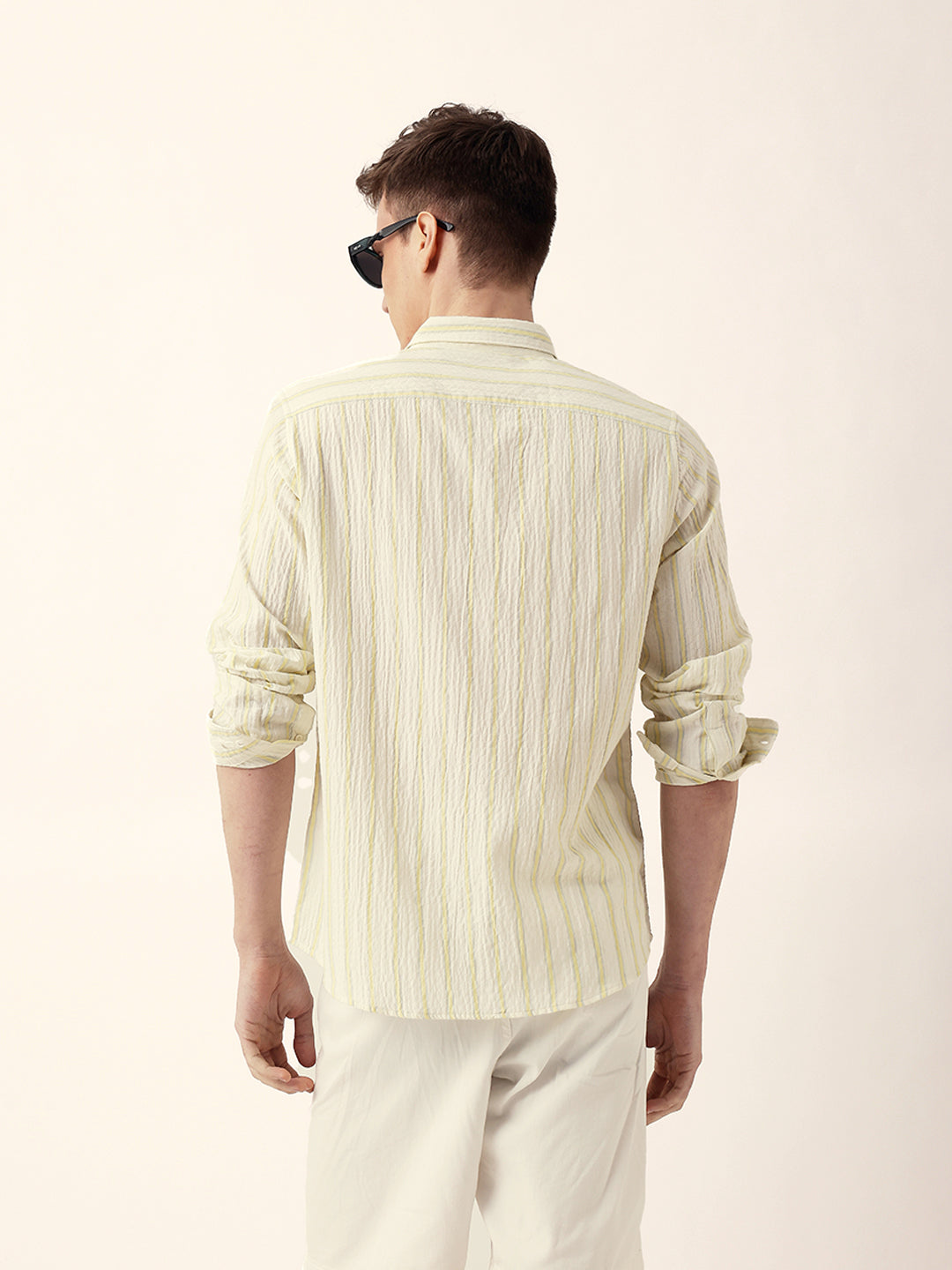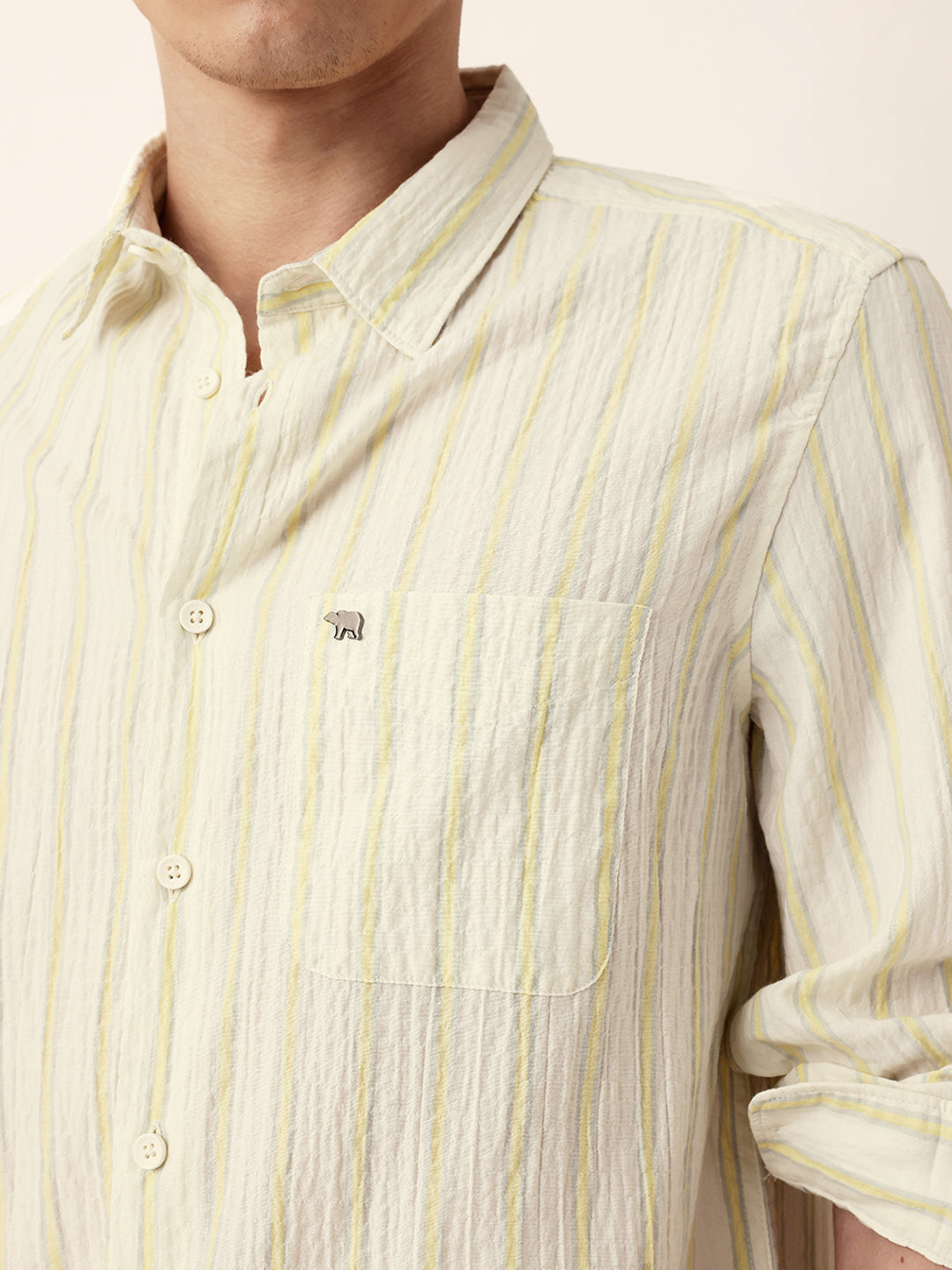 Yellow & Off-White Vertical Crinkle Stripe Regular Fit Casual Shirt