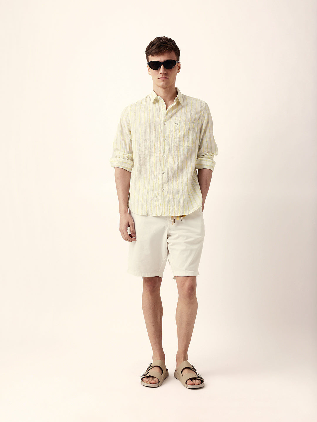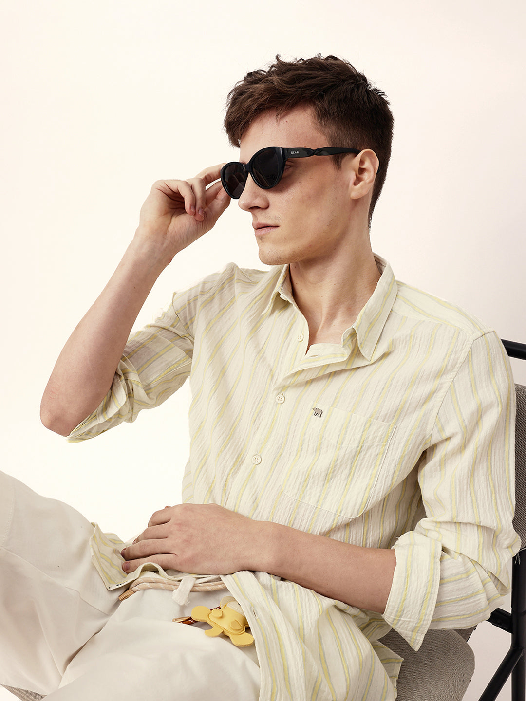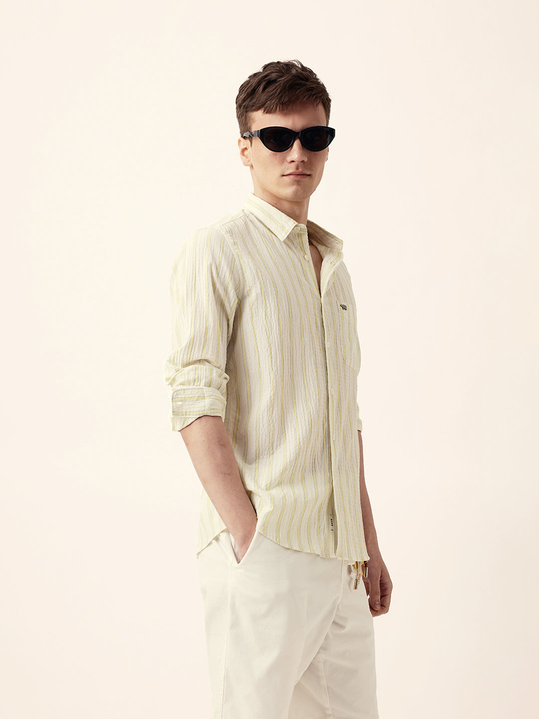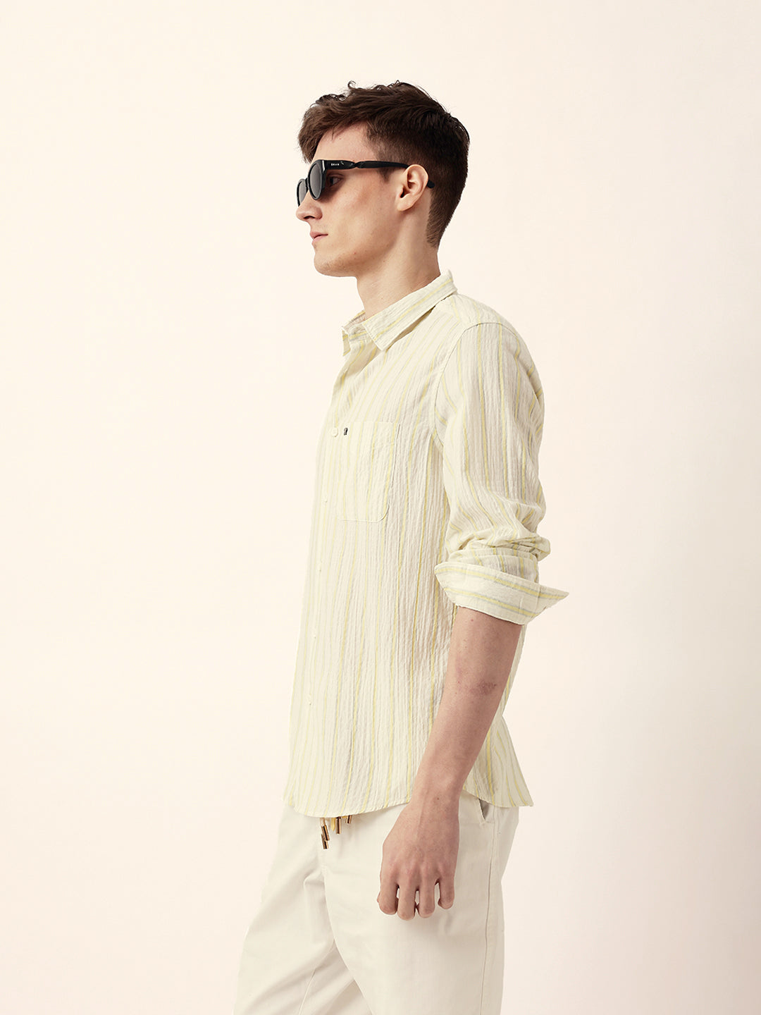 Yellow & Off-White Vertical Crinkle Stripe Regular Fit Casual Shirt
