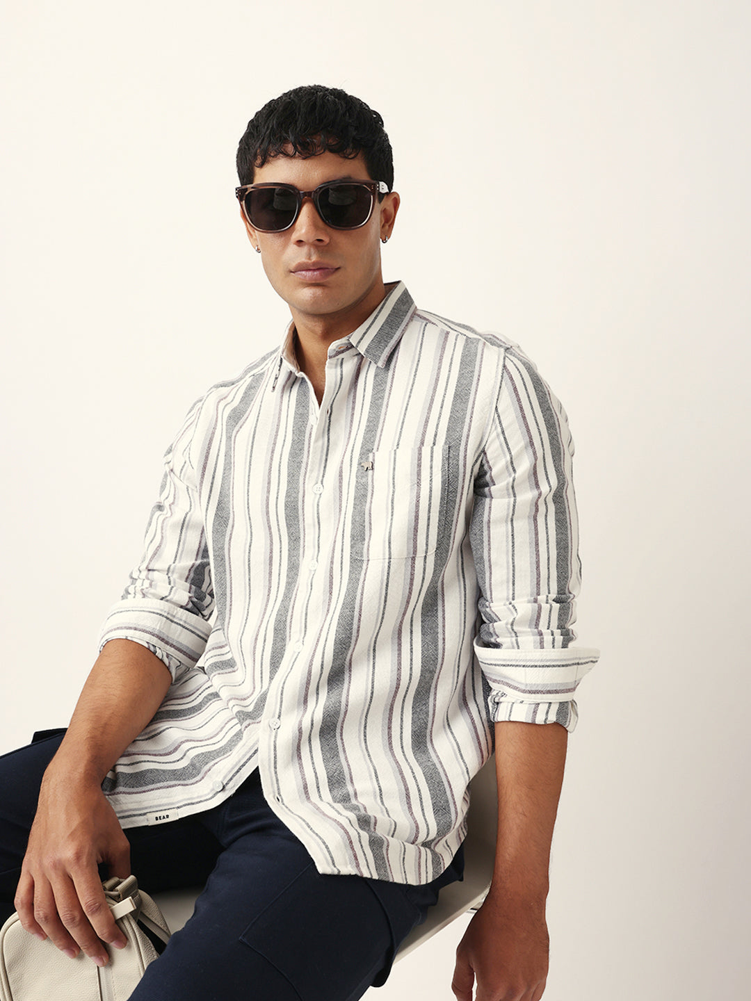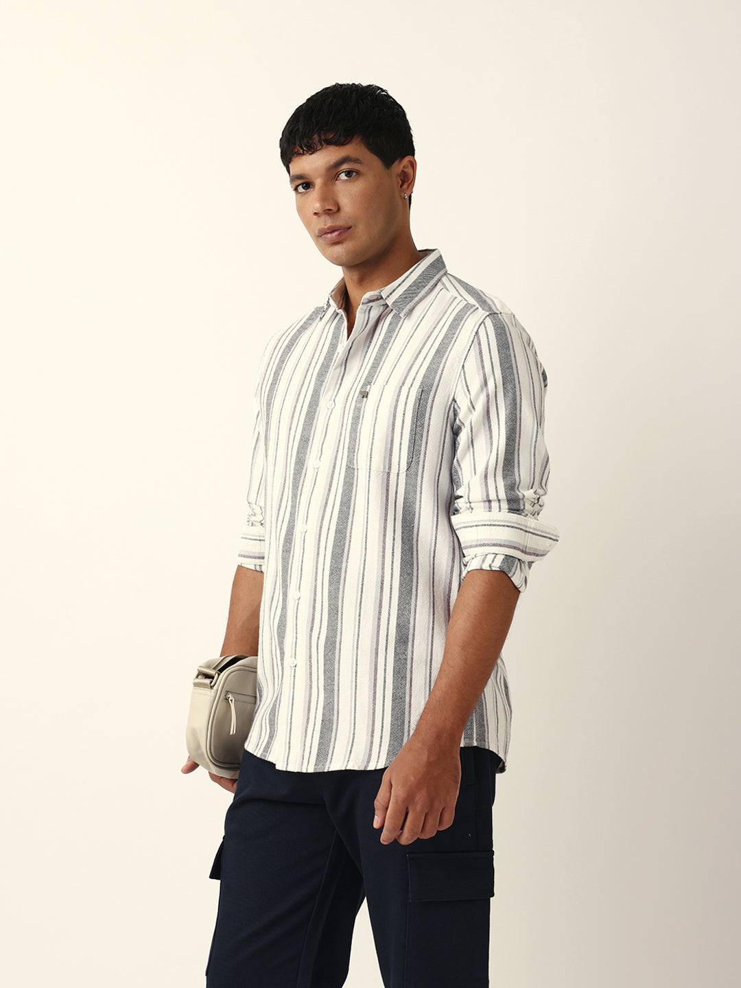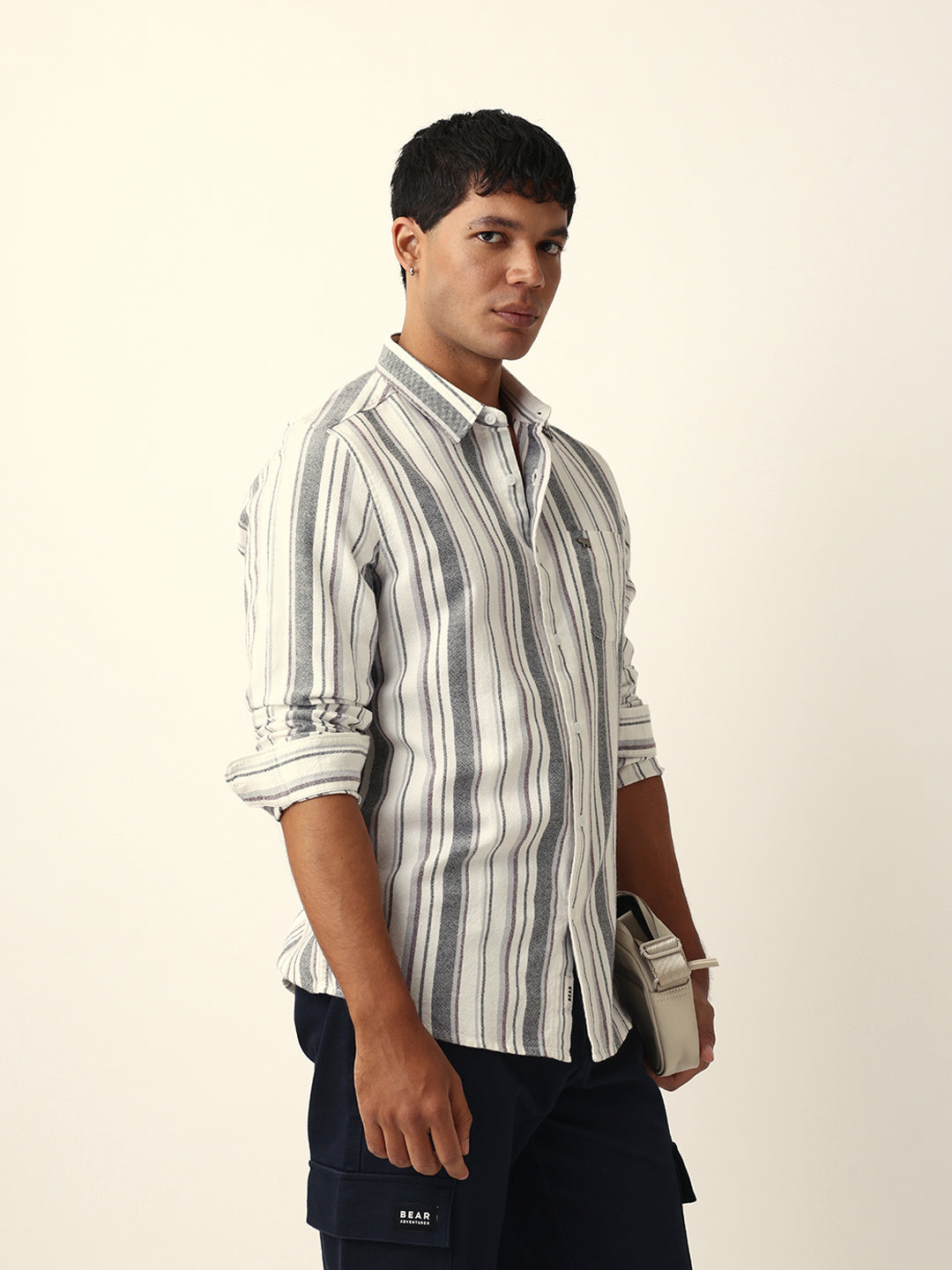 Shop White Vertical Woven Stripe Slim Fit Casual Shirt Online.
