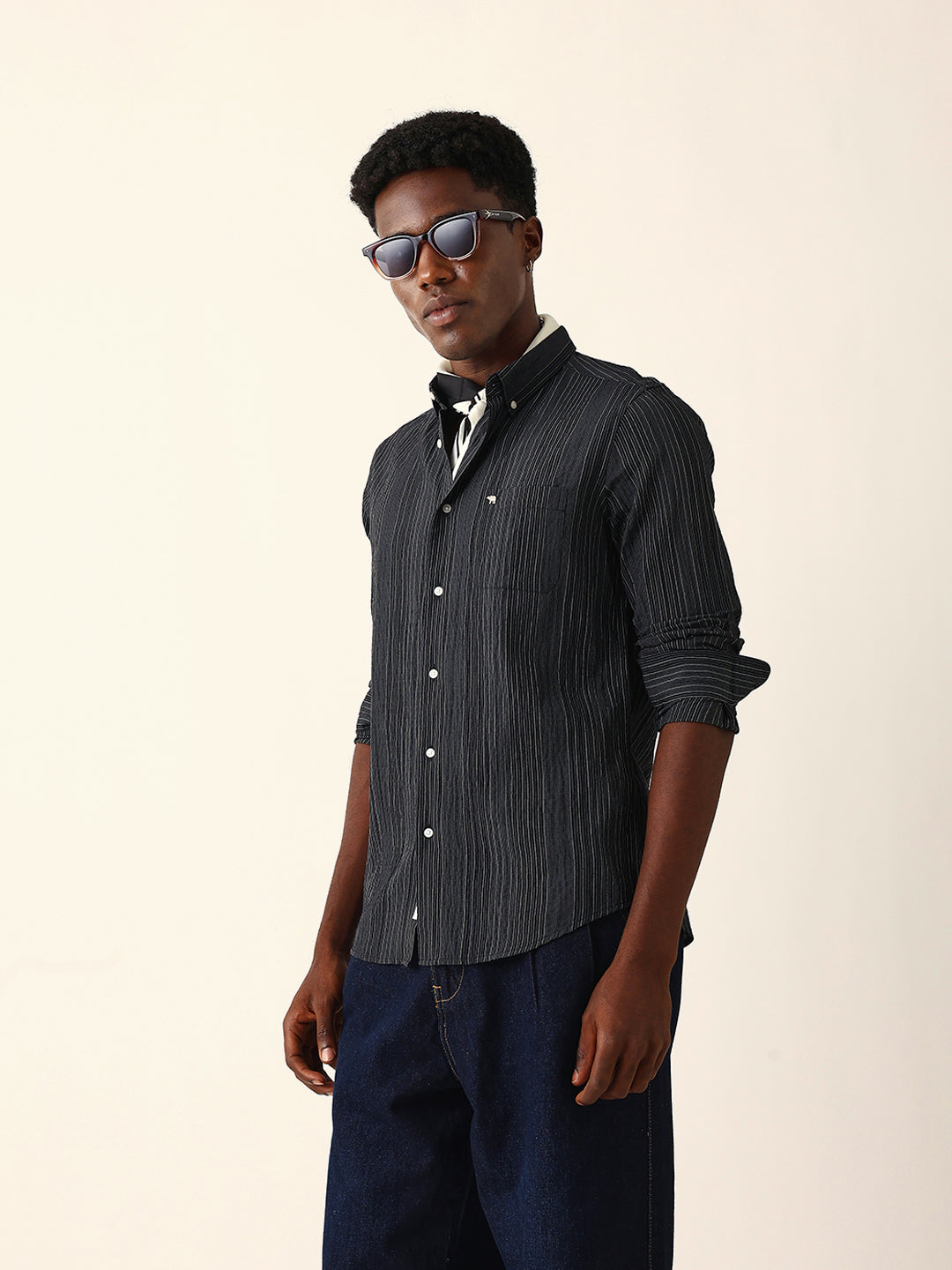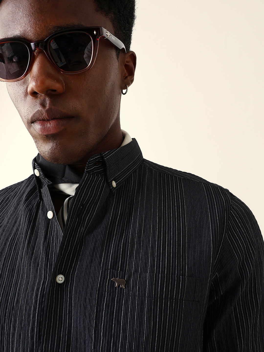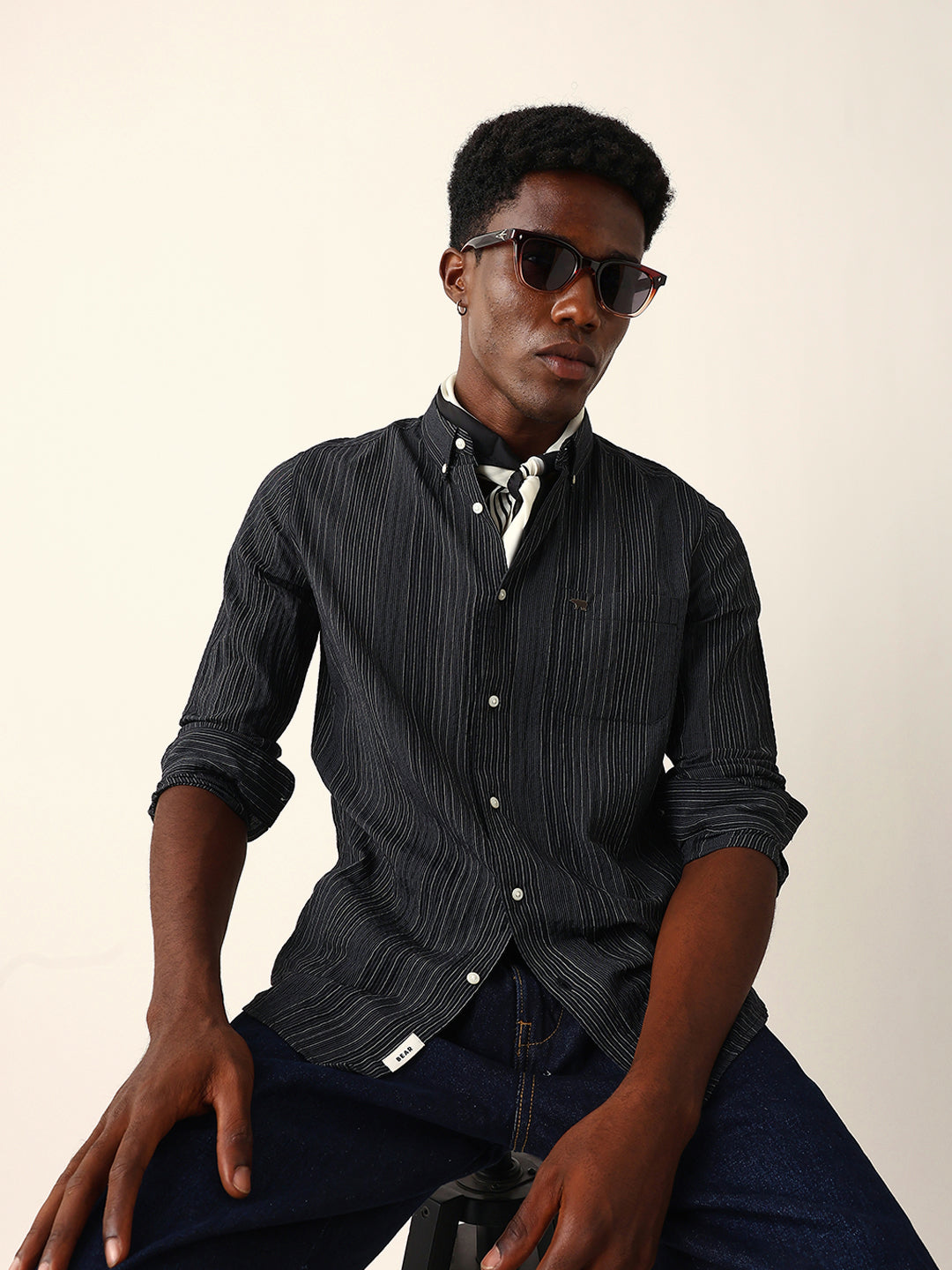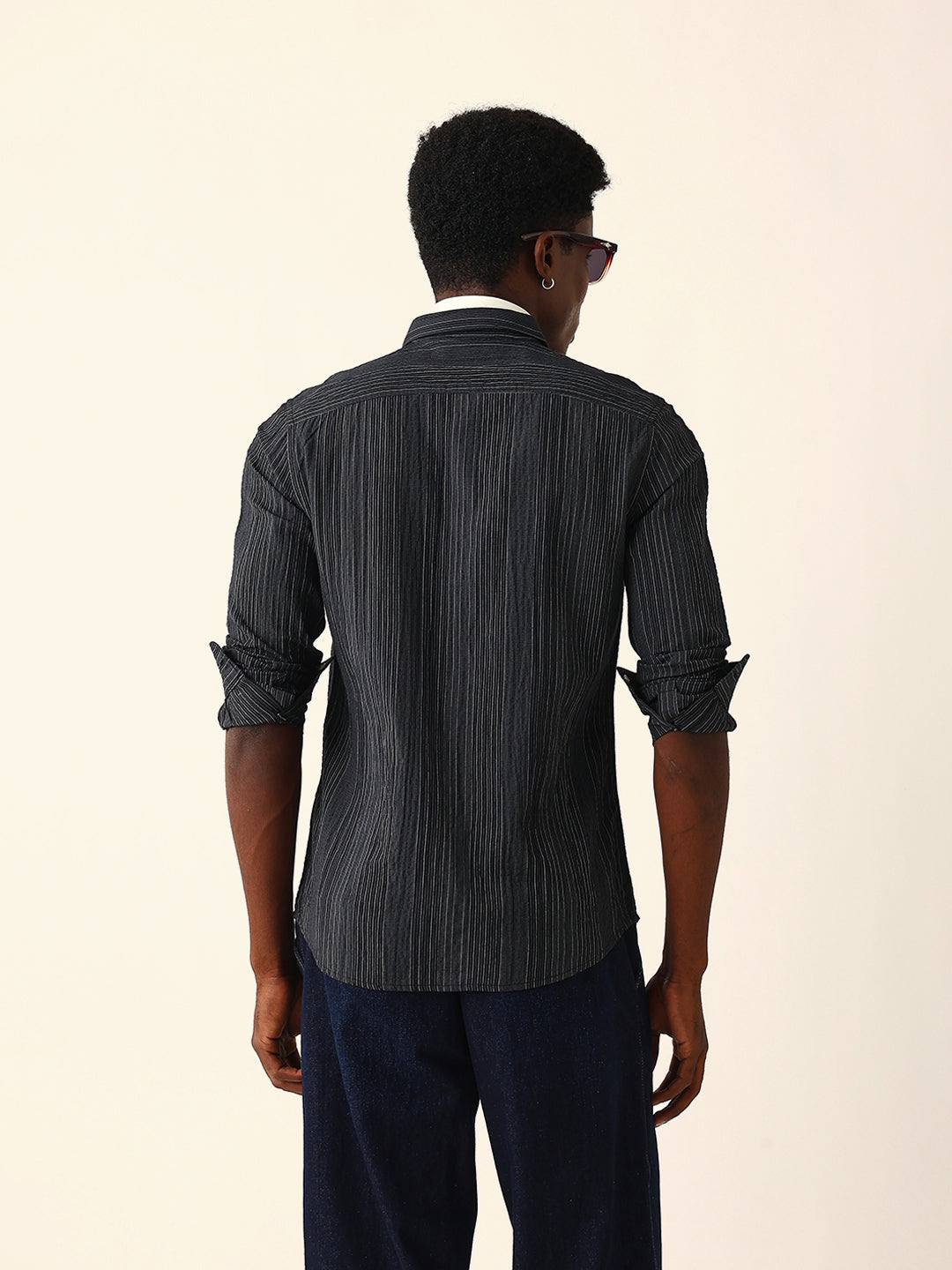 Black Woven Vertical Pinstripes Slim Fit Casual Shirt