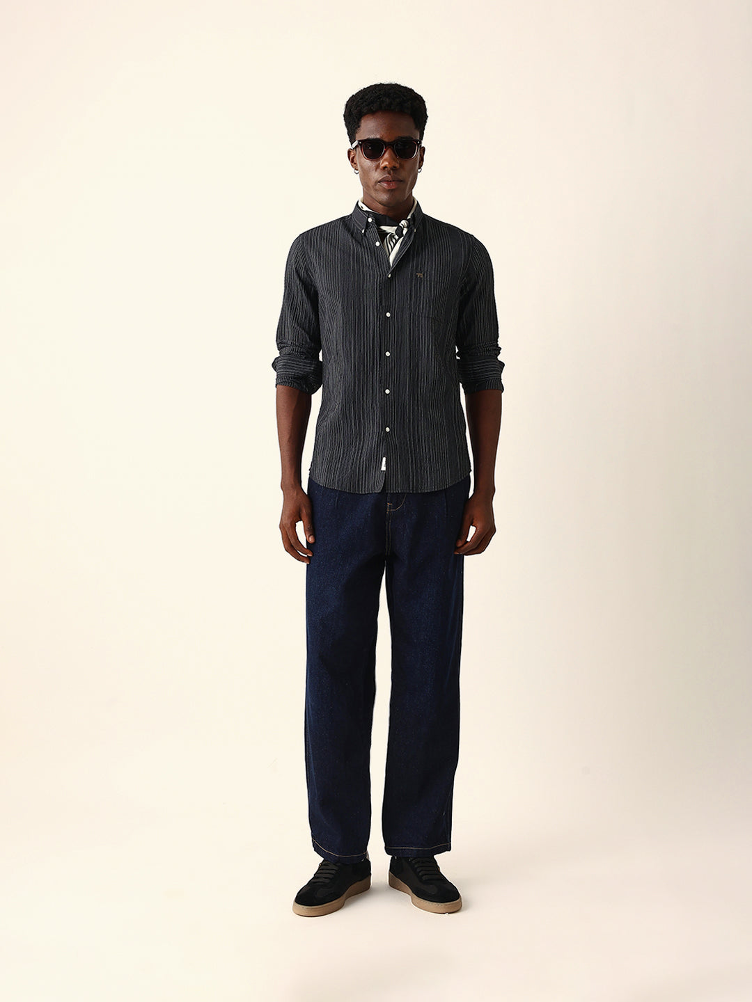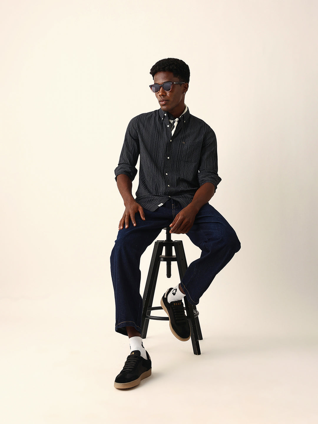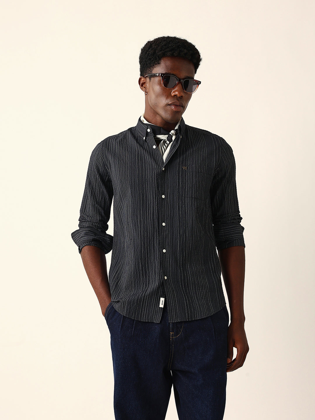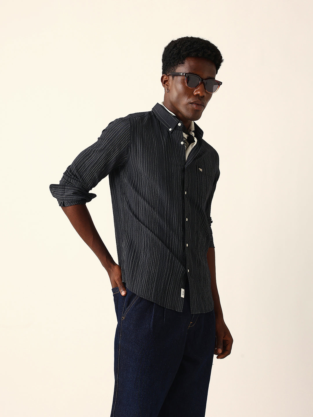 Black Woven Vertical Pinstripes Slim Fit Casual Shirt