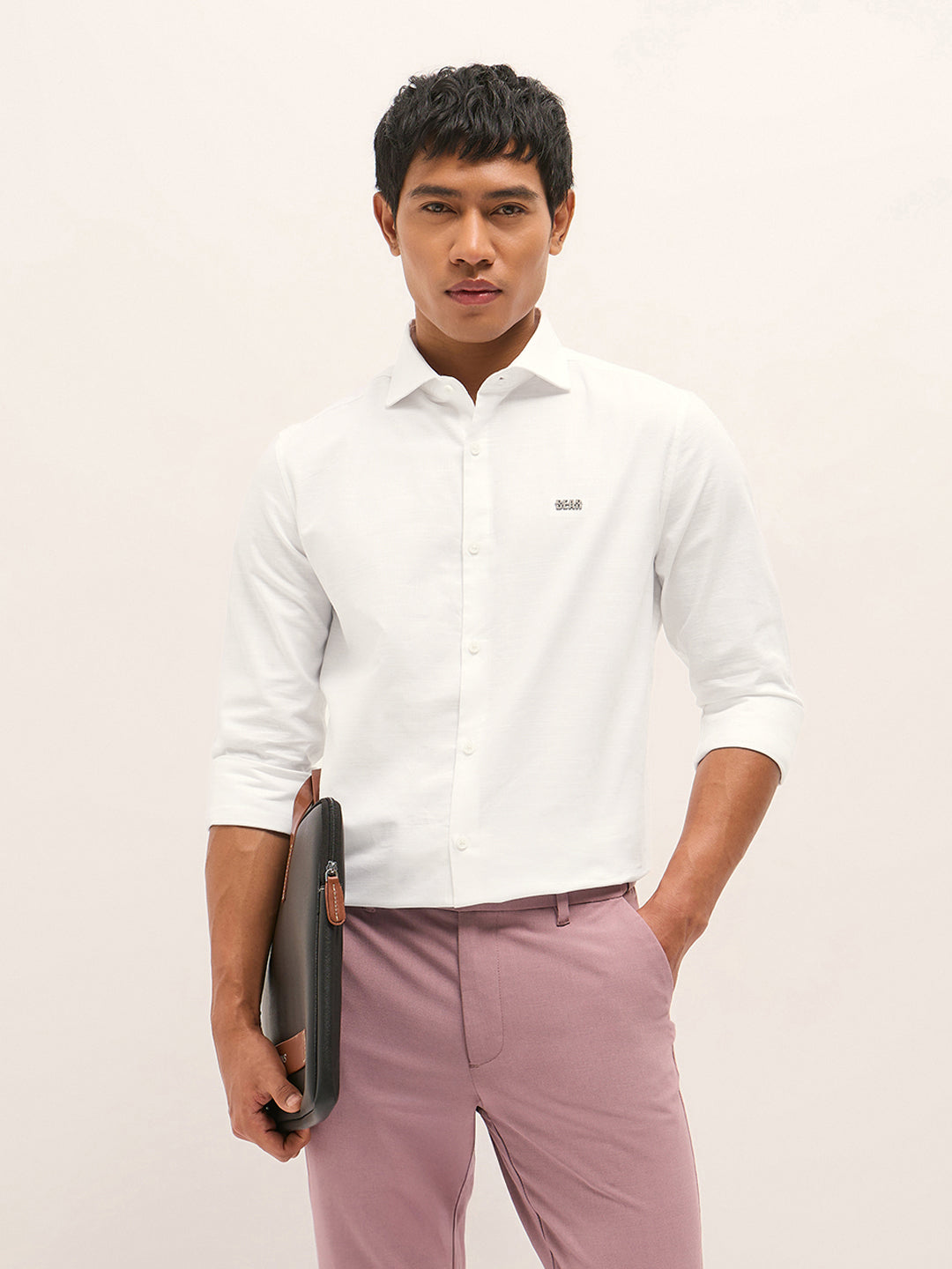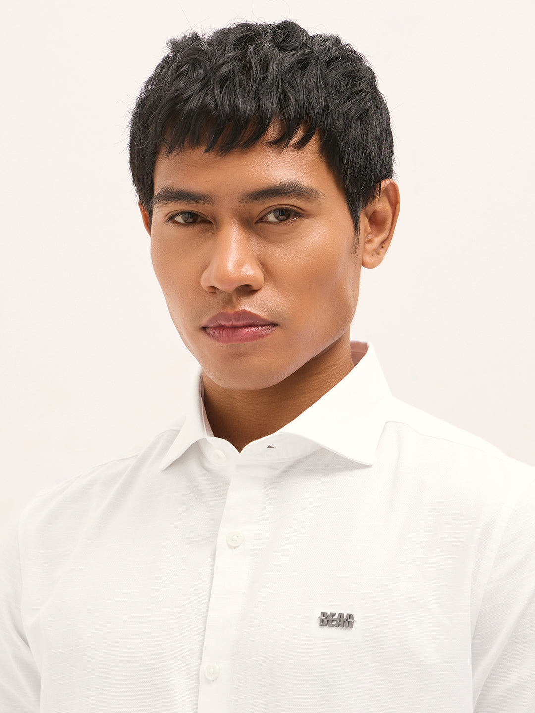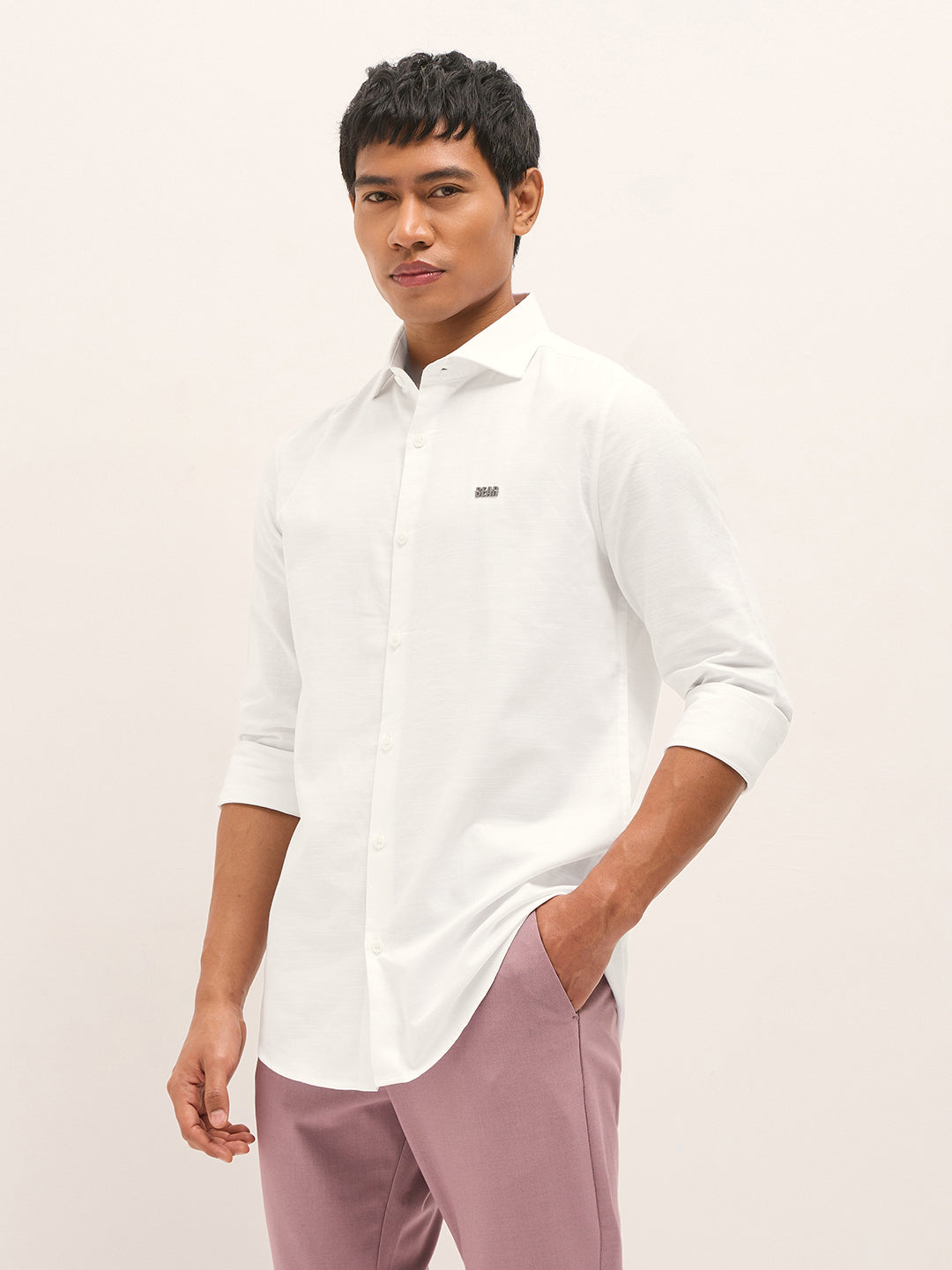 White Solid Tailored Fit Cotton Formal Shirt with Metallic Logo Branding