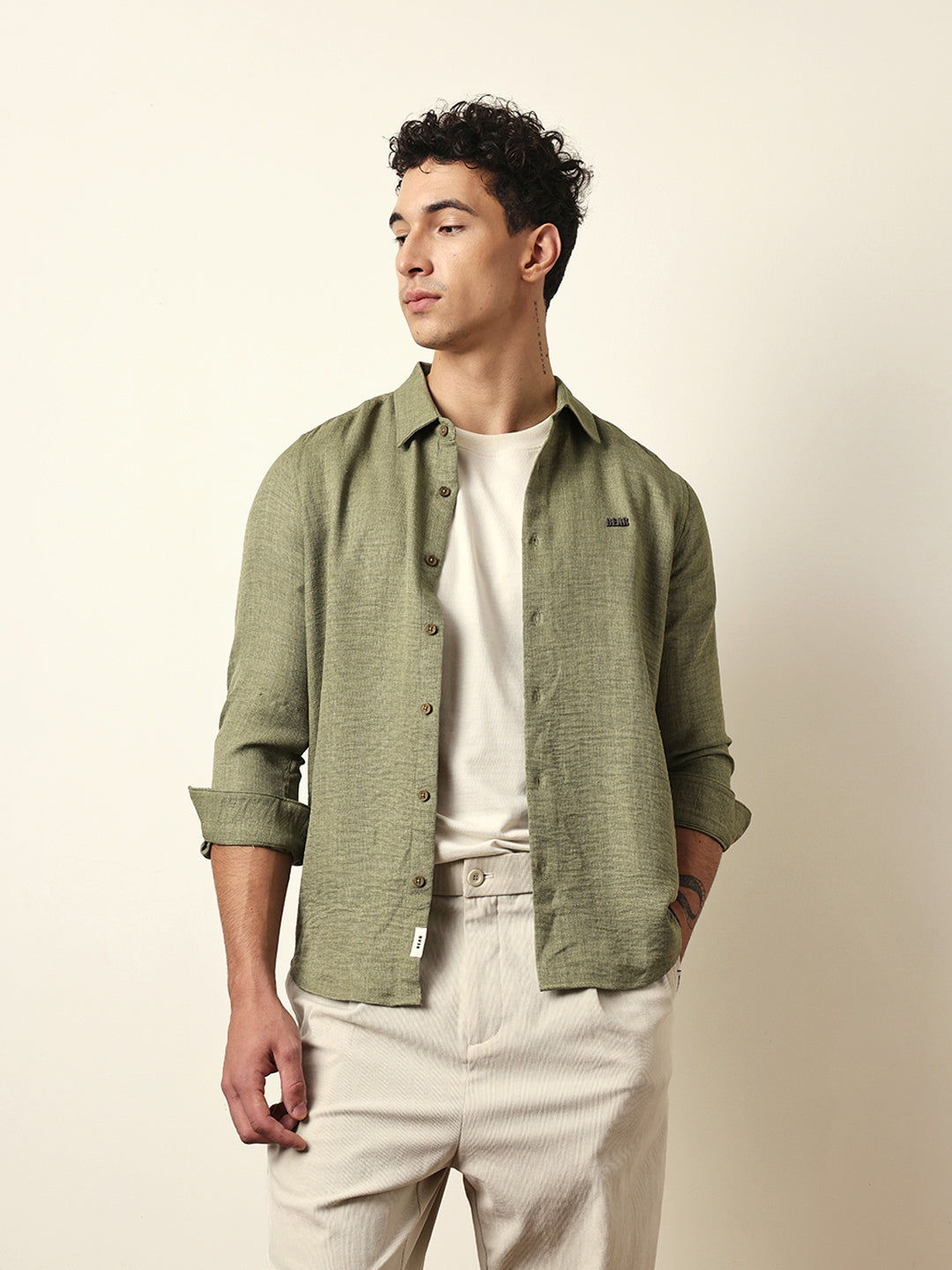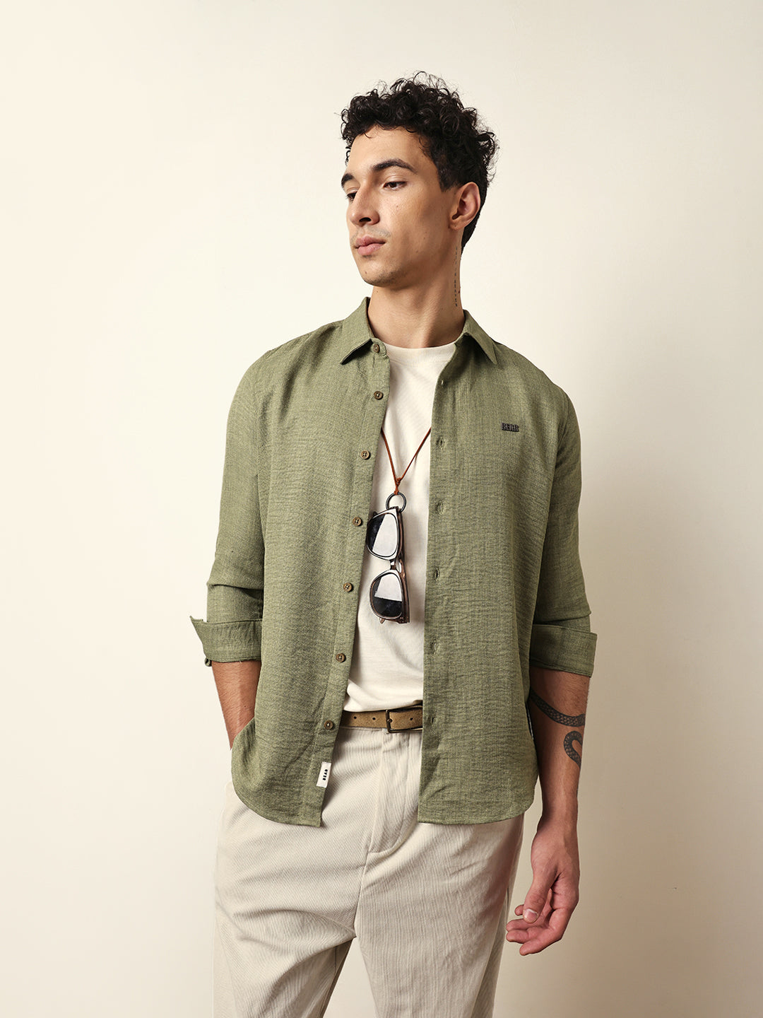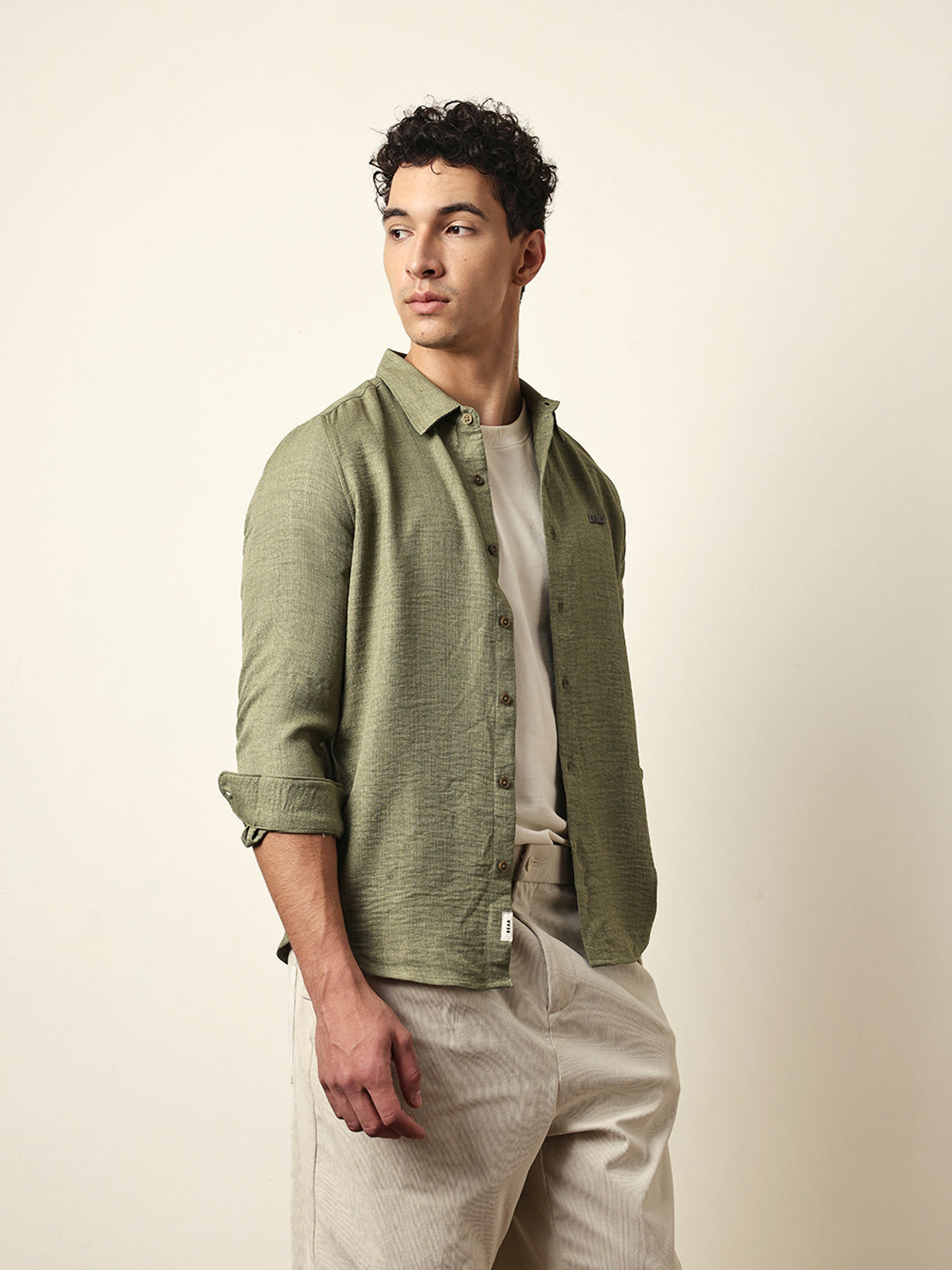 Shop Green Woven Textured Slim Fit Casual Shirt Online.