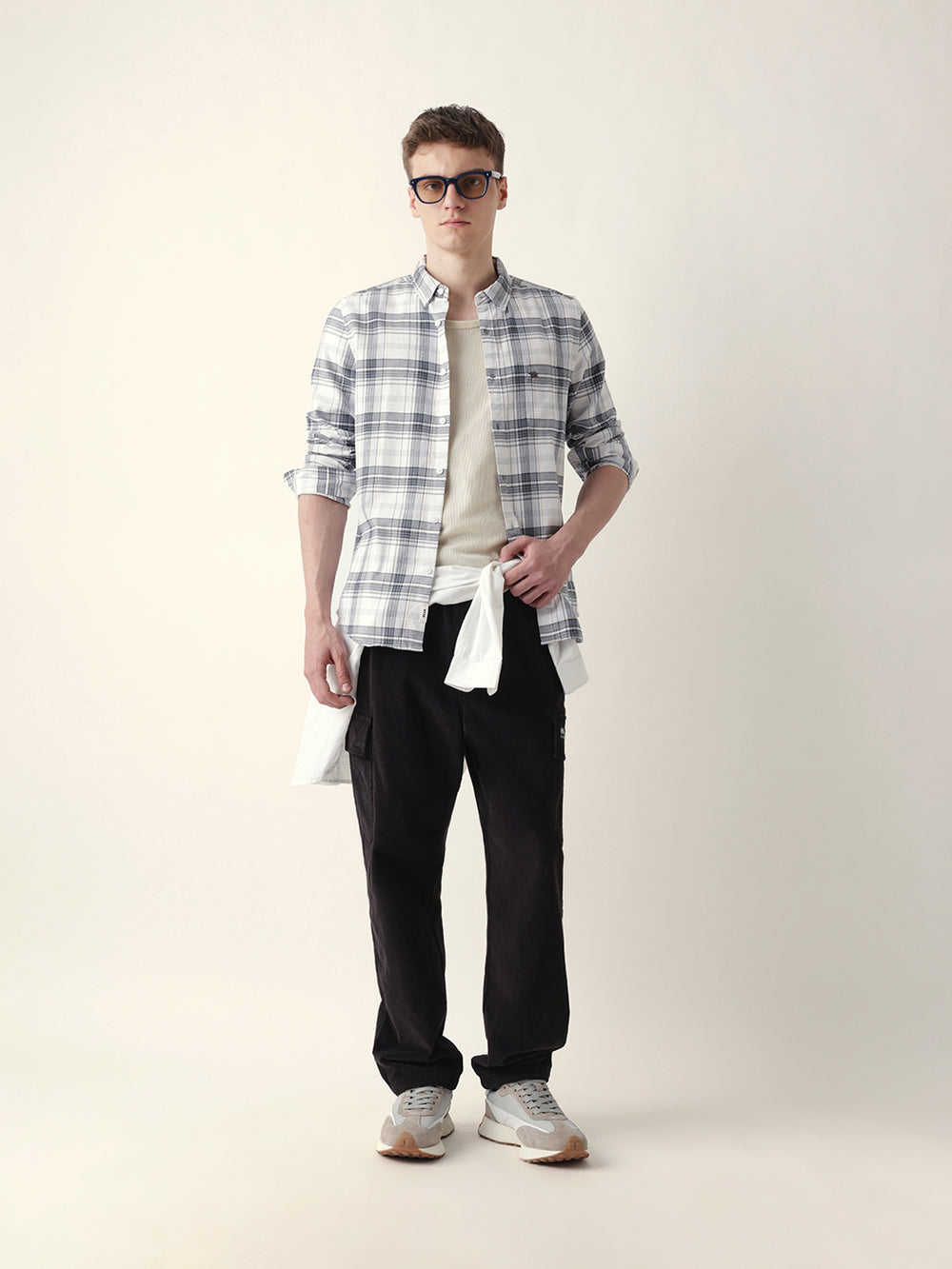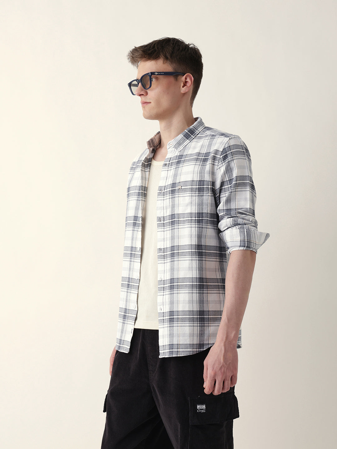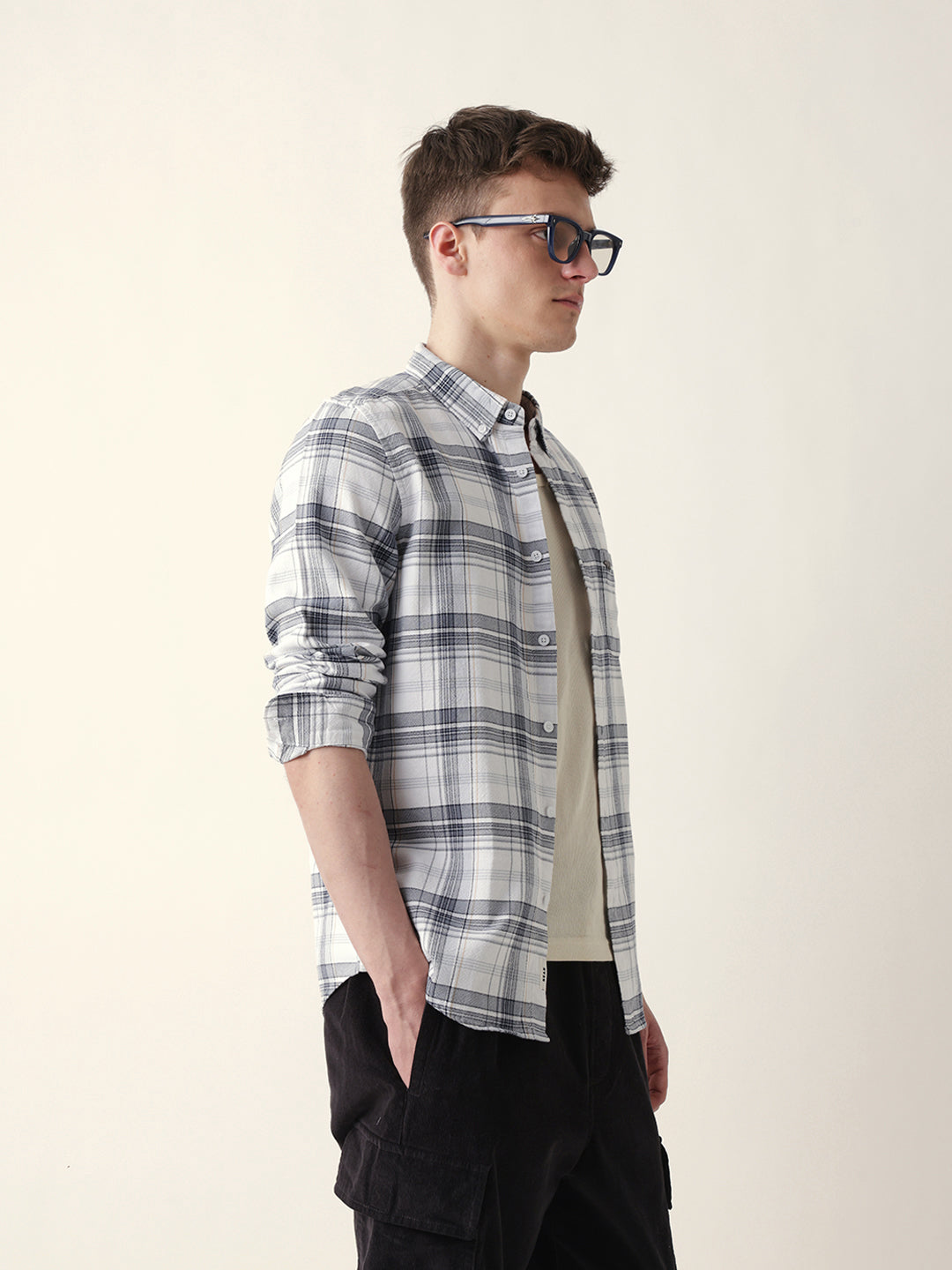 Shop White Woven Checked Slim Fit Casual Shirt Online.